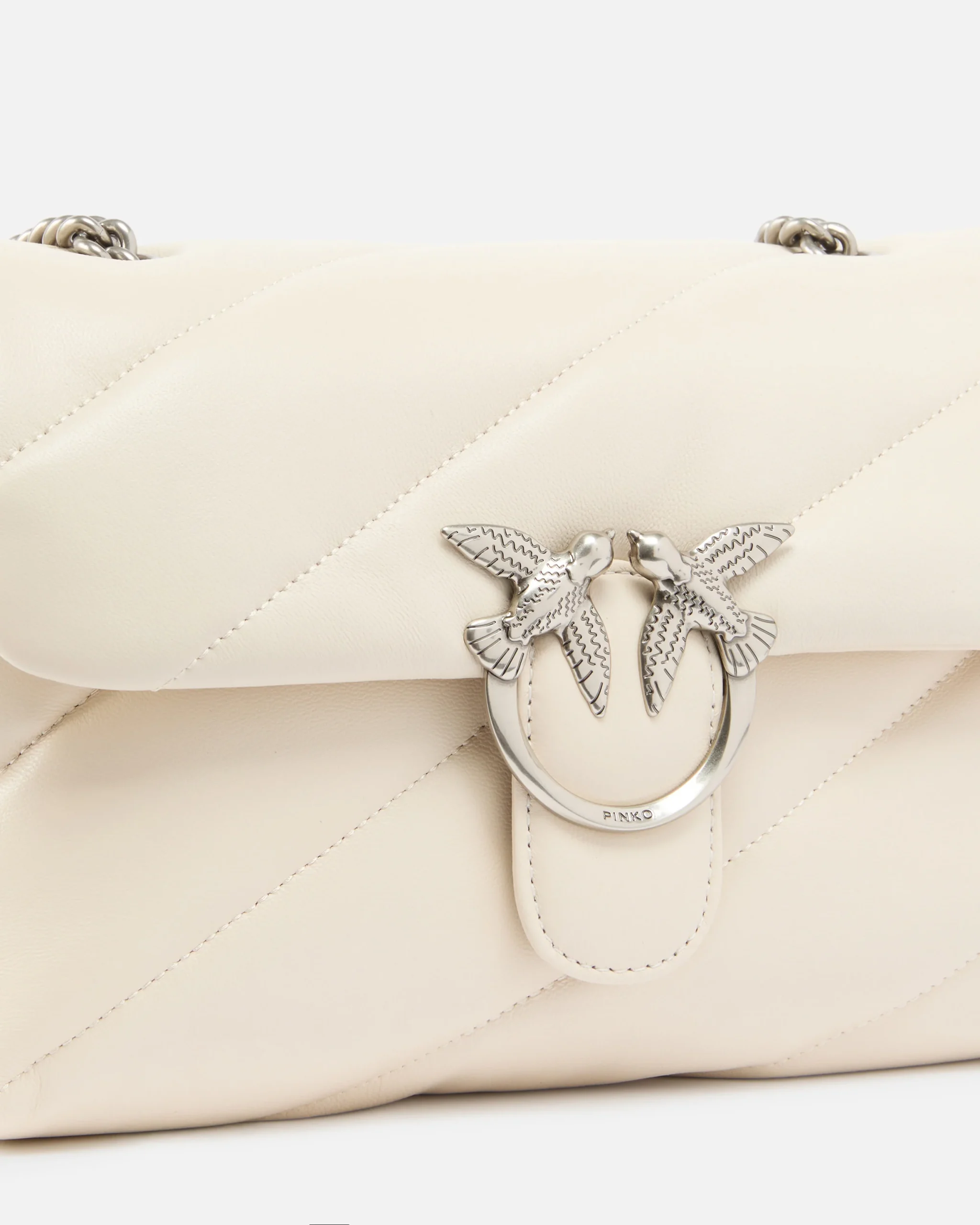 Τσάντα Classic Love Bag Puff από μαλακό δέρμα nappa με maxi, λοξό καπιτονέ σχέδιο. Το κλείσιμο ολοκληρώνεται με την εμβληματική μεταλλική αγκράφα Love Birds Diamond Cut. Το εσωτερικό είναι φοδραρισμένο με ύφασμα από μικροΐνες με σουέτ υφή και διαθέτει διαχωριστικό που κλείνει με φερμουάρ και τσέπη στο τοίχωμα. Το λουρί συνδυάζει την κλασική στρογγυλή μεταλλική αλυσίδα με το πρακτικό λουράκι από δέρμα nappa.