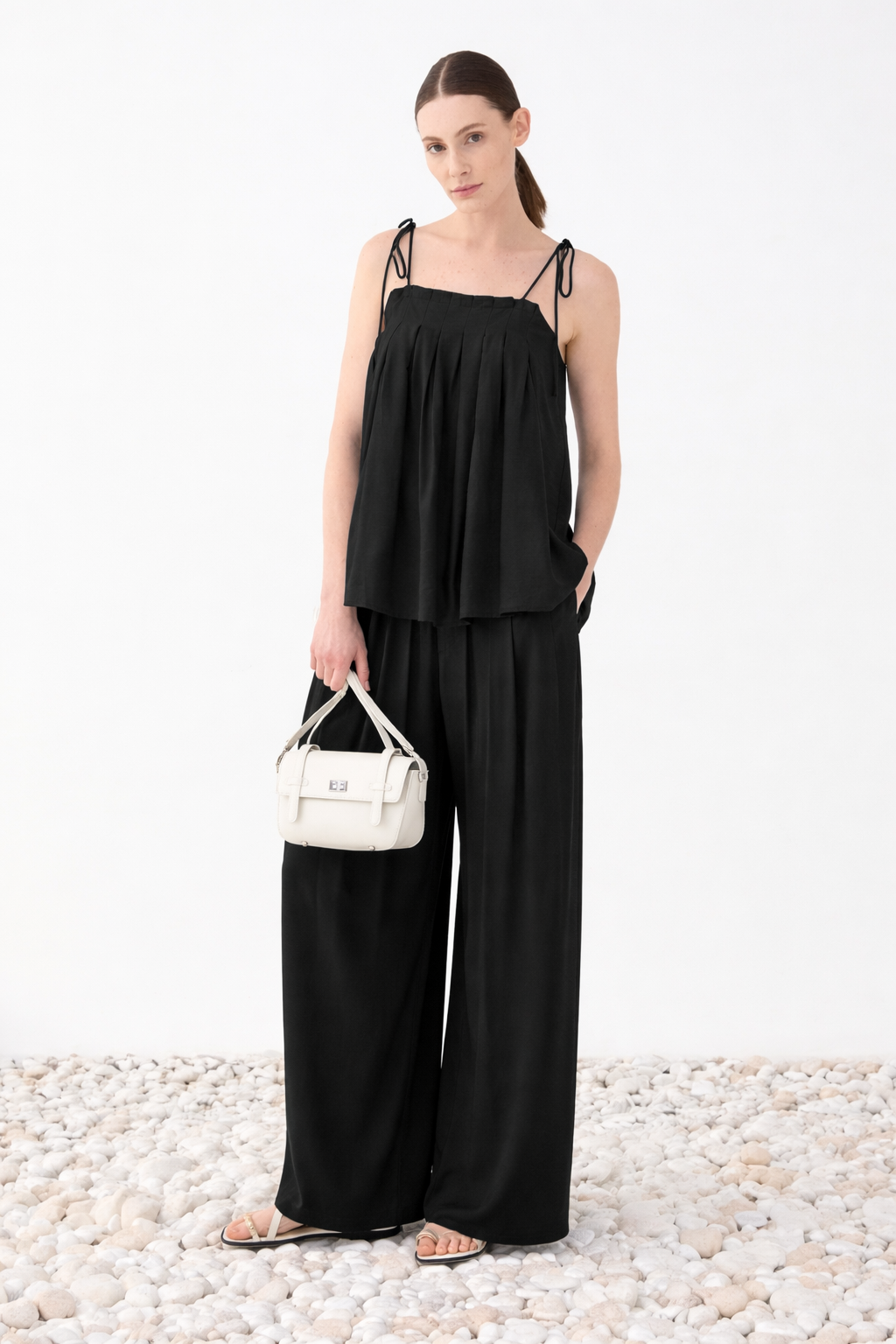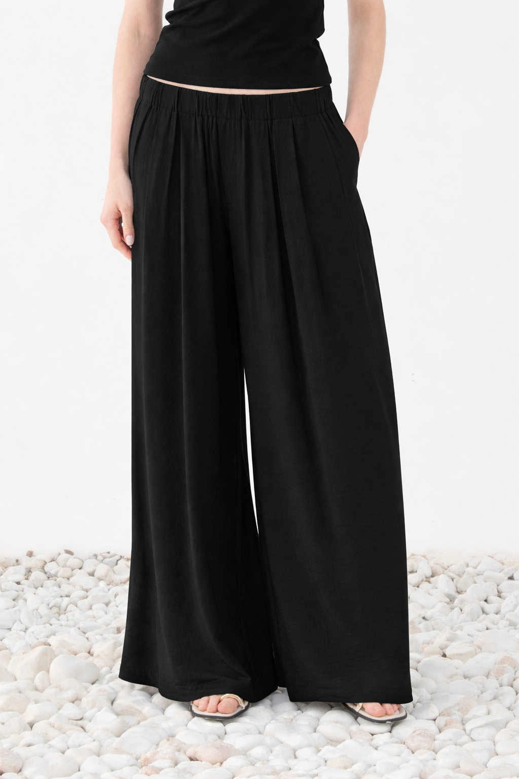 Εντυπωσιακό παντελόνι palazzo σε διαχρονικό μαύρο χρώμα που συνδυάζει άνεση και κομψότητα. Η ψηλόμεση γραμμή με ελαστική μέση προσφέρει σταθερή και άνετη εφαρμογή, ενώ το φαρδύ, ρευστό τελείωμα χαρίζει κομψή κίνηση και επιμηκύνει οπτικά τη σιλουέτα.