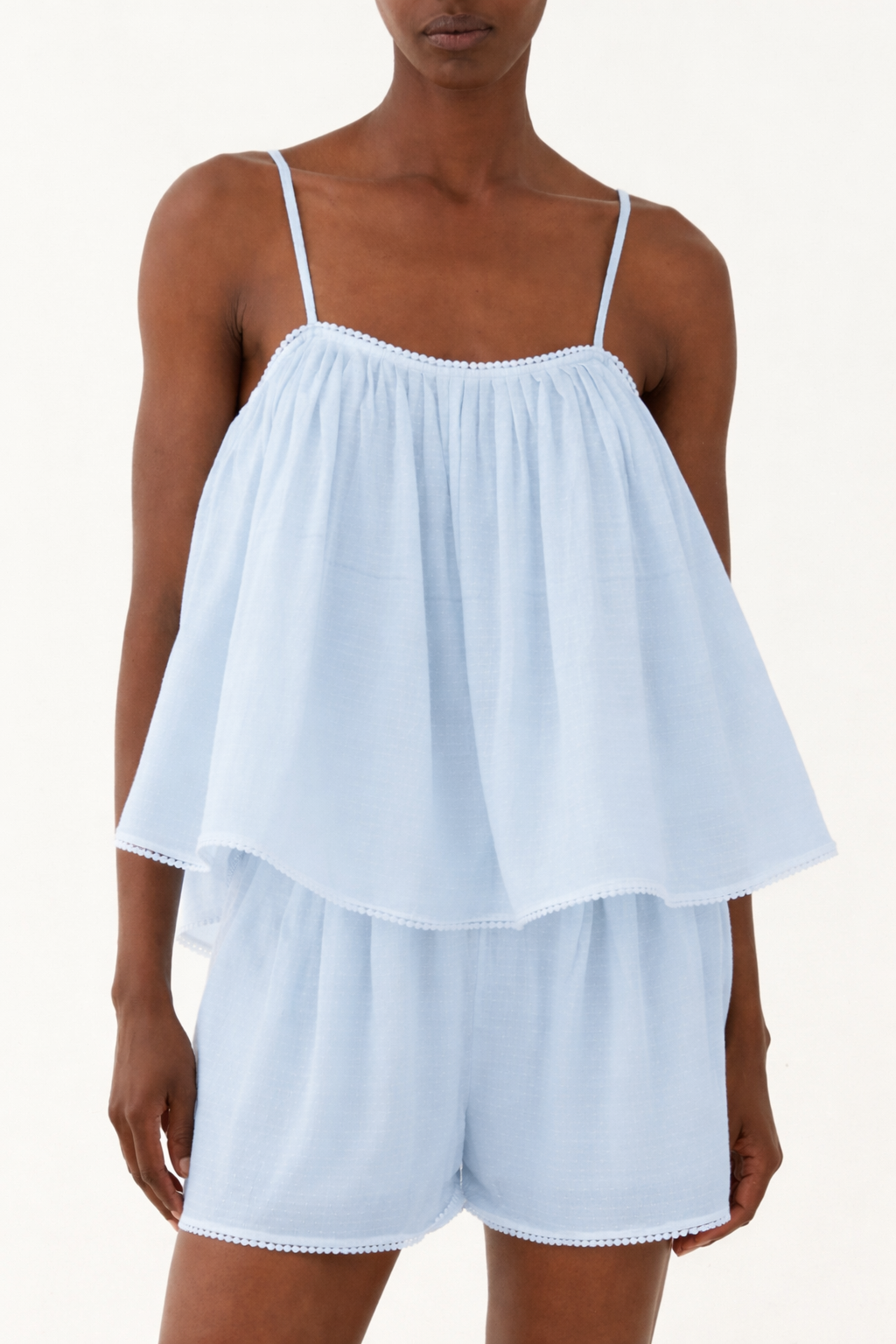 Η απαλή γαλάζια απόχρωση χαρίζει φρεσκάδα και ρομαντικό χαρακτήρα, ενώ η διακριτική λεπτομέρεια στο τελείωμα ολοκληρώνει το minimal καλοκαιρινό look. Συνδυάζεται εύκολα με το αντίστοιχο baby blue τοπ για ολοκληρωμένο σετ ή με λευκά tops και σανδάλια για resort & νησιώτικες εμφανίσεις.