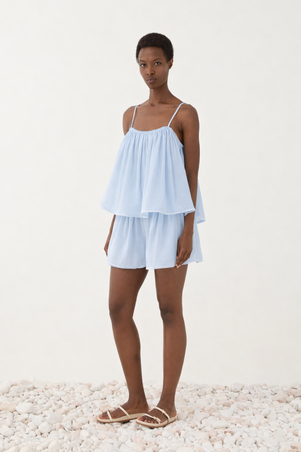 Γυναικείο baby blue καλοκαιρινό σορτσάκι με αέρινη γραμμή και ελαστική μέση για άνετη εφαρμογή. Κατασκευασμένο από ελαφρύ, δροσερό ύφασμα, προσφέρει φυσική κίνηση και ιδανική αίσθηση για τις ζεστές ημέρες του καλοκαιριού.
