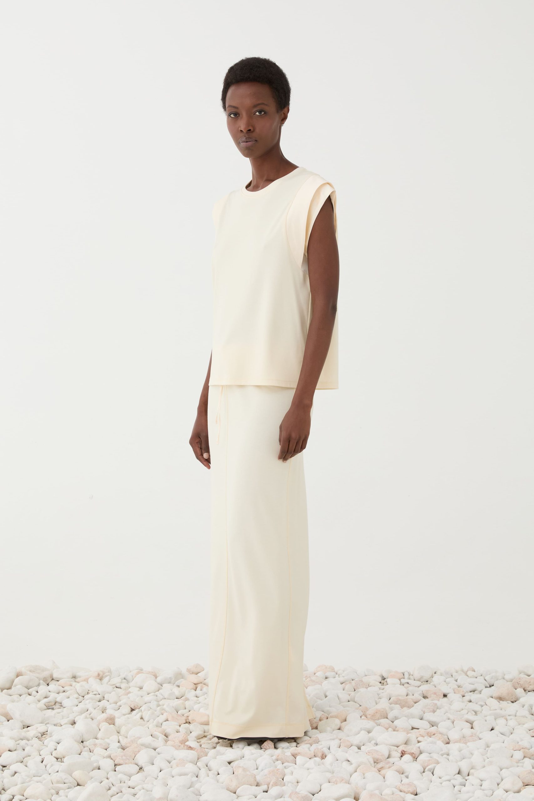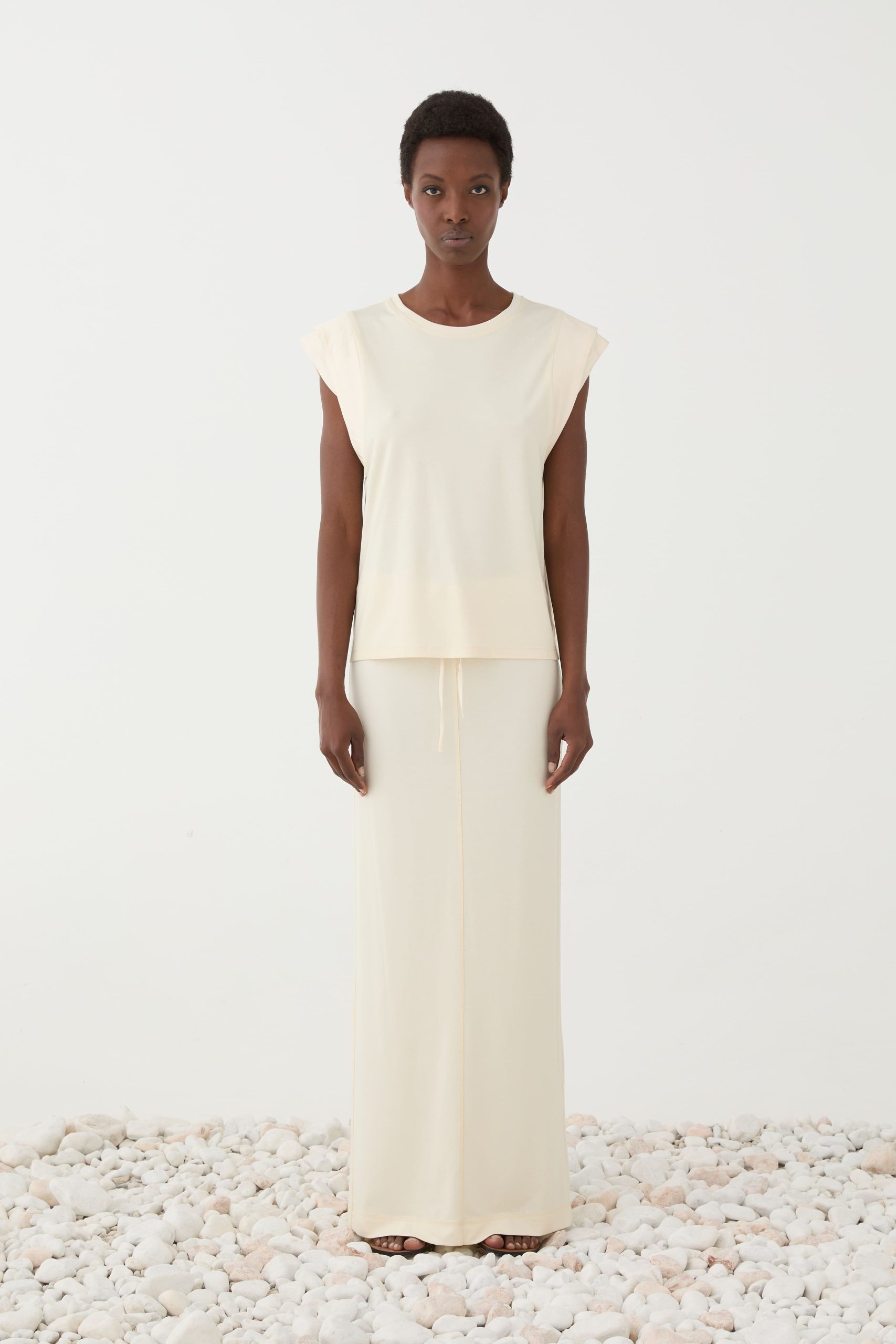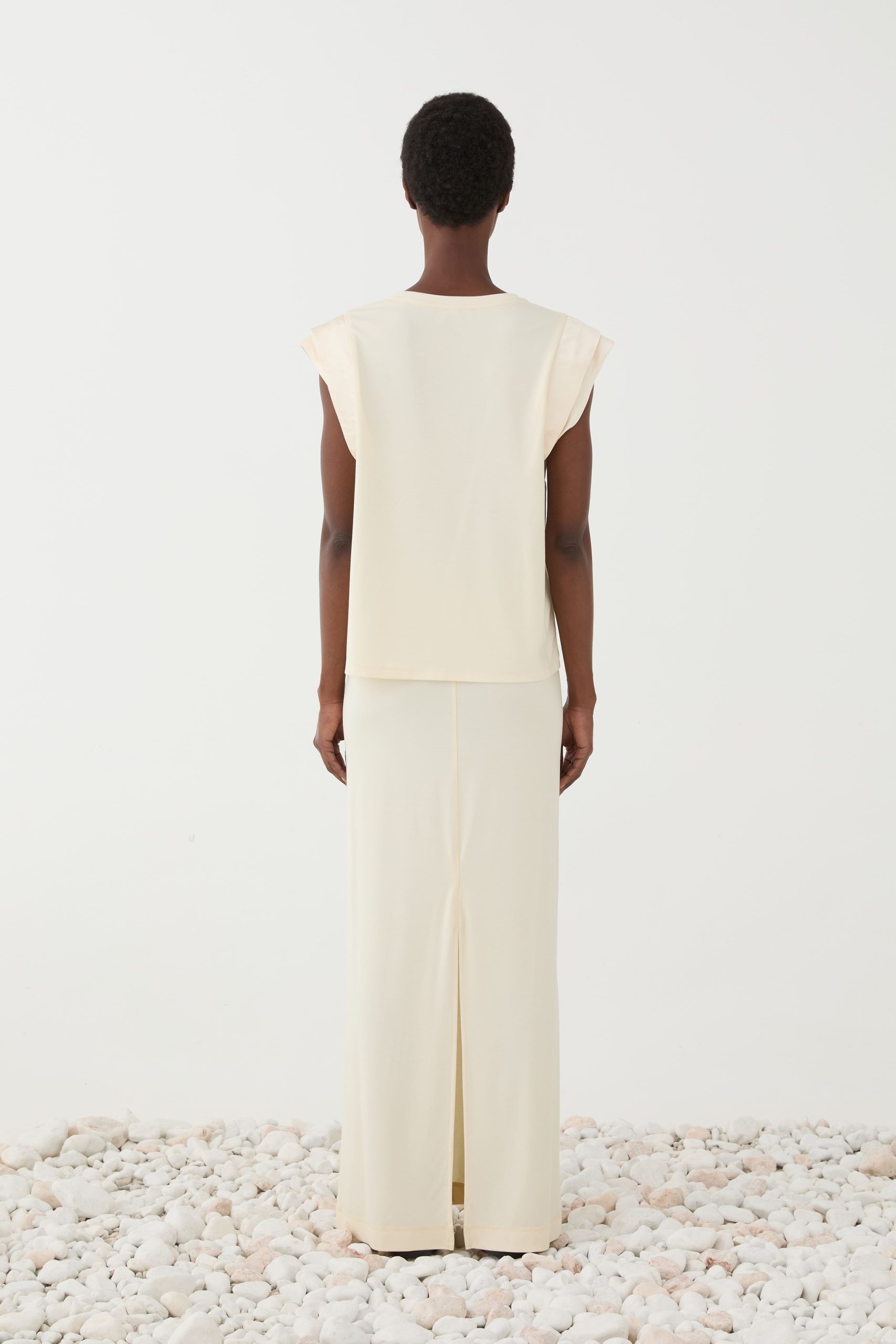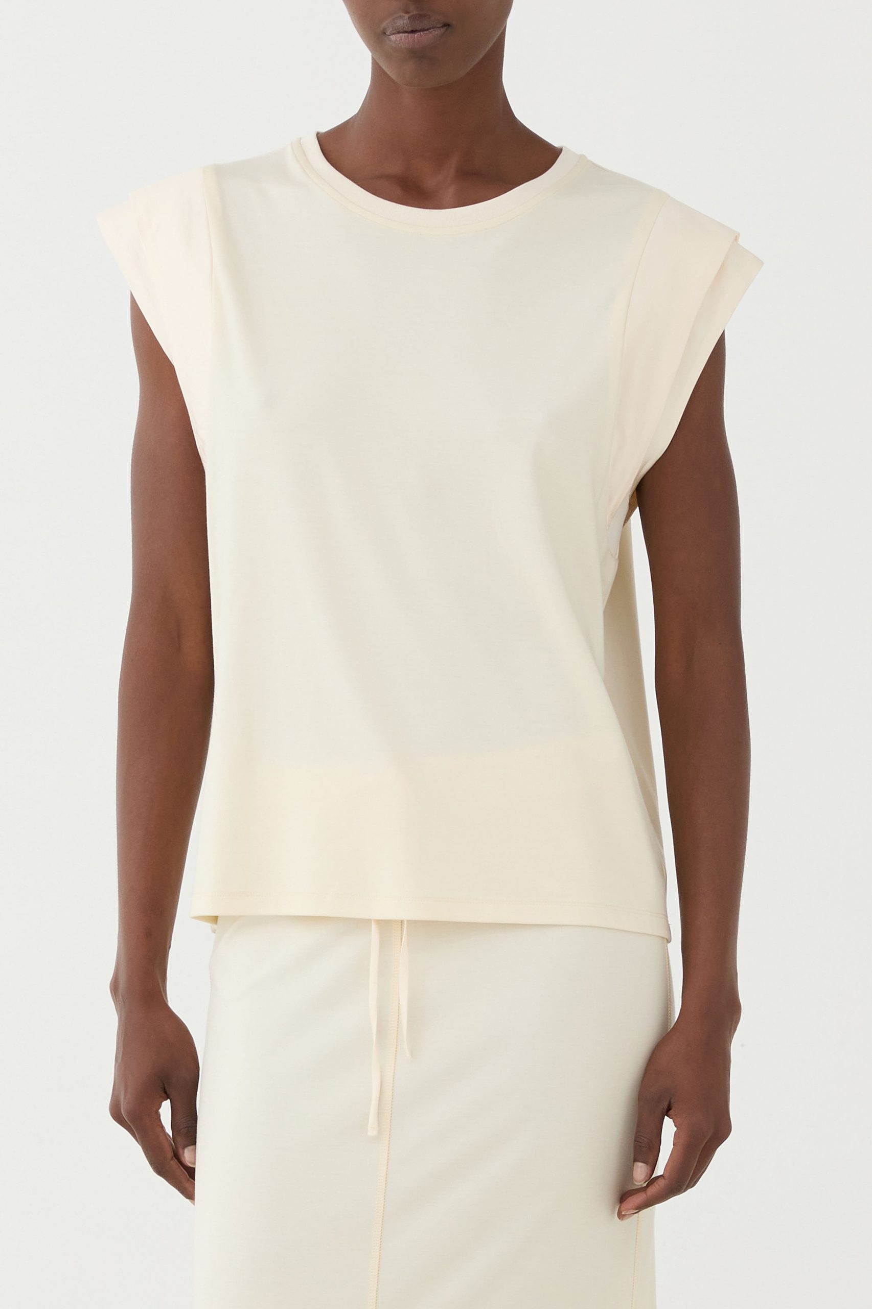Minimal αμάνικη μπλούζα σε απαλή εκρού απόχρωση με διακριτικά δομημένους ώμους που χαρίζουν σύγχρονη, καθαρή σιλουέτα.