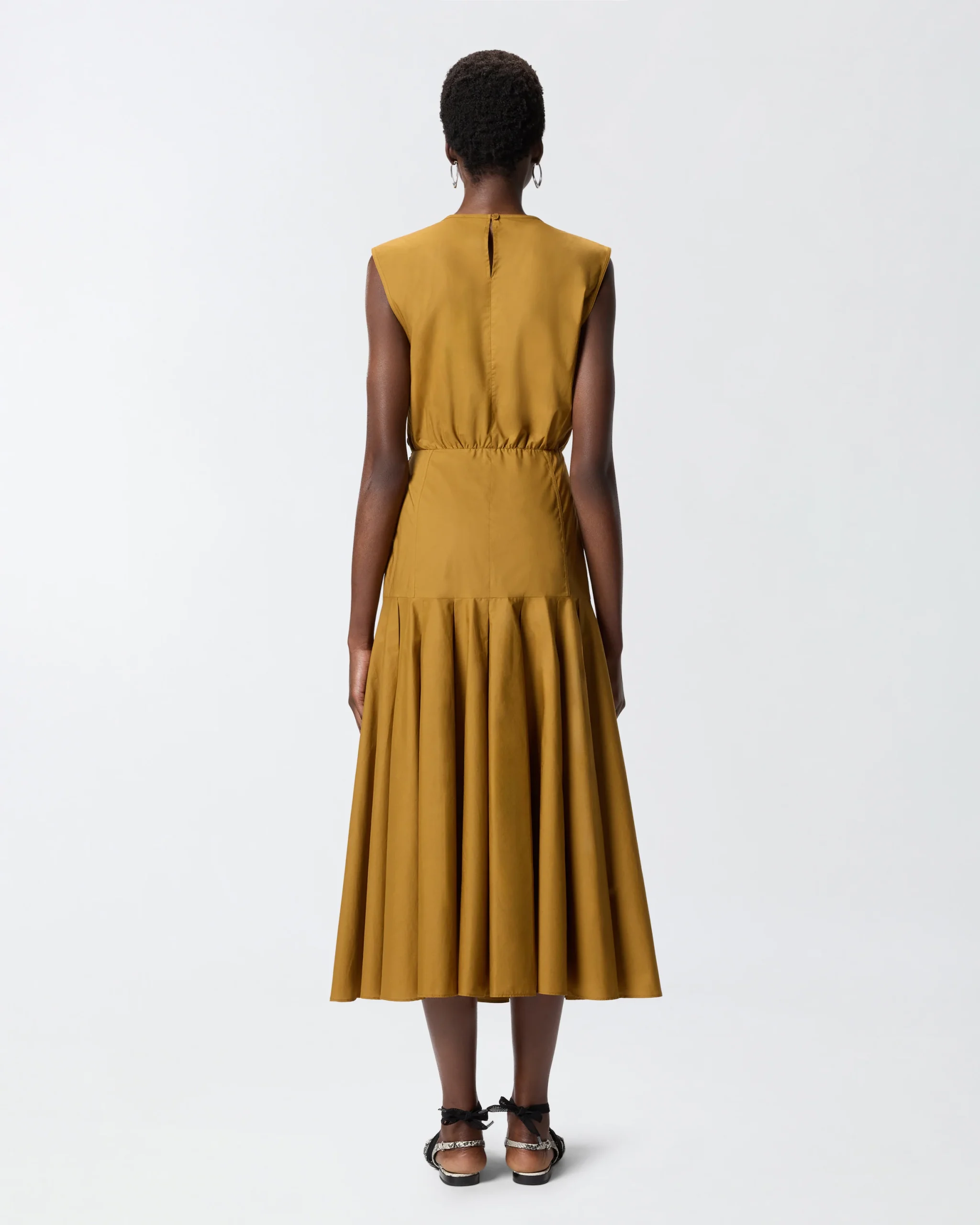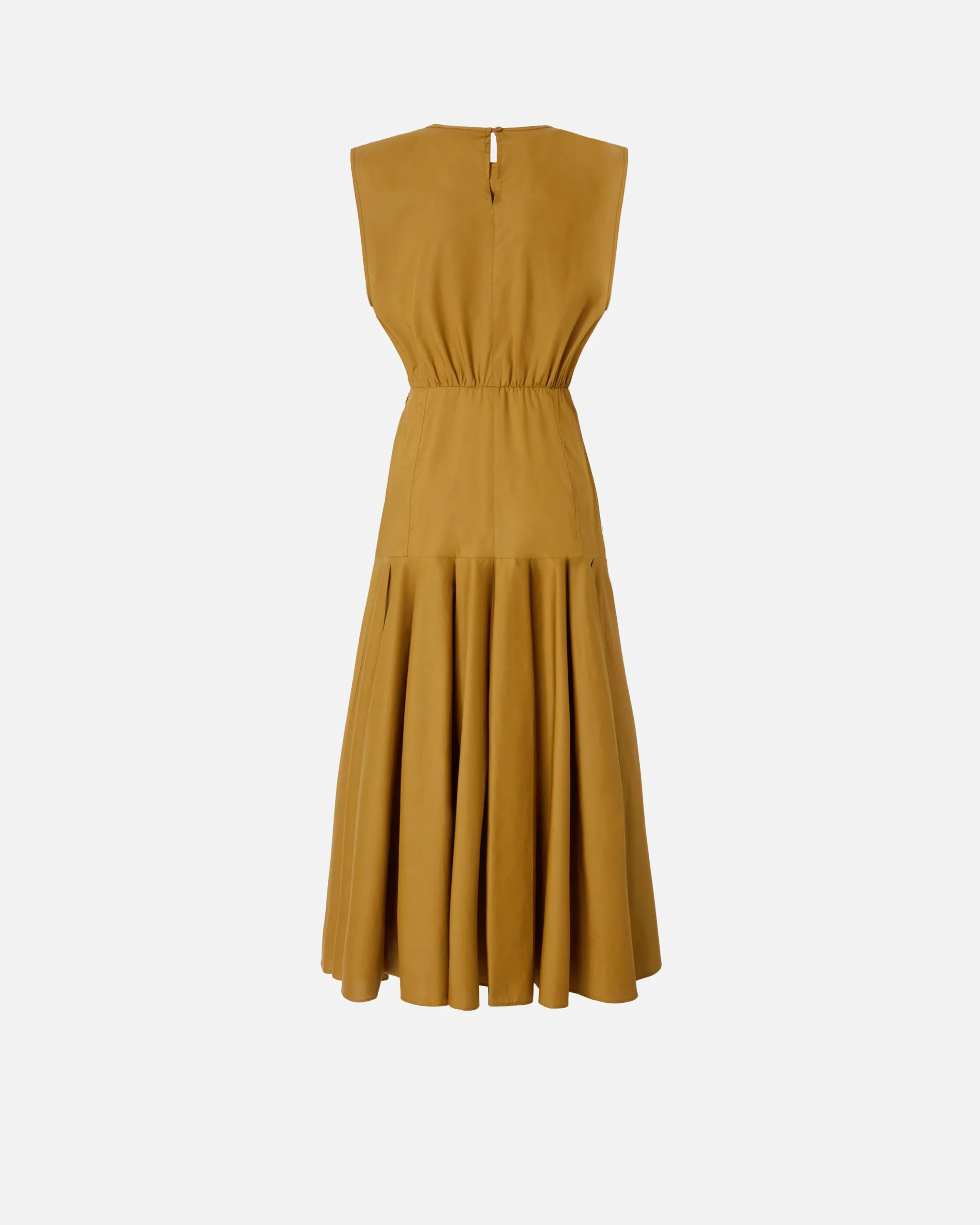 Φόρεμα με μίντι μήκος και αμάνικο σχεδιασμό, κατασκευασμένο από καθαρή βαμβακερή ποπλίνα με δροσερή και ευχάριστη υφή. Ξεχωρίζει για το ελαφρώς εβαζέ κάτω μέρος με χαλαρές πιέτες, για το μπούστο που χαρακτηρίζεται από στρογγυλή λαιμόκοψη με κουμπάκι και άνοιγμα σε σχήμα σταγόνας στο πίσω μέρος, καθώς και από το ελαστικό τελείωμα στη μέση με σούρες που δημιουργεί ένα μικρό άνοιγμα μπροστά. Το φόρεμα διαθέτει κρυφό φερμουάρ πλευρικά για να διευκολύνει το ντύσιμο. Άκρως καλοκαιρινό και πρωινό, θα γίνει το πραγματικό πασπαρτού των καθημερινών σας εμφανίσεων: συνδυάστε το με ένα ζευγάρι sneakers για πιο casual look ή φορέστε το με πλατφόρμες ή ψηλά πέδιλα για μια πιο επίσημη περίσταση.