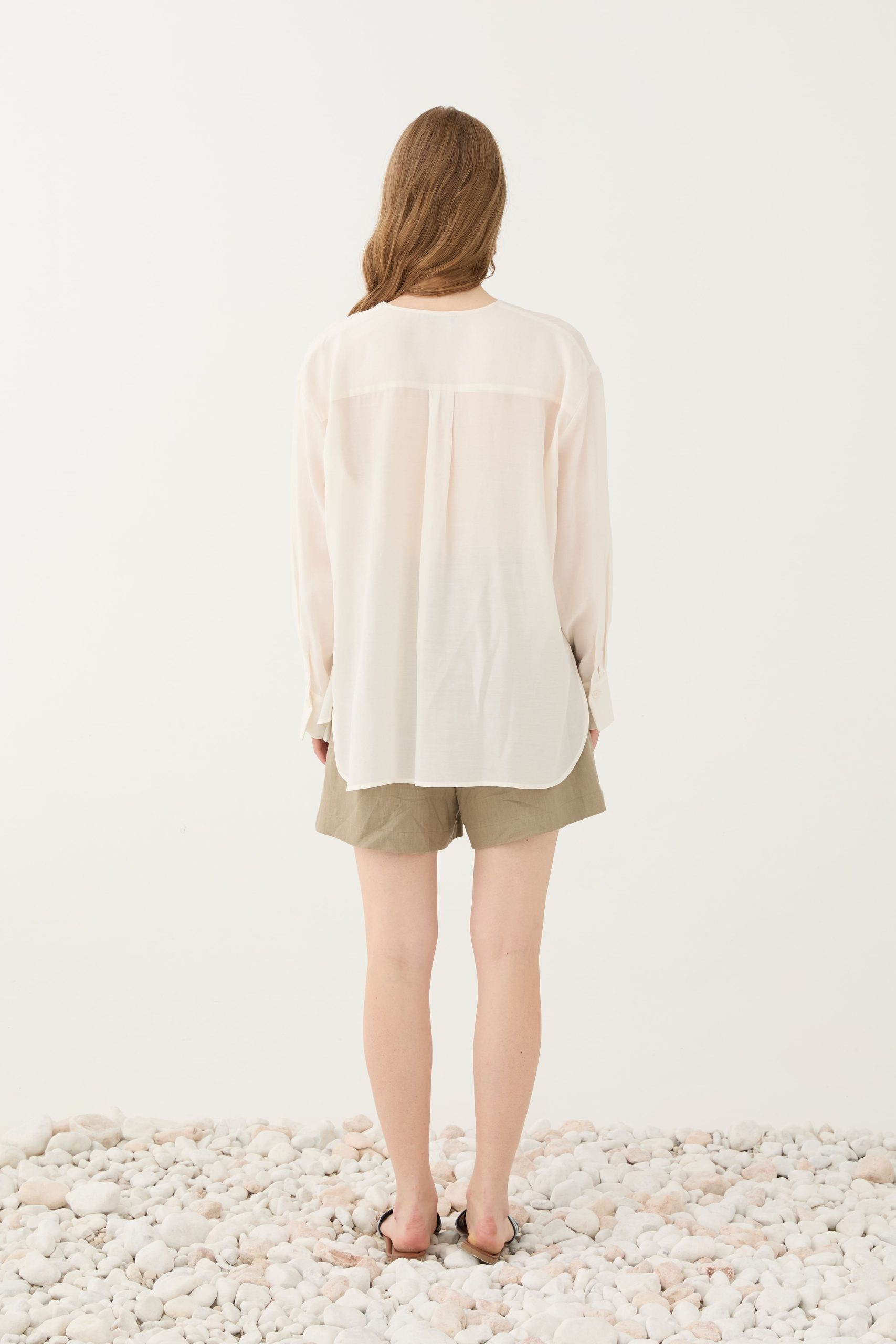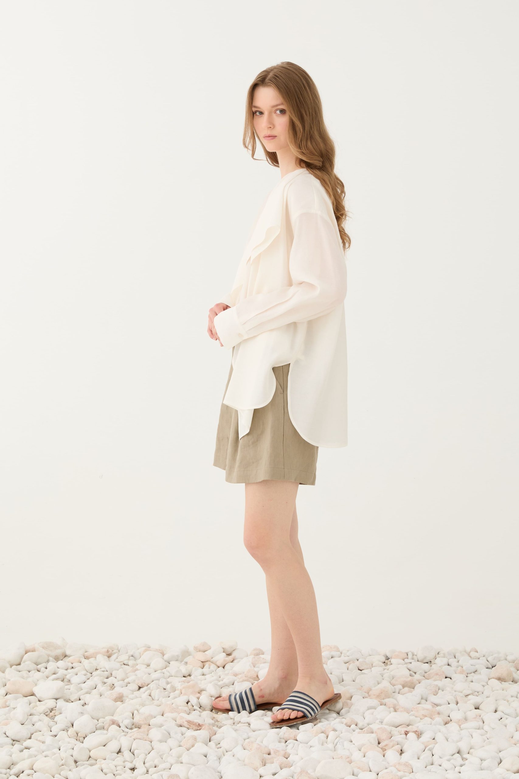 Φορεμένη μέσα από λινό σορτς για minimal καλοκαιρινό look.