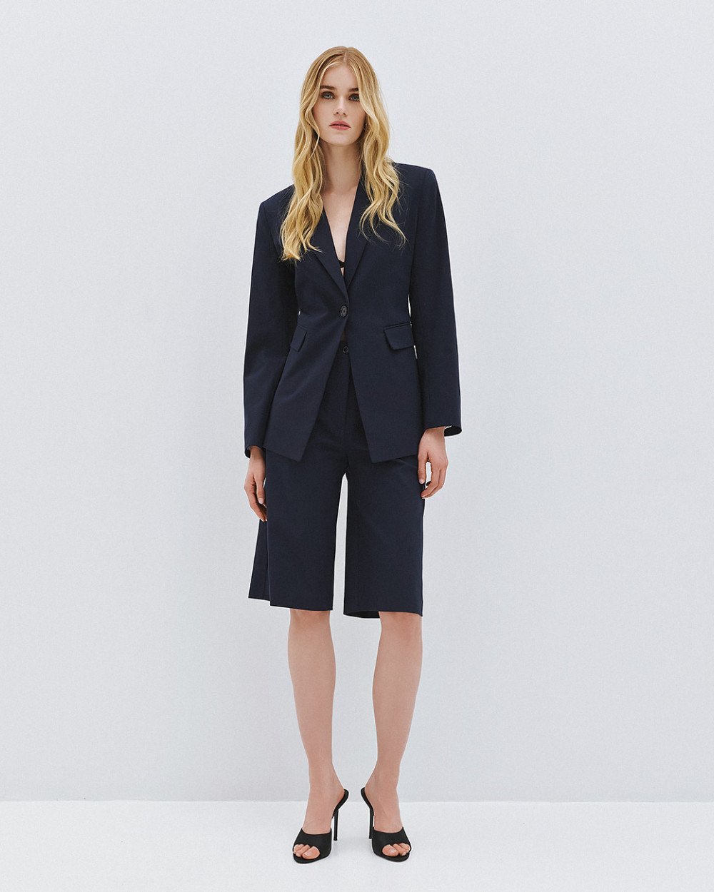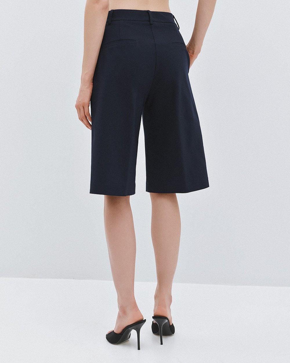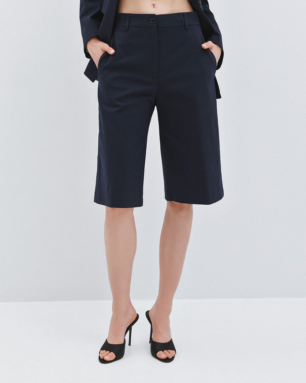 Ψηλόμεση βερμούδα με πλαϊνές τσέπες και διακοσμητικές τσέπες με ρέλι πίσω. Διαθέτει θηλύκια για ζώνη και κλείσιμο με κουμπί και φερμουάρ μπροστά.