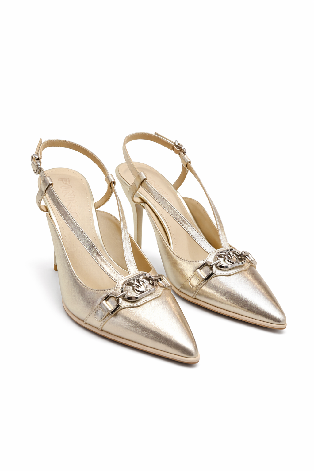 Το μυτερό τελείωμα χαρίζει θηλυκότητα, ενώ το μεταλλικό φινίρισμα προσθέτει διακριτική λάμψη. Η χαρακτηριστική μεταλλική αγκράφα με το εμβληματικό logo Pinko στο επάνω μέρος αναβαθμίζει το σχέδιο, δίνοντας luxury χαρακτήρα. Το sling back λουράκι εξασφαλίζει σταθερή εφαρμογή και άνεση, ακόμα και σε πολύωρη χρήση.