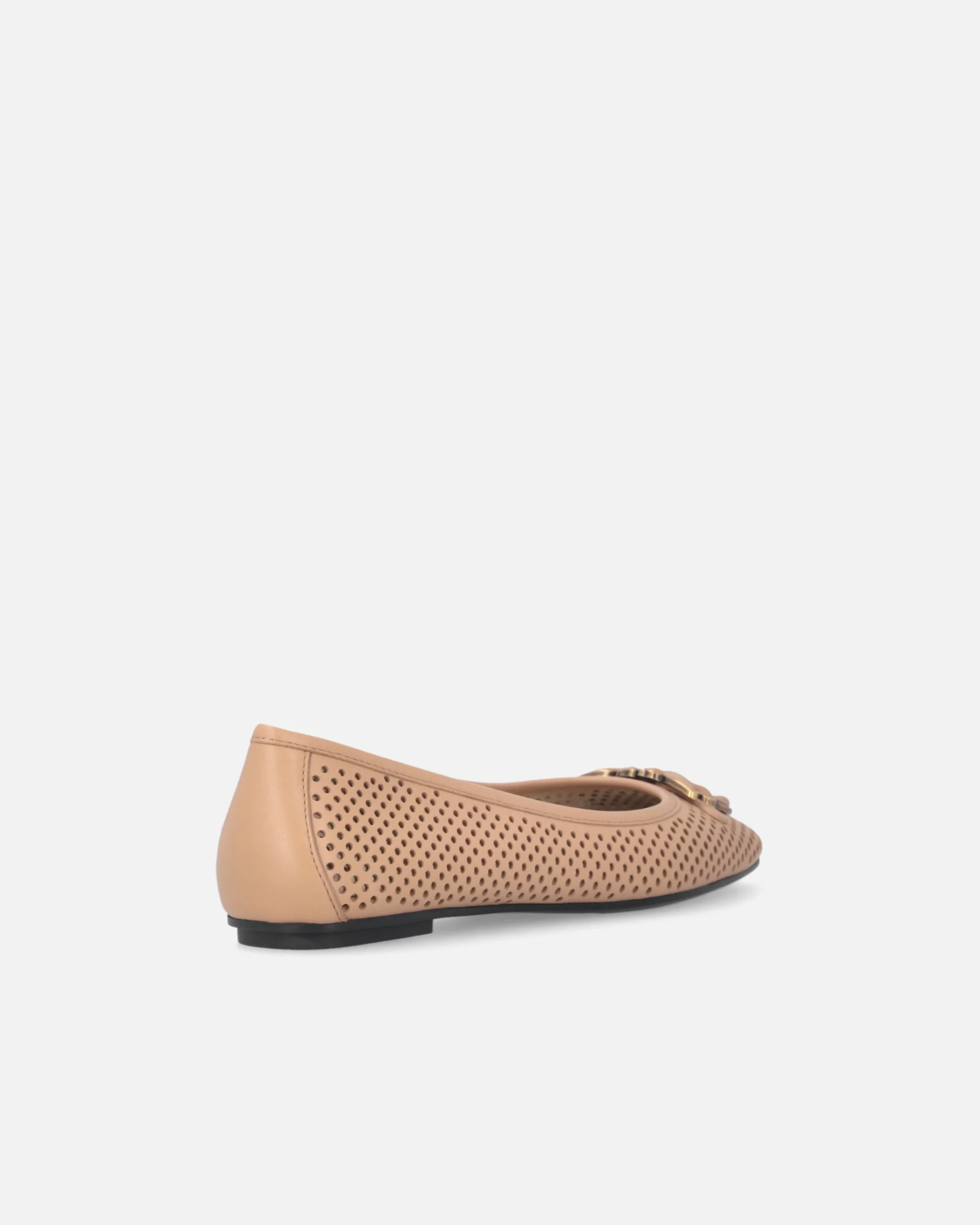 Μπαλαρίνες από μαλακό δέρμα nappa για άνετη εφαρμογή με εύκαμπτη κατασκευή που ακολουθεί τη φυσική κίνηση του ποδιού. Ο μίνιμαλ σχεδιασμός αναδεικνύεται από το μεταλλικό λογότυπο Love Birds που διακοσμεί το μπροστινό μέρος, καθώς και από τη διάτρητη υφή που προσφέρει οπτική ελαφρότητα και πραγματική διαπνοή, καθιστώντας το παπούτσι ιδανικό για την ανοιξιάτικη σεζόν. Με τέλεια ισορροπία μεταξύ λιτής κομψότητας και καθημερινής άνεσης, αυτές οι μπαλαρίνες συνδυάζονται εύκολα με casual chic εμφανίσεις, από το πρωί έως το βράδυ.