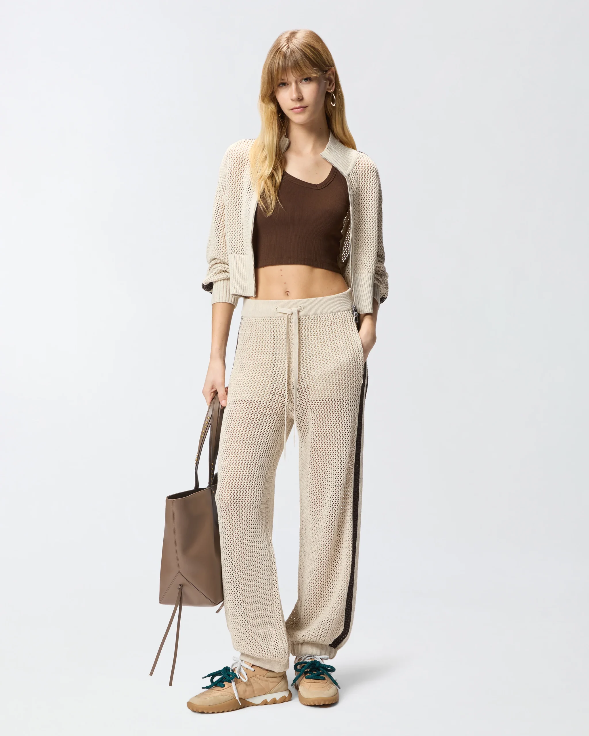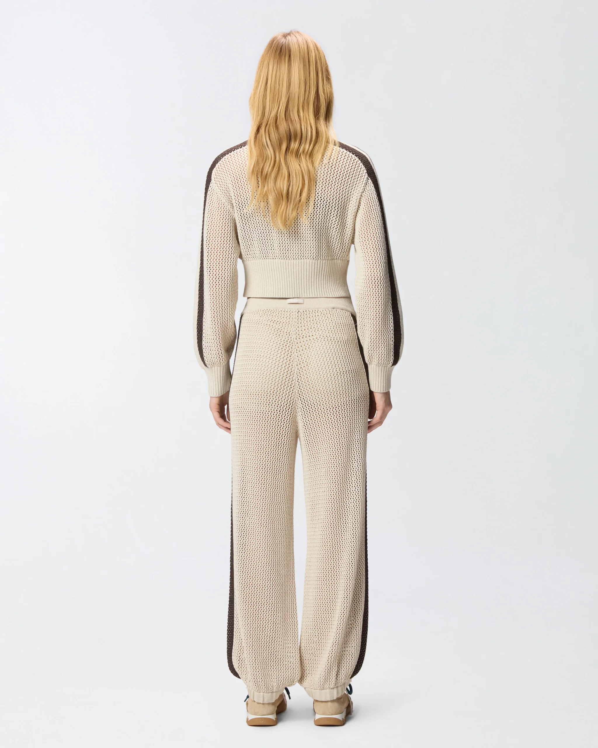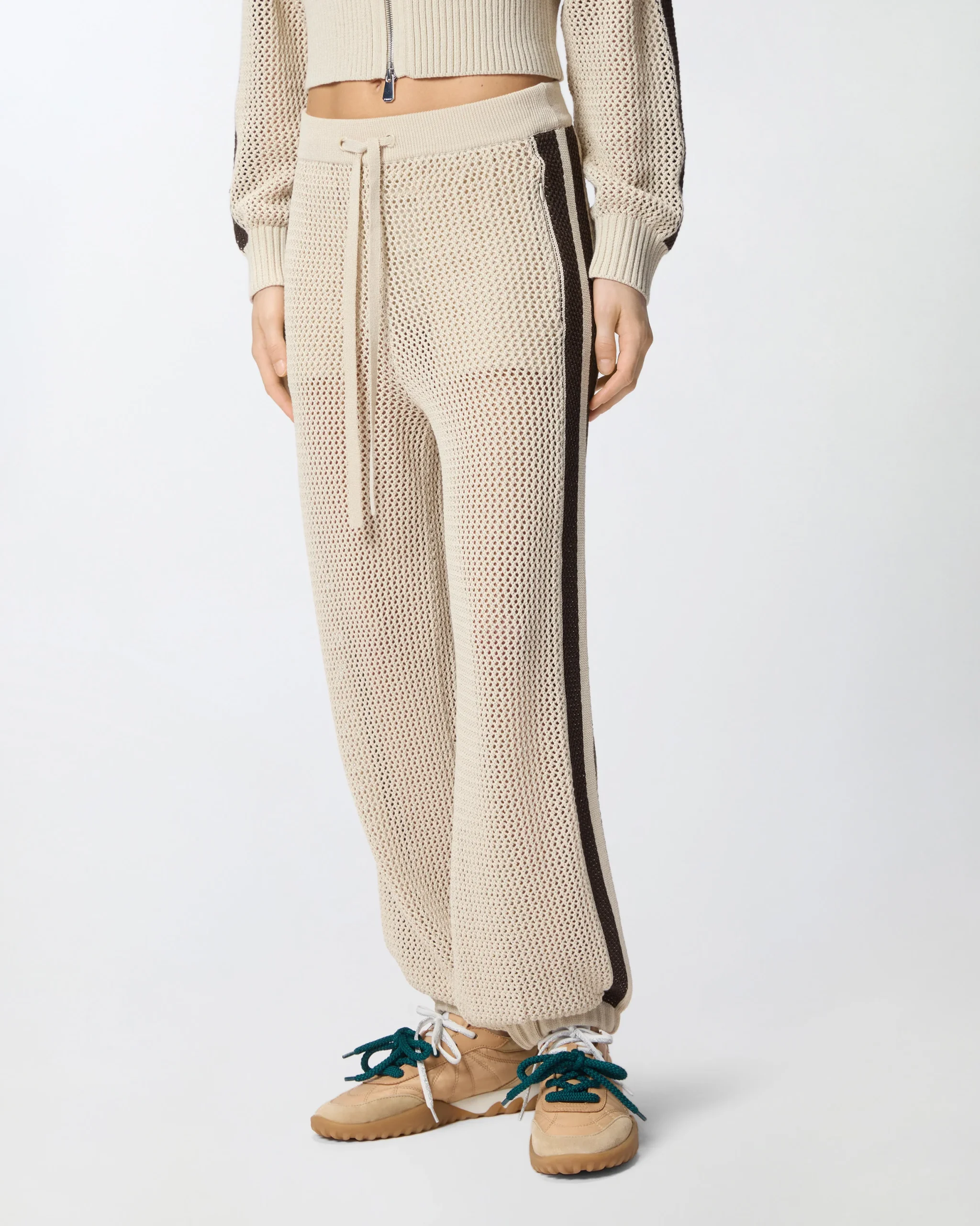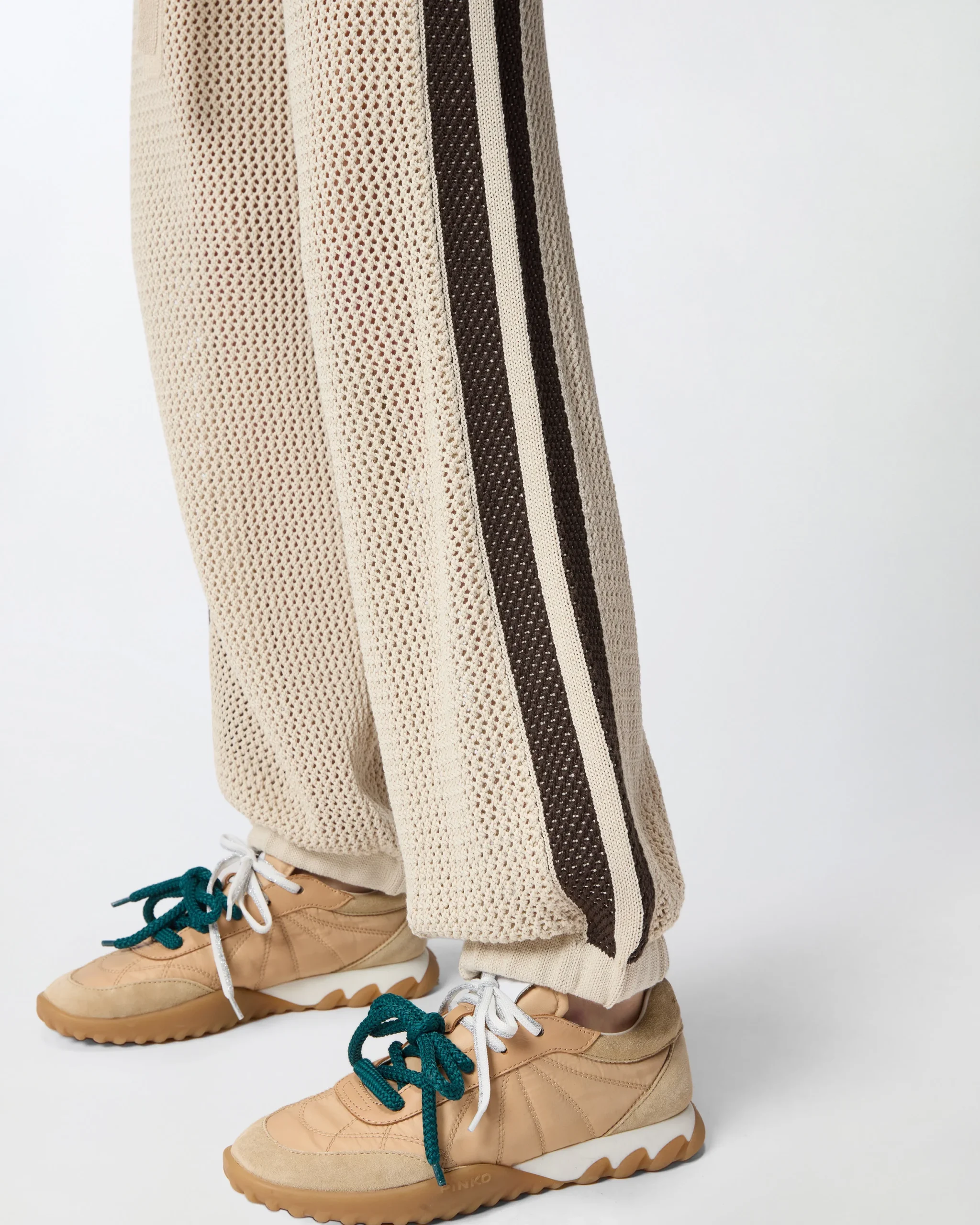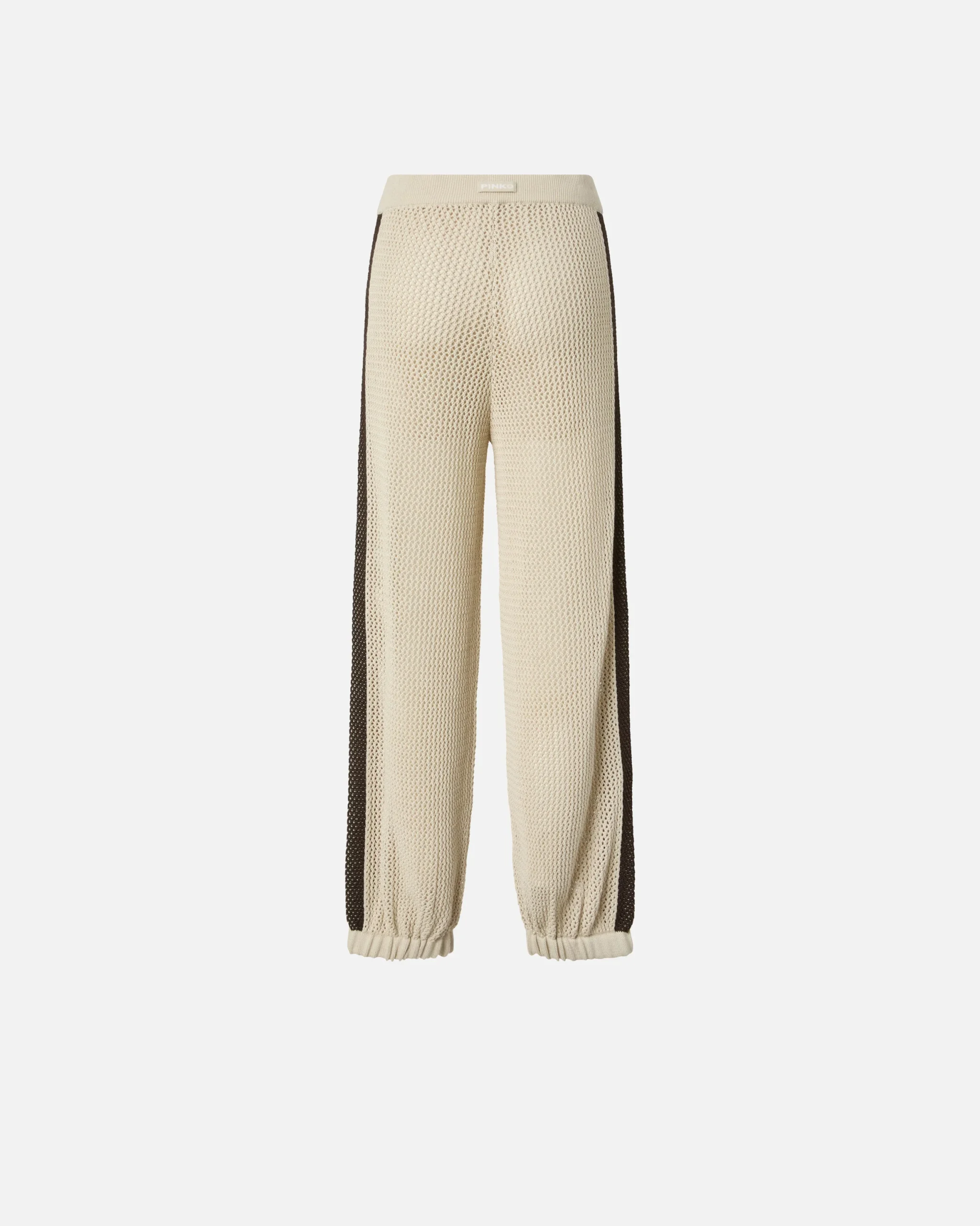 Αθλητικό παντελόνι κατασκευασμένο από απαλό και δροσερό, ελαφρώς ελαστικό σύμμεικτο βαμβακερό ύφασμα με διάτρητη πλέξη που θυμίζει διχτάκι. Το παντελόνι διαθέτει ρίγες διαφορετικού χρώματος πλευρικά, αφαιρούμενο σορτς εσωτερικά, πλευρικές τσέπες, ελαστικό τελείωμα στα μπατζάκια και ελαστική μέση με ρυθμιζόμενο κορδόνι. Η ετικέτα με το λογότυπο PINKO πίσω χαρίζει την τελική πινελιά στυλ. Ιδανικό για να προσθέσει μια cool πινελιά στις πιο αθλητικές σας εμφανίσεις.