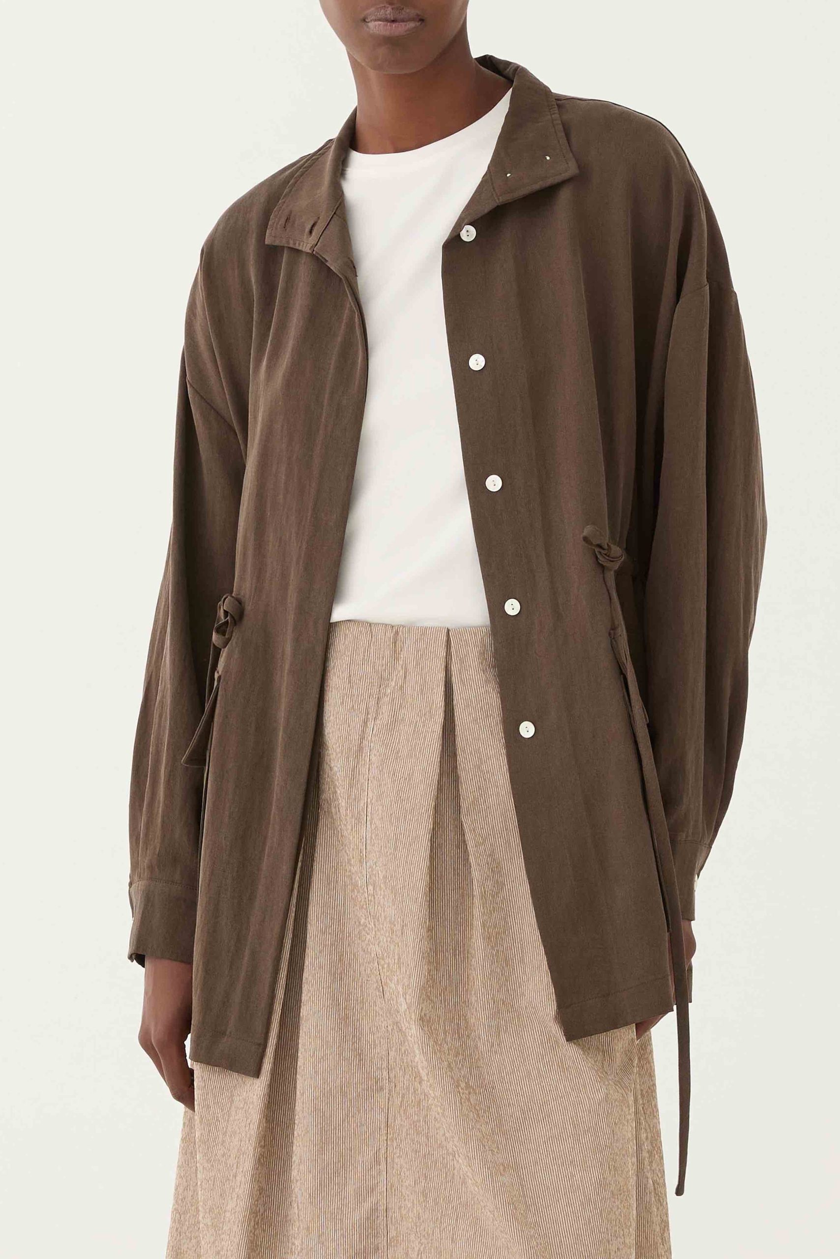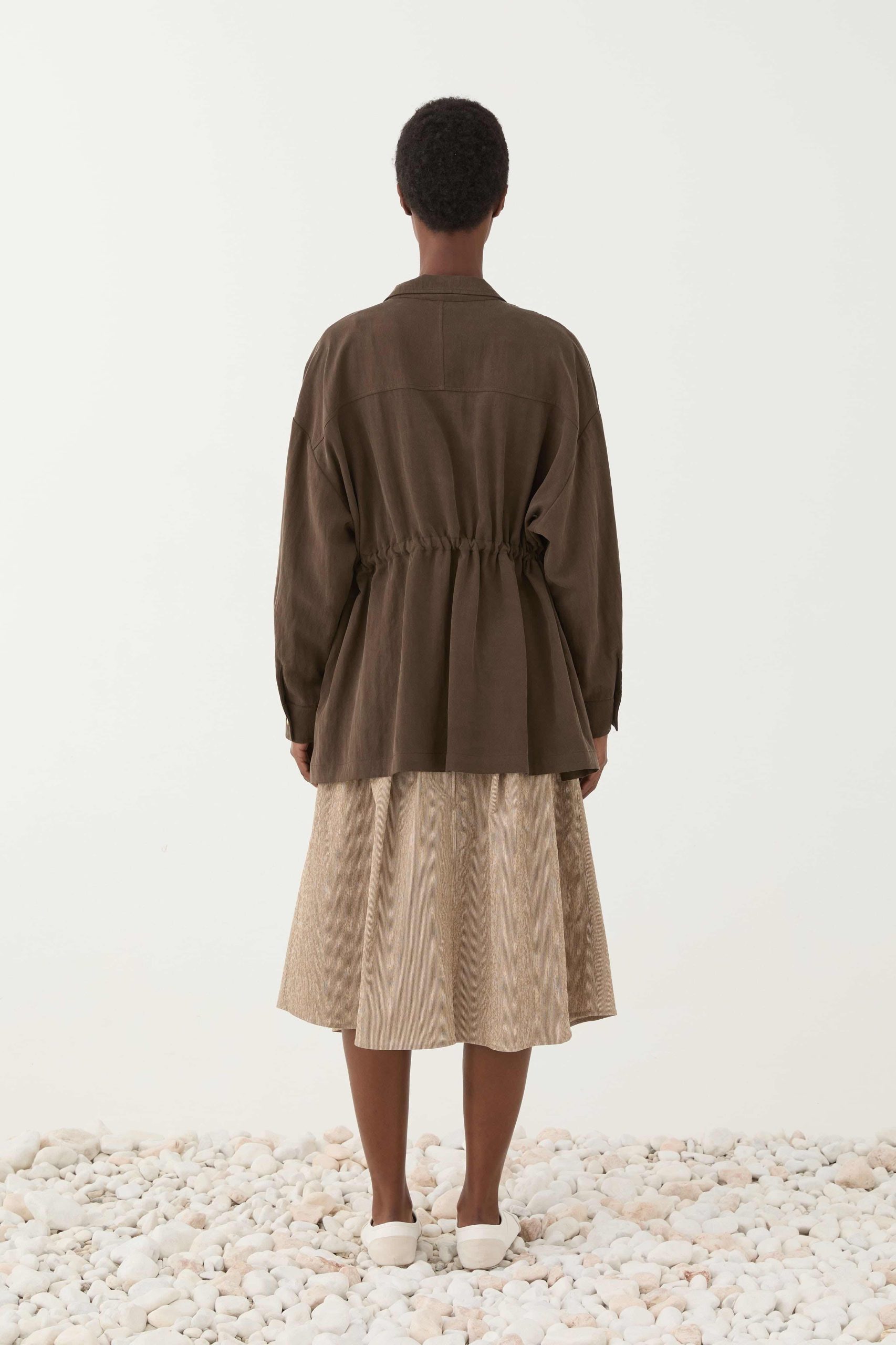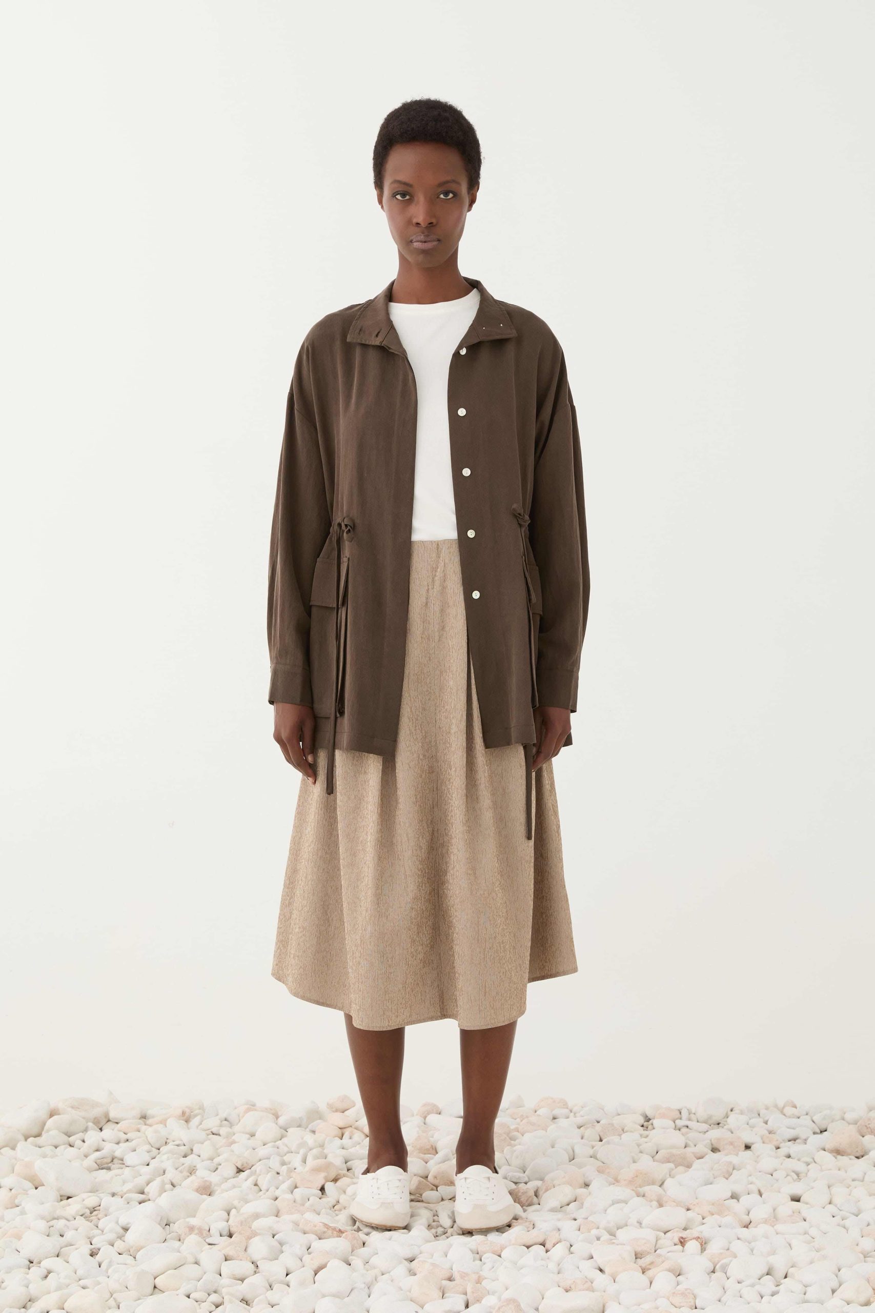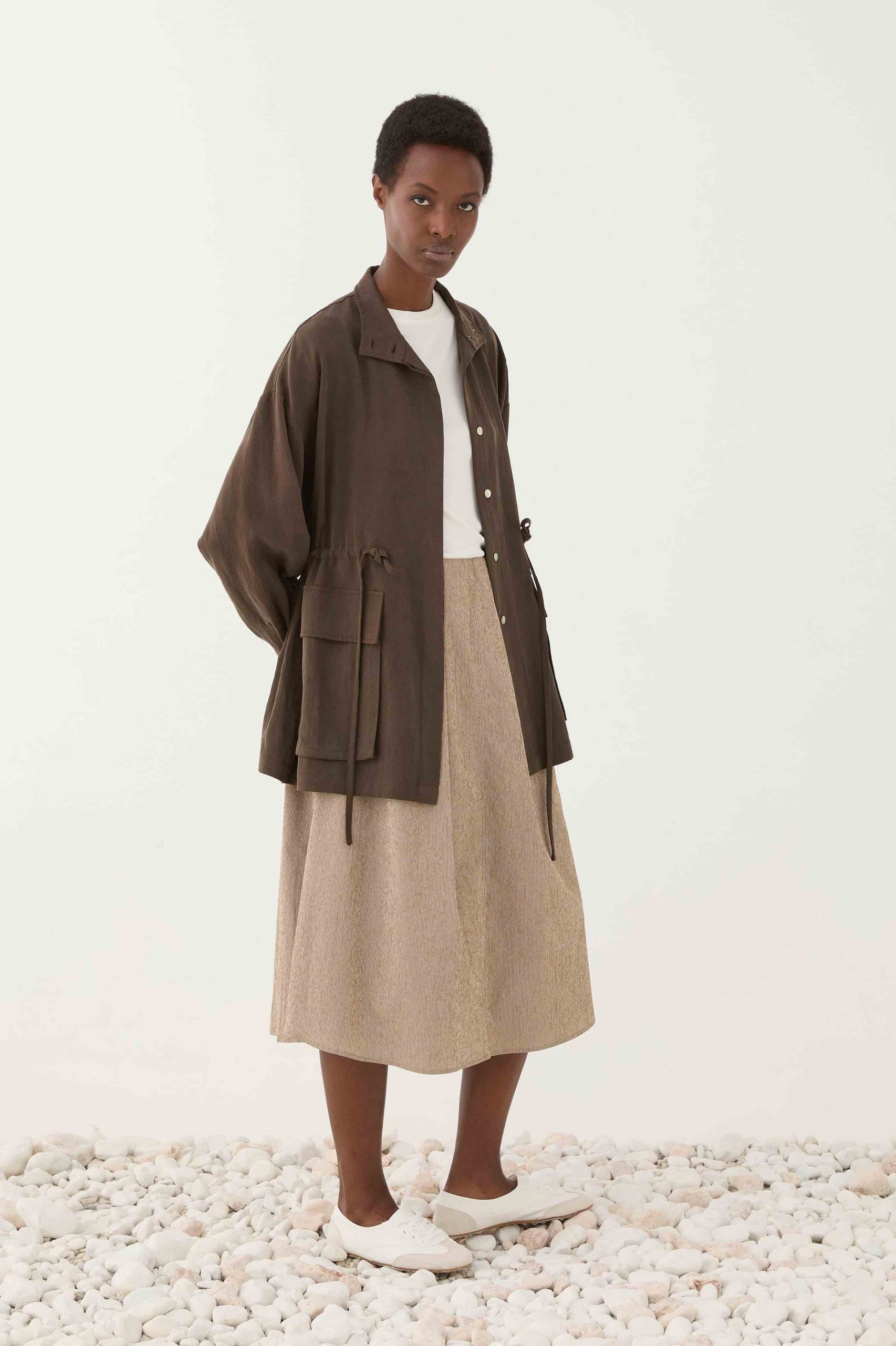 Διαθέτει κλείσιμο με κουμπιά μπροστά, χαλαρή γραμμή και ρυθμιζόμενη μέση με κορδόνι που σου επιτρέπει να το προσαρμόζεις στη σιλουέτα σου. Οι μεγάλες τσέπες προσθέτουν λειτουργικό χαρακτήρα, ενώ η γήινη καφέ απόχρωση το κάνει εύκολο στους συνδυασμούς.