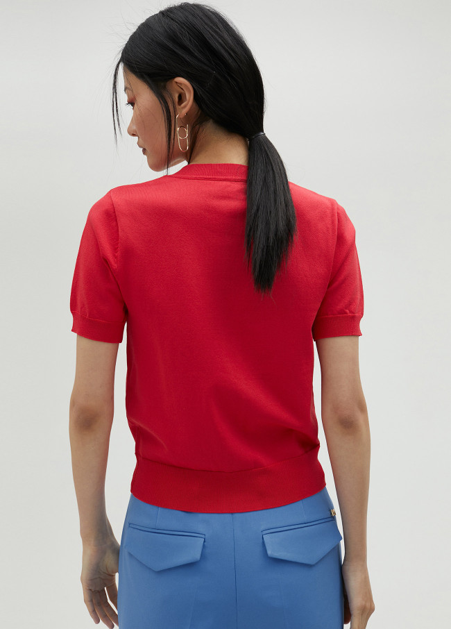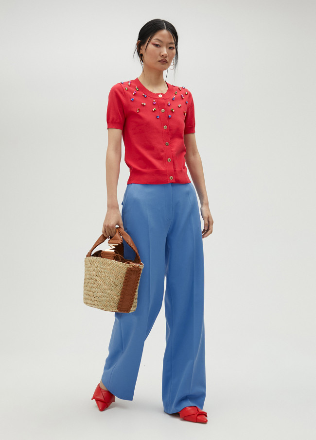 Εντυπωσιακή ζακέτα σε ζωηρή κόκκινη απόχρωση, διακοσμημένη με πολύχρωμα στρας που χαρίζουν λάμψη και fashion χαρακτήρα. Κοντό μανίκι, στρογγυλή λαιμόκοψη και κουμπιά στο μπροστινό μέρος για άνετη εφαρμογή. Ένα statement κομμάτι που φωτίζει κάθε εμφάνιση και ξεχωρίζει χωρίς υπερβολή.
