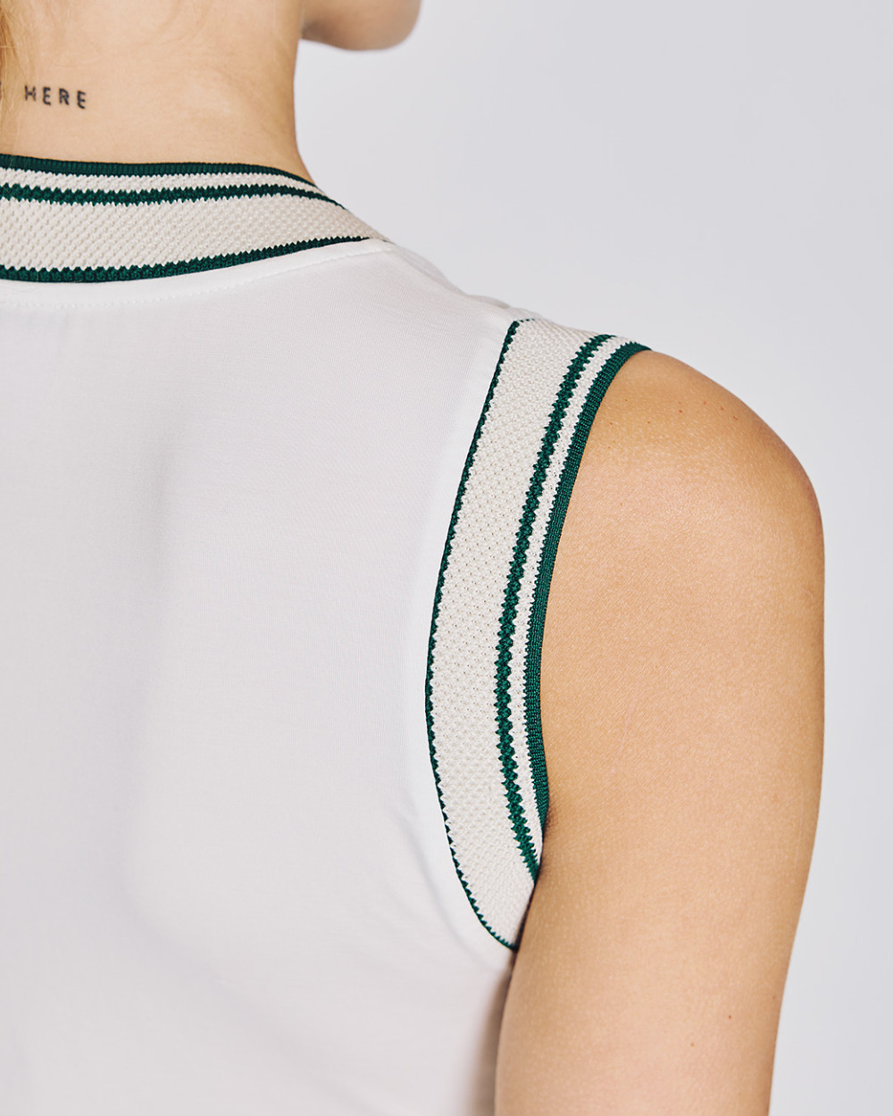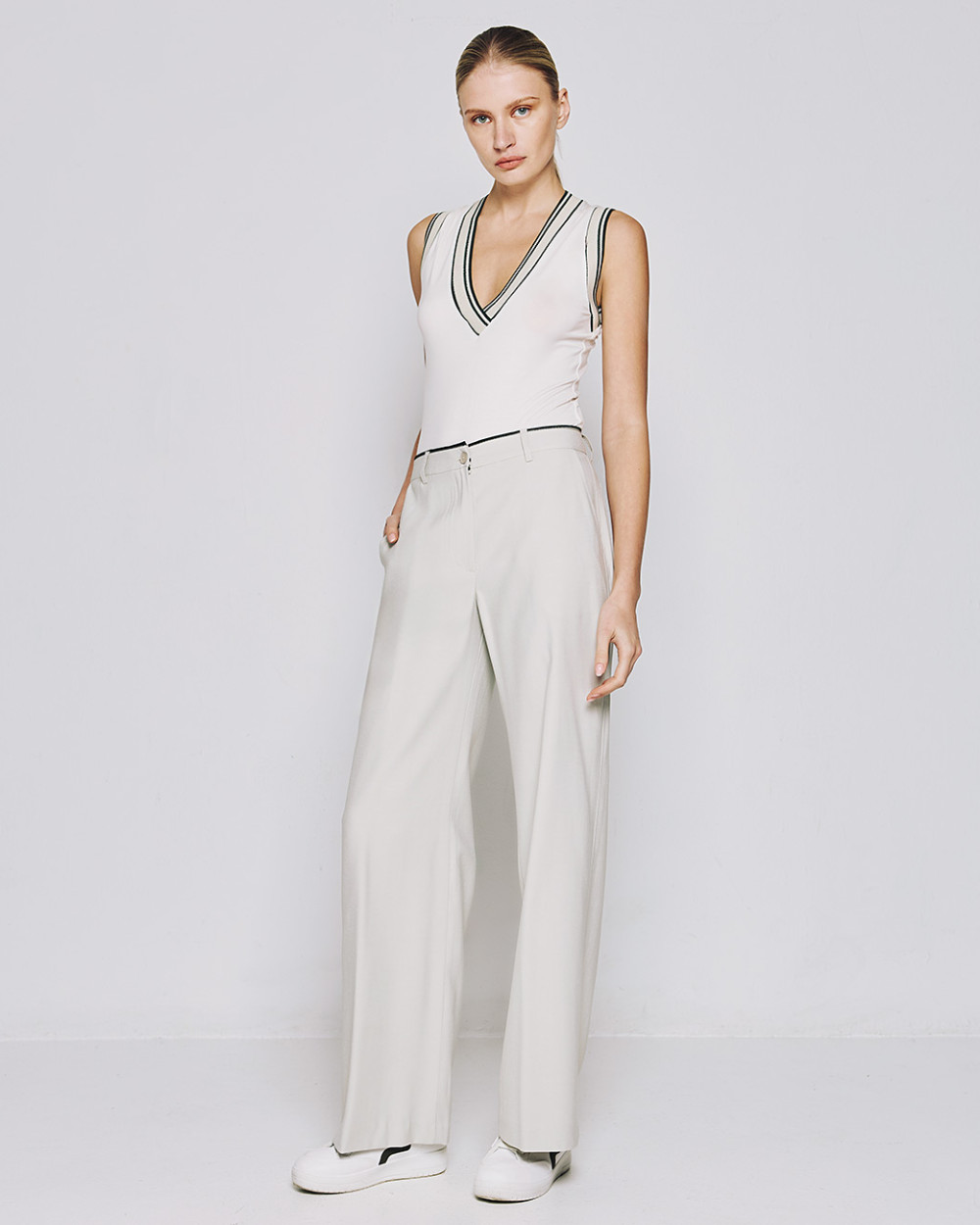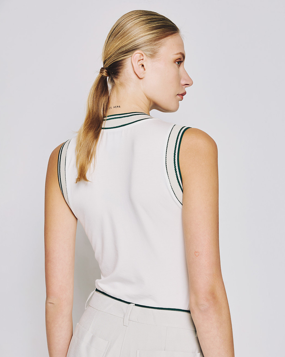 Αμάνικο κορμάκι με V λαιμόκοψη και ελαστικές ριγέ λεπτομέρειες. Επιλέξτε το για άνετες και στιλάτες εμφανίσεις.