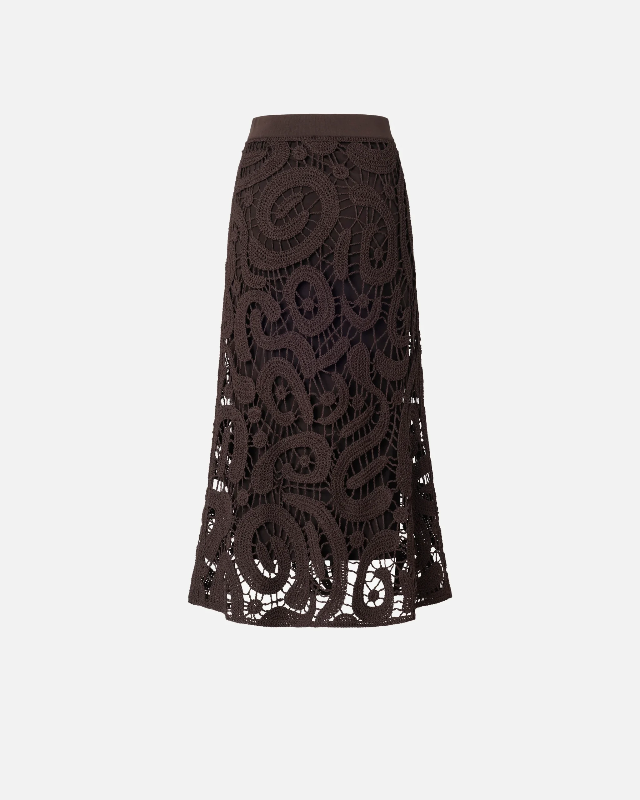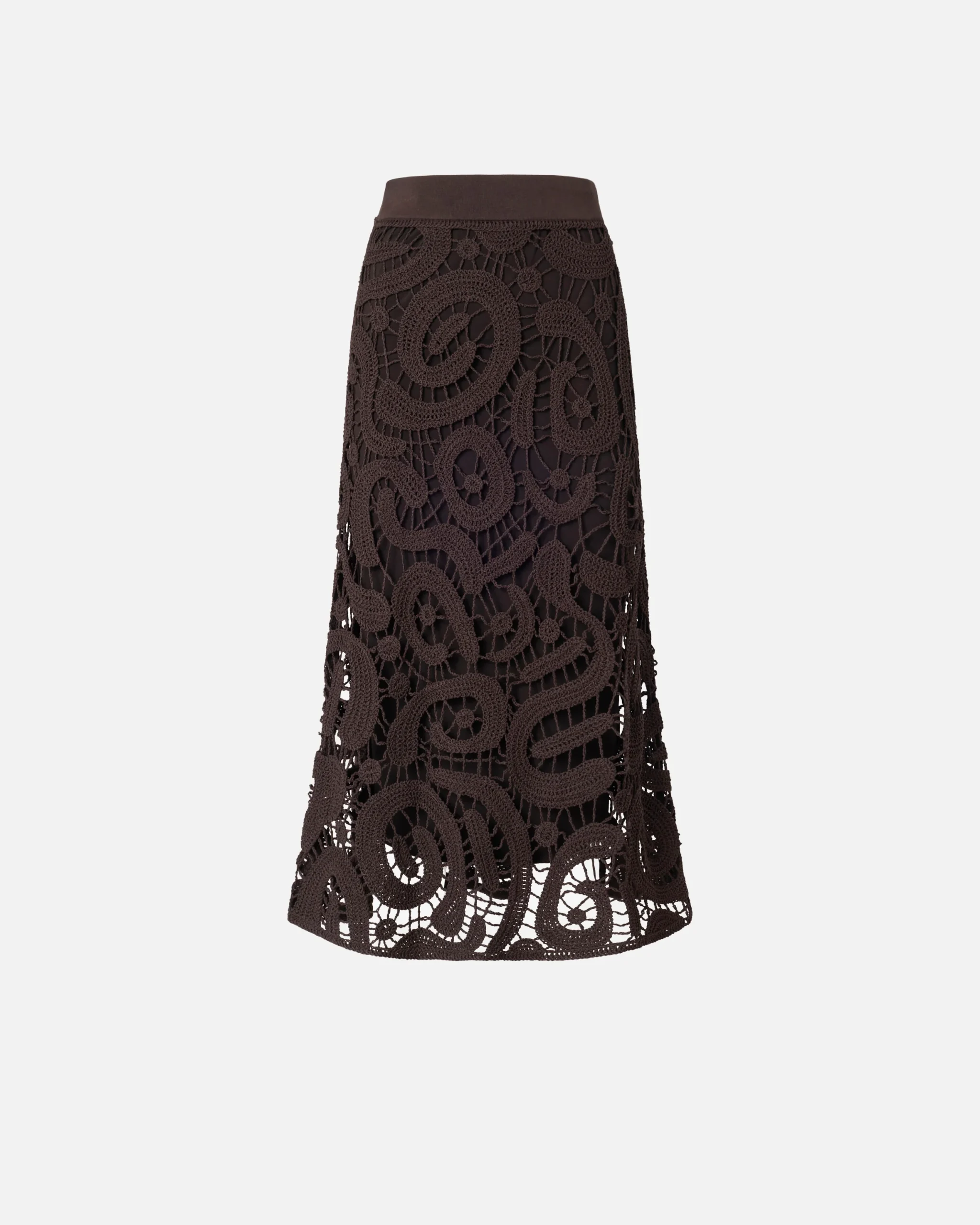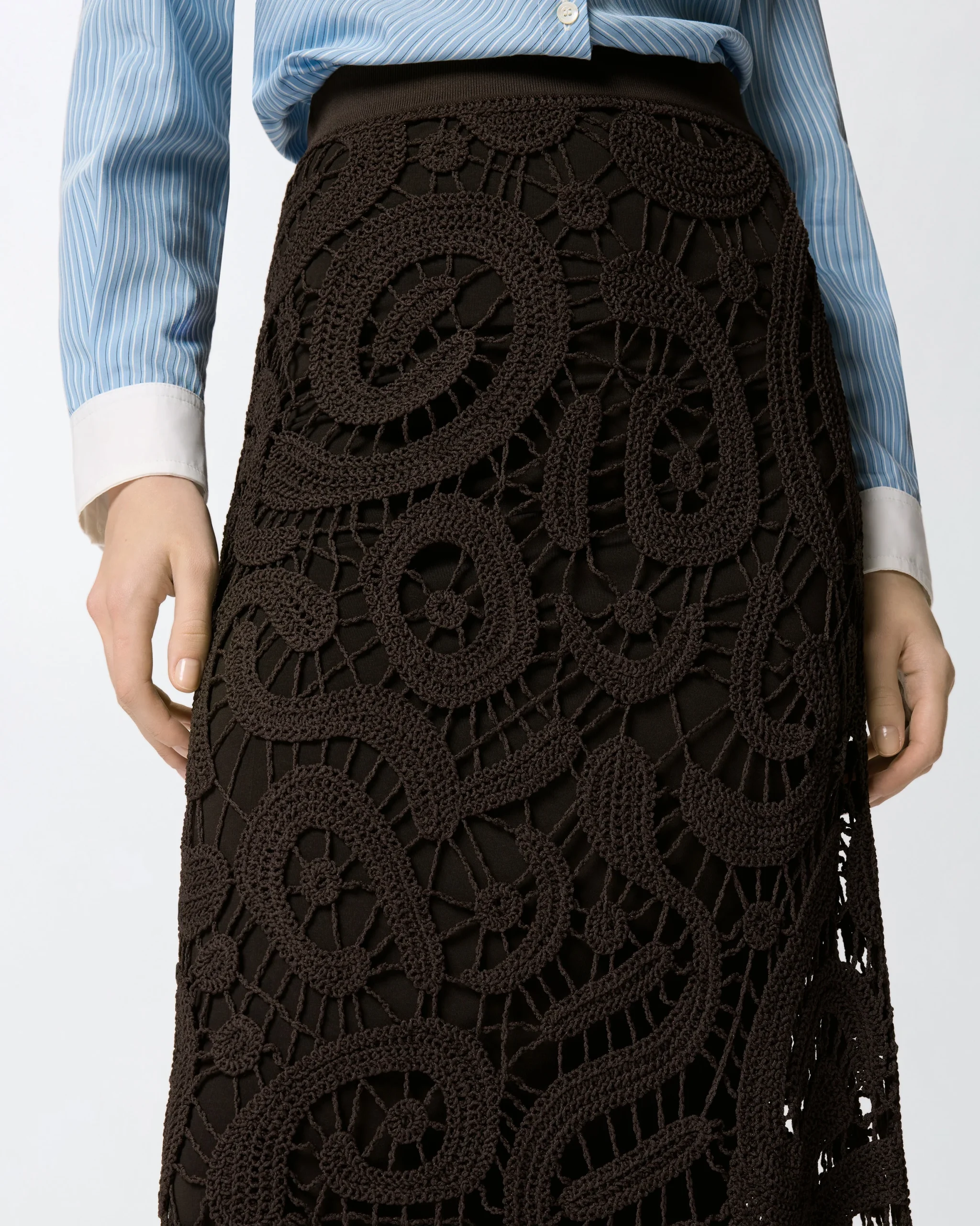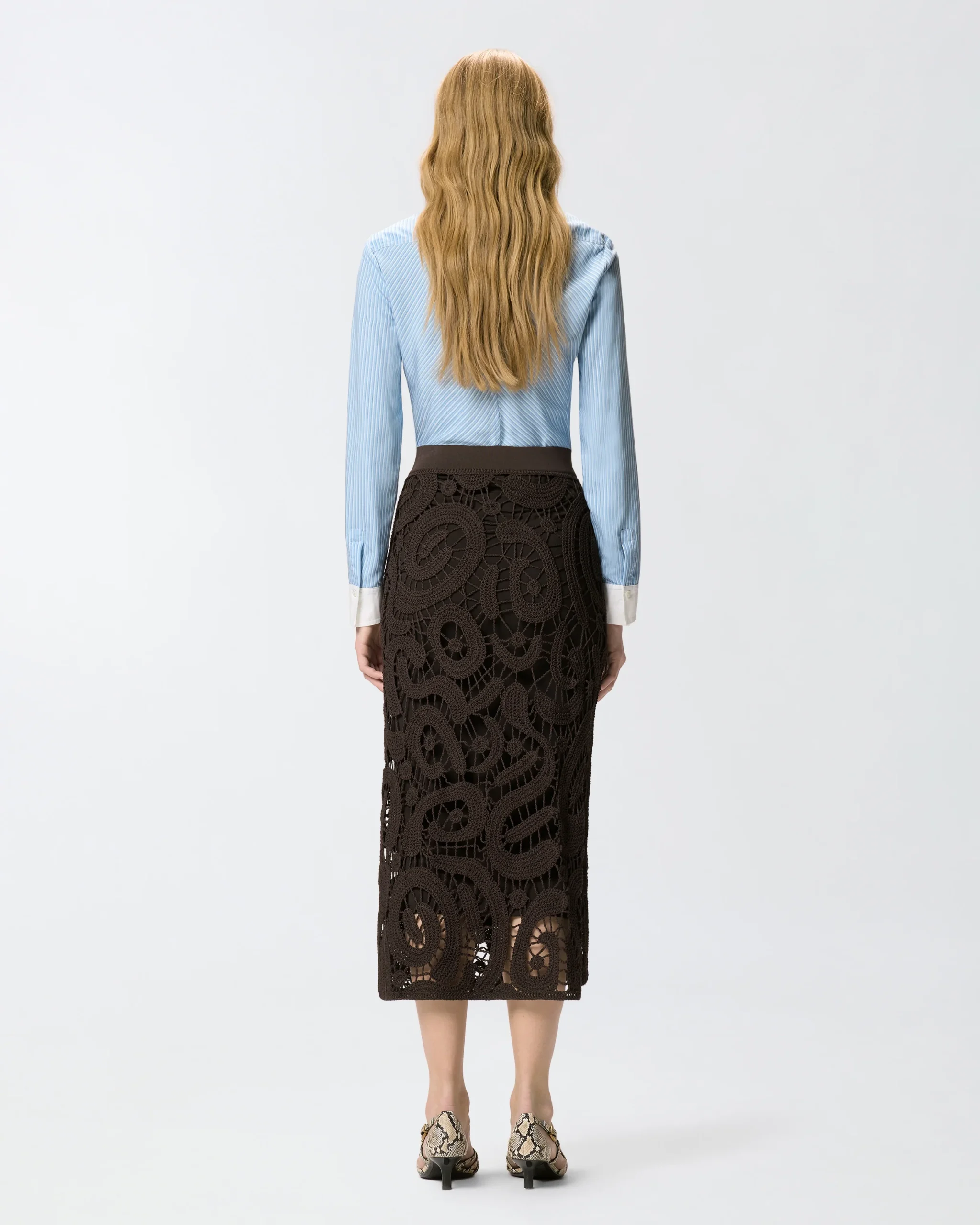 Φούστα με μίντι μήκος, εβαζέ γραμμή στο κάτω μέρος και ελαστική μέση, που χαρακτηρίζεται από μια κομψή κροσέ πλέξη με ιδιαίτερο γεωμετρικό σχέδιο που, χάρη στην φόδρα εσωτερικά, χαρίζει δυναμικό χαρακτήρα στο σχέδιο και δημιουργεί μια ημιδιάφανη όψη.