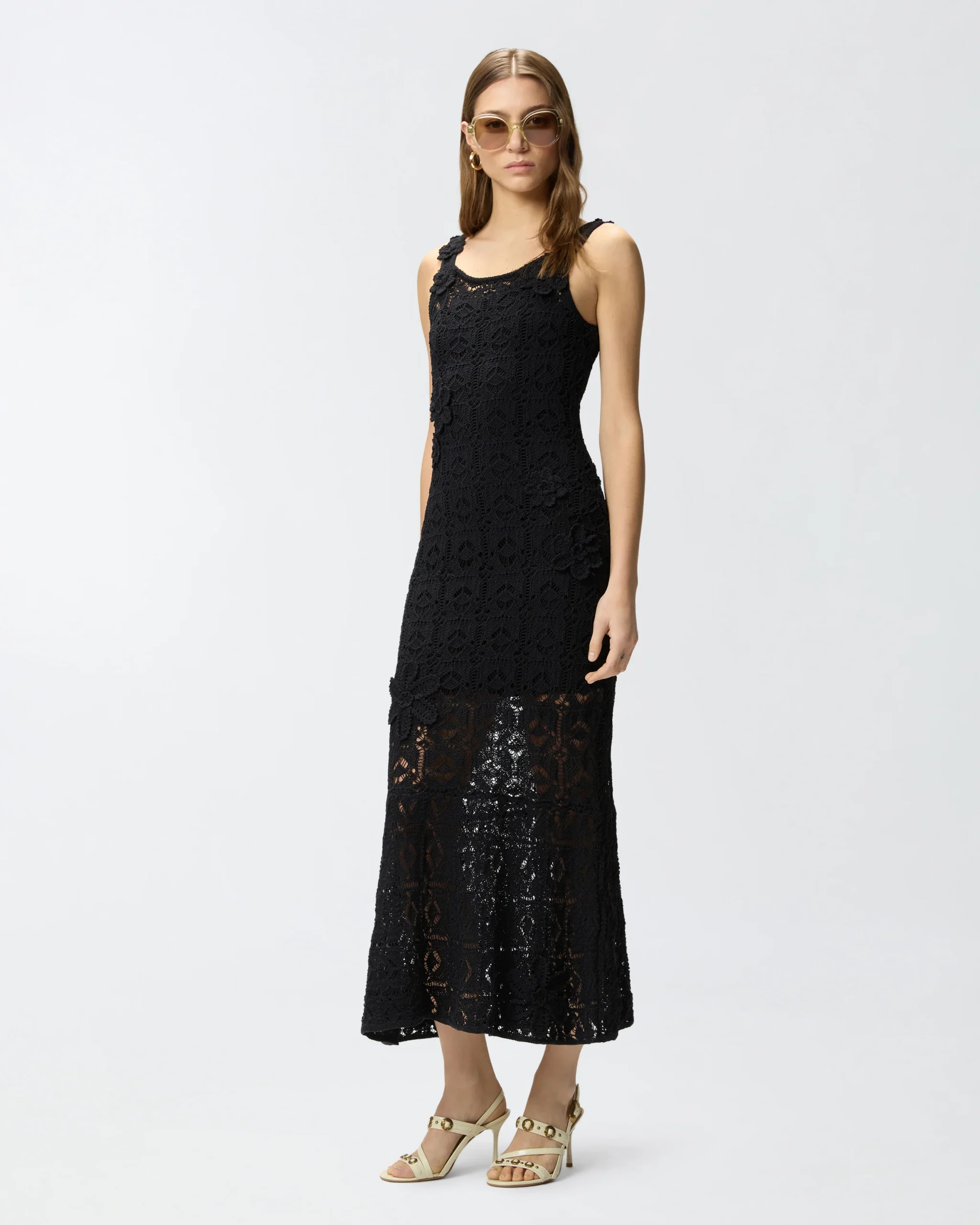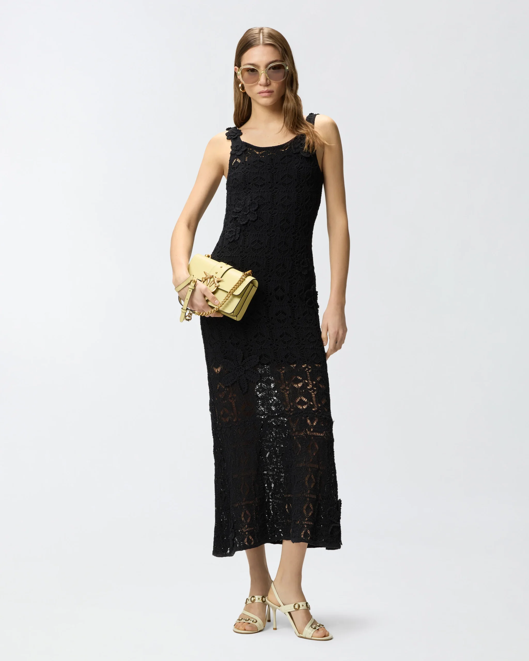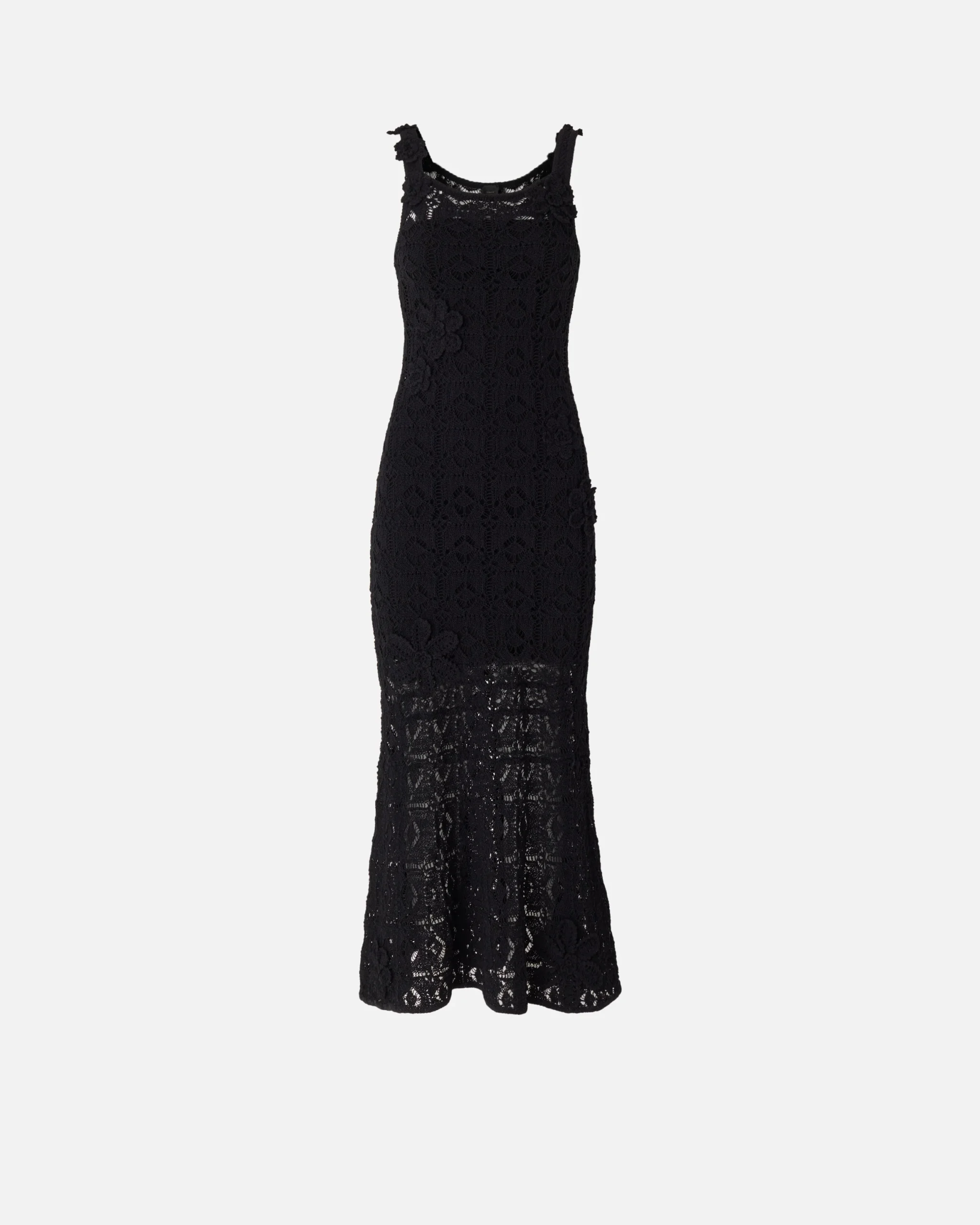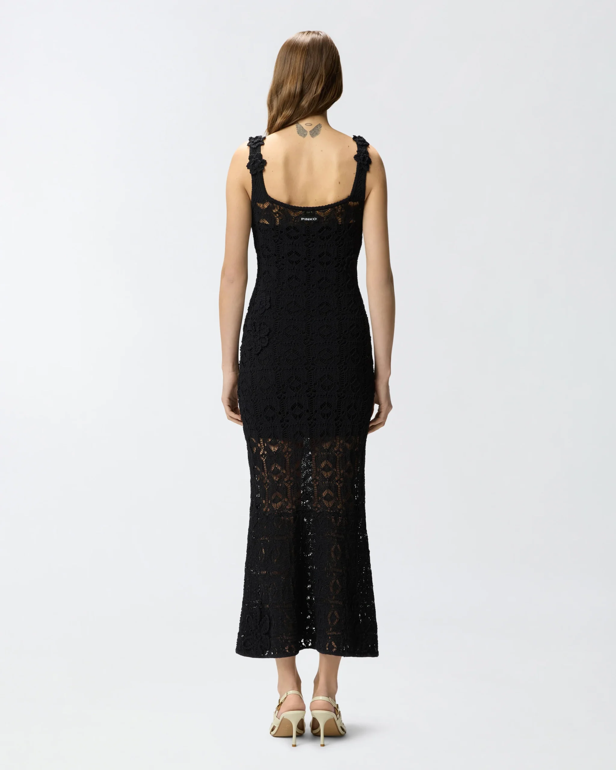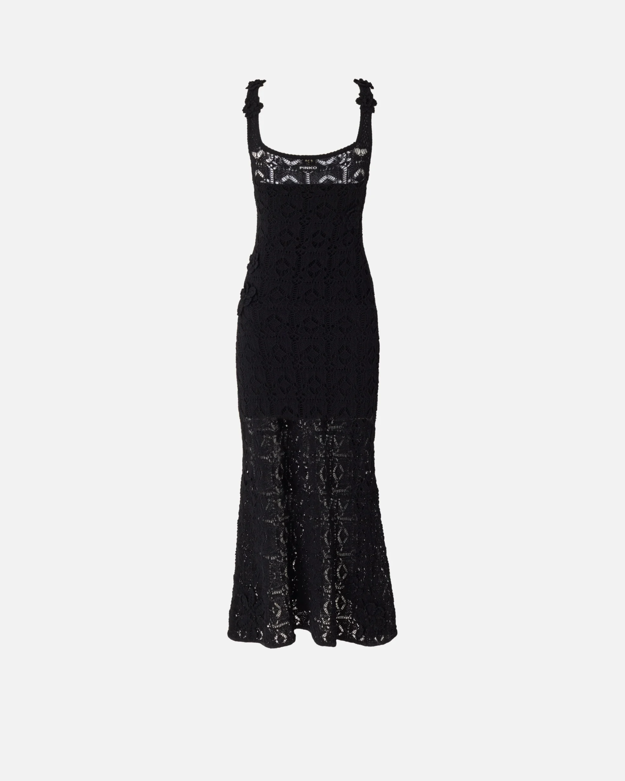 Μίντι φόρεμα σε ίσια και χαλαρή γραμμή, με τετράγωνο ντεκολτέ μπροστά και τετράγωνο άνοιγμα πίσω και αμάνικο σχέδιο με τιράντες, διακοσμημένο με ζακάρ ετικέτα με το λογότυπο PINKO πίσω. Είναι πλεγμένο με την τεχνική κροσέ από σύμμεικτο βαμβακερό νήμα με χυτή υφή και ξεχωρίζει για τα λουλούδια διαφορετικών μεγεθών, επίσης με κροσέ πλέξη και ραμμένα στο χέρι, που προσφέρουν ένα τρισδιάστατο και θηλυκό τελικό αποτέλεσμα. Το φόρεμα διαθέτει επίσης εσωτερική φόδρα στο ίδιο χρώμα, που, πέρα από το να εξασφαλίζει περισσότερη άνεση, δημιουργεί την όψη ενός μίνι φορέματος που μετριάζει τη διαφάνεια που χαρακτηρίζει τα πλεκτά κομμάτια με την τεχνική κροσέ. Το φόρεμα, σαγηνευτικό αλλά άνετο, αποτελεί την ιδανική επιλογή για ιδιαίτερες βραδιές και αποκλειστικά πάρτι, κυρίως σε συνδυασμό με ψηλοτάκουνα πέδιλα και λαμπερά κοσμήματα.