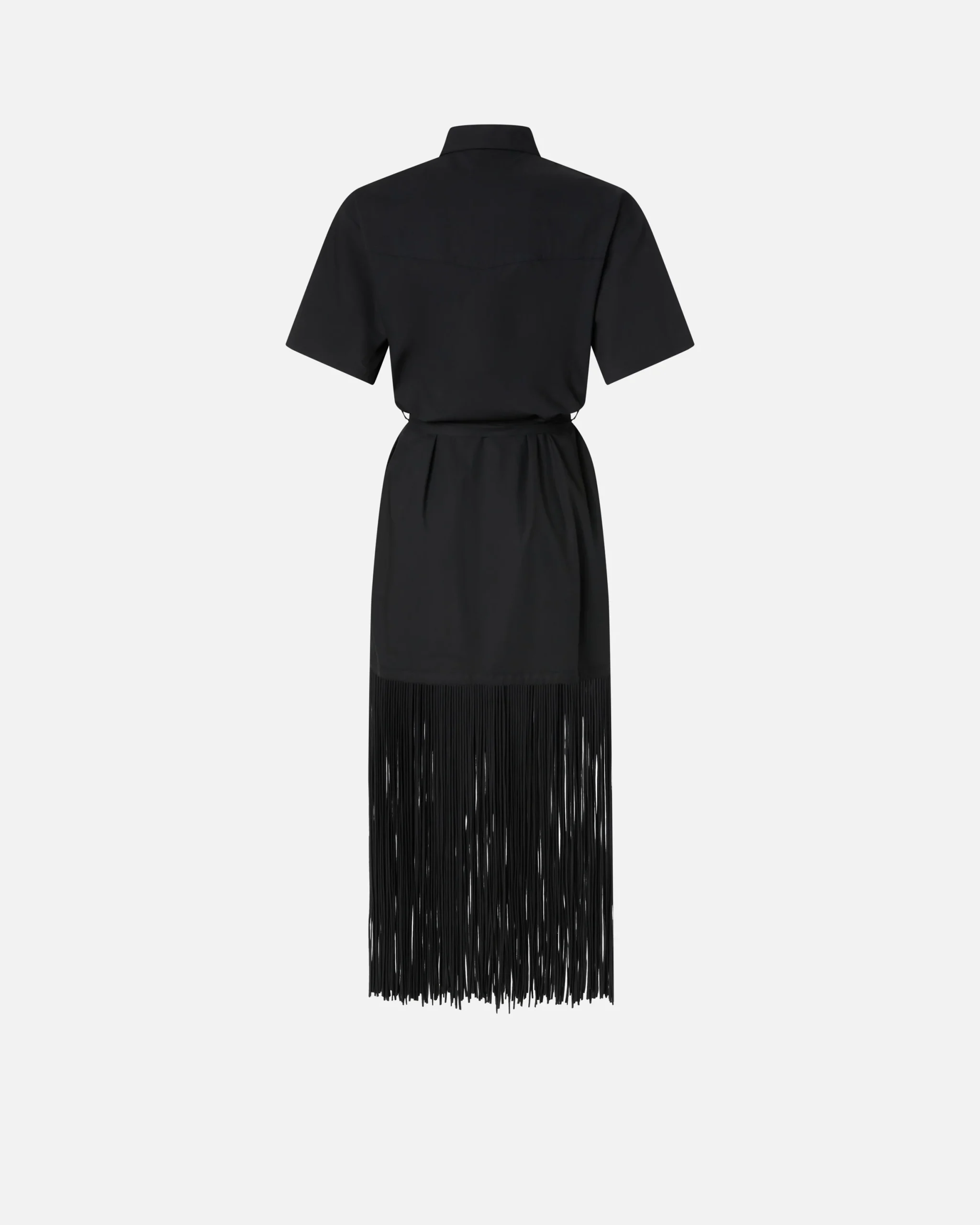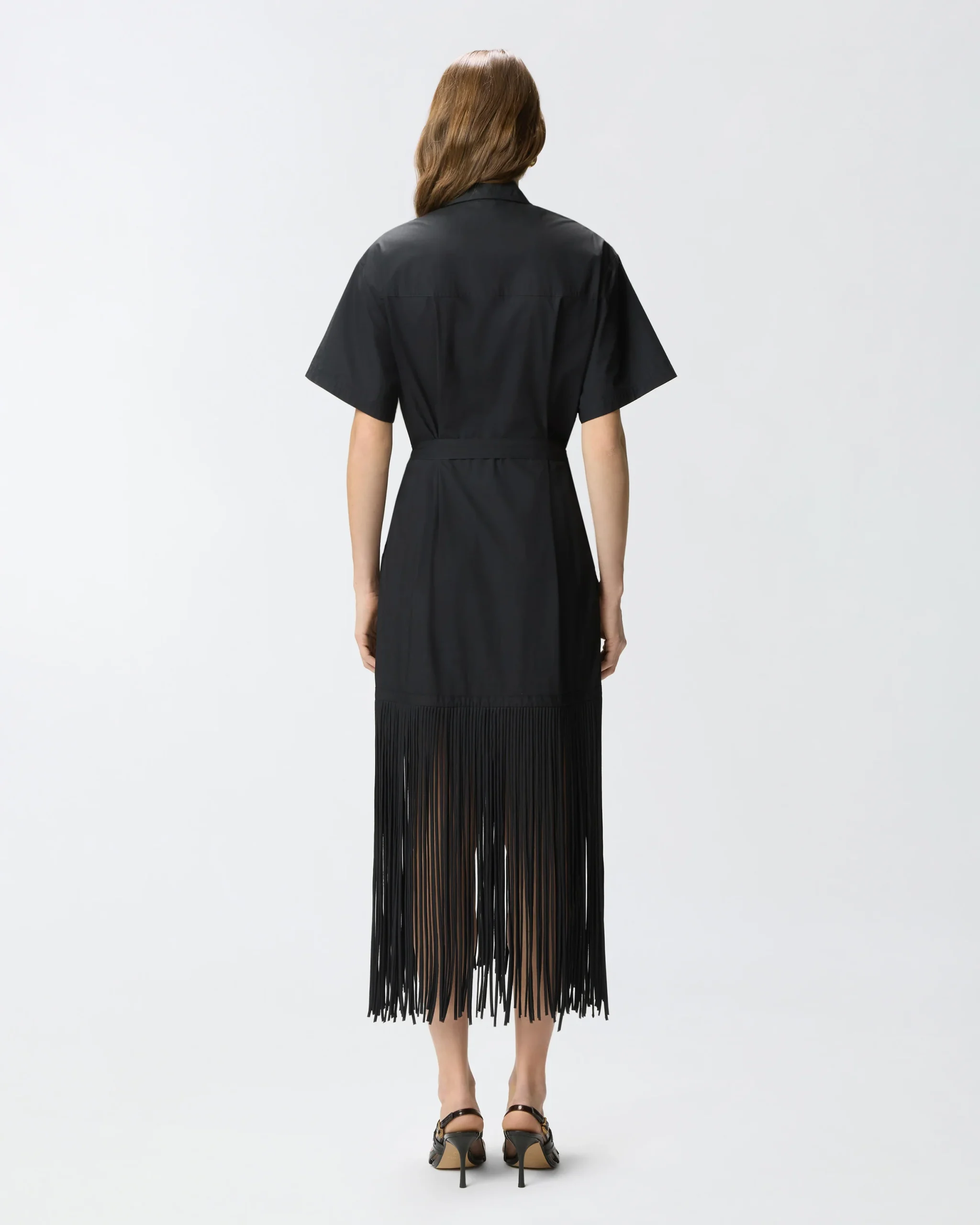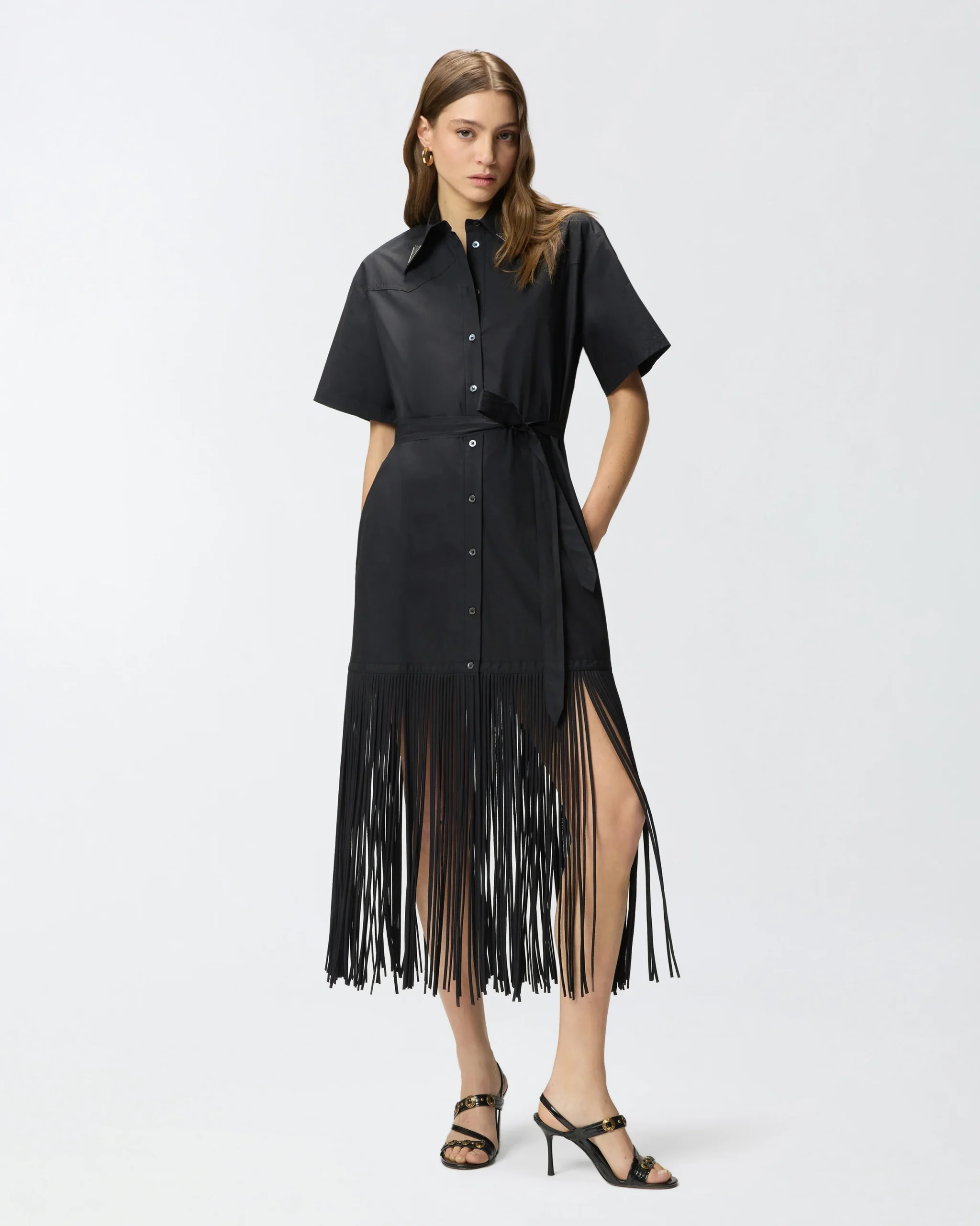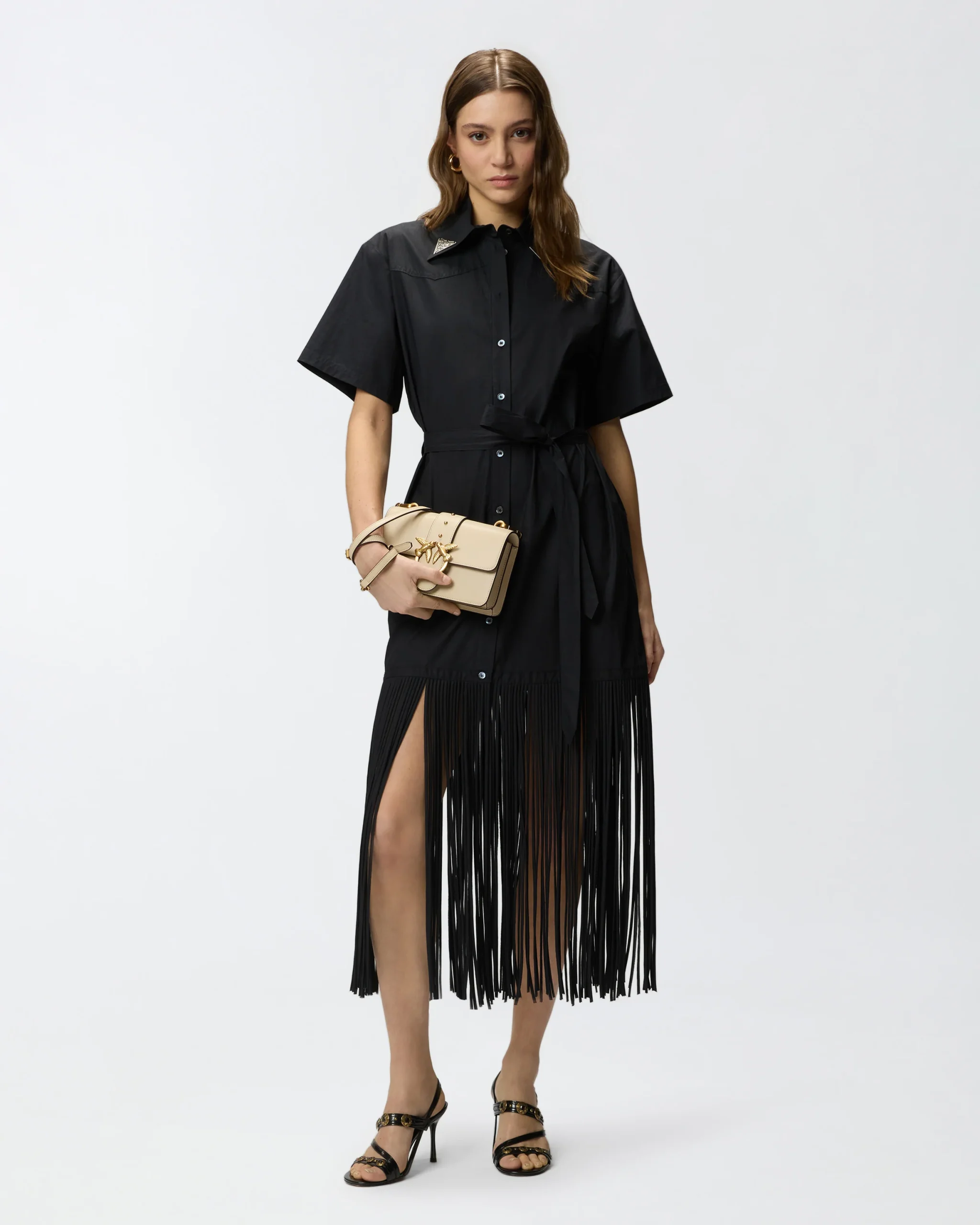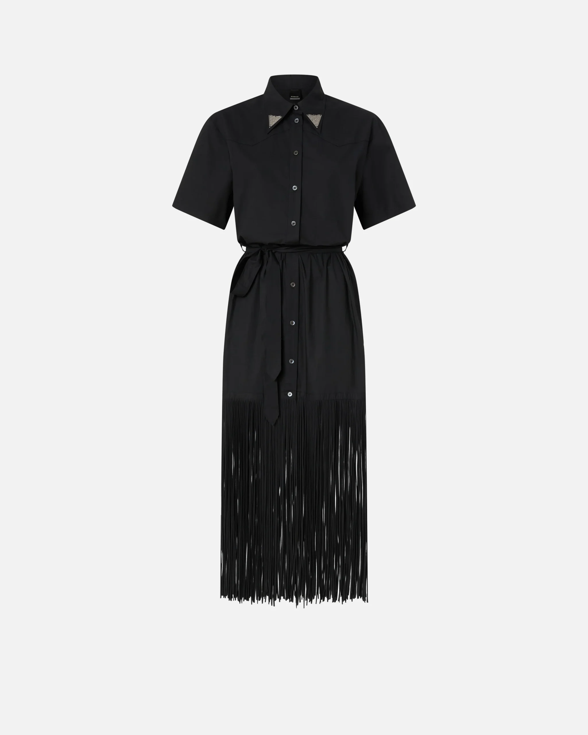 Μακρύ φόρεμα από καθαρή βαμβακερή ποπλίνα με δροσερή και ευχάριστη υφή, που ξεχωρίζει για το σεμιζιέ σχέδιο με εμφανή κουμπιά μπροστά, τα κοντά μανίκια μέχρι τον αγκώνα και τον γιακά σε στυλ πουκάμισου, διακοσμημένο με μεταλλικά στοιχεία εμπνευσμένα από το καουμπόικο στυλ, περίτεχνα διακοσμημένα. Η αναφορά στο country στυλ γίνεται ακόμη πιο έντονη με τα μακριά, σωληνωτά κρόσσια από λεπτό βαμβακερό βουάλ, που τονίζουν το τελείωμα και ακολουθούν φυσικά κάθε σας βήμα. Το φόρεμα, ιδανικό για πρωτότυπα και άνετα βραδινά looks με την υπογραφή της PINKO, ολοκληρώνεται με αφαιρούμενη, ασορτί κορδέλα που δένεται στη μέση, επιτρέποντάς την εξατομίκευση του τελικό styling.