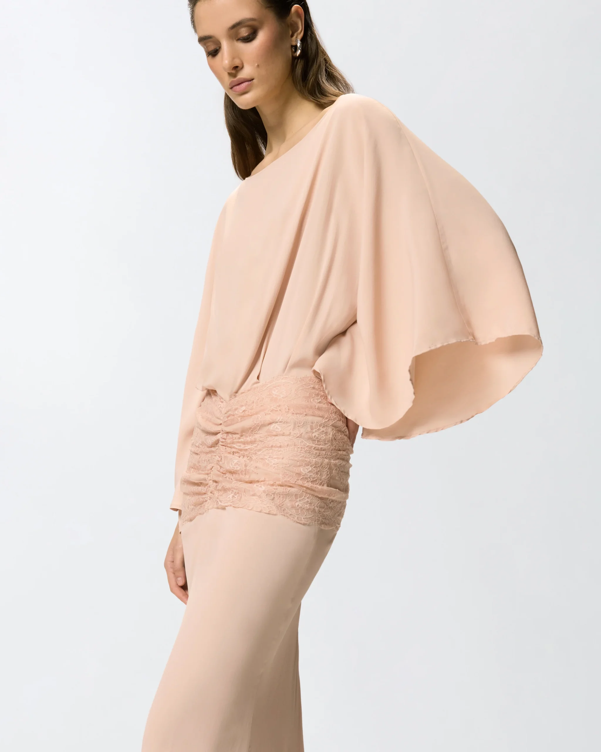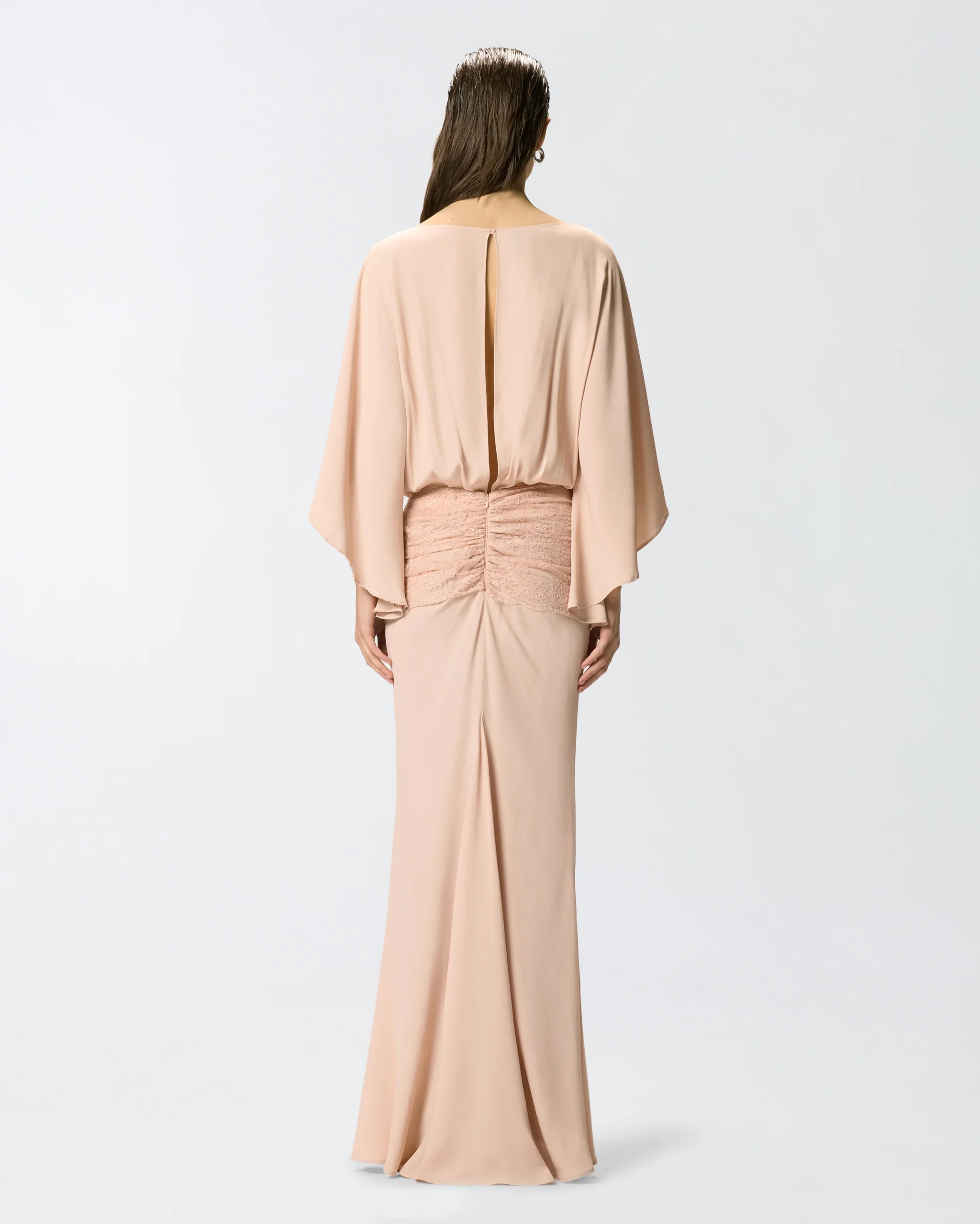 Μακρύ φόρεμα σε χυτή γραμμή από εκλεπτυσμένο σύμμεικτο μεταξωτό κρεπ ντε σιν με φαρδιά λαιμόκοψη χαμόγελο και μακριά ασύμμετρα μανίκια. Τέλειο ως πρωταγωνιστικό κομμάτι για επίσημα looks και ιδιαίτερες περιστάσεις, αυτό το φόρεμα διαθέτει χαλαρό επάνω μέρος με ραφή στη μέση σε στυλ μπλούζας και κάτω μέρος με κουφόπιετα μπροστά και πίσω, που εφαρμόζει απαλά στη σιλουέτα μέχρι το γόνατο και εβαζέ προς τα κάτω, εμπνευσμένο από τα φορέματα σε γραμμή «γοργόνας». Αυτό που κάνει το φόρεμα ακόμη πιο ξεχωριστό είναι οι λεπτομέρειες από δαντέλα, σαγηνευτικές χάρη στο παιχνίδι των διαφανειών, που διακοσμούν τη μέση σαν μια διακριτική, ντραπέ ζώνη με σούρες. Το κλείσιμο με φερμουάρ πίσω στο σημείο όπου ξεκινά το κάτω μέρος, συμπληρώνεται με ένα μικρό κουμπάκι πίσω από τον λαιμό, από όπου ξεκινά ένα μακρύ άνοιγμα που διατρέχει το κέντρο της πλάτης, για μια διακριτική πινελιά αισθησιακής γοητείας.