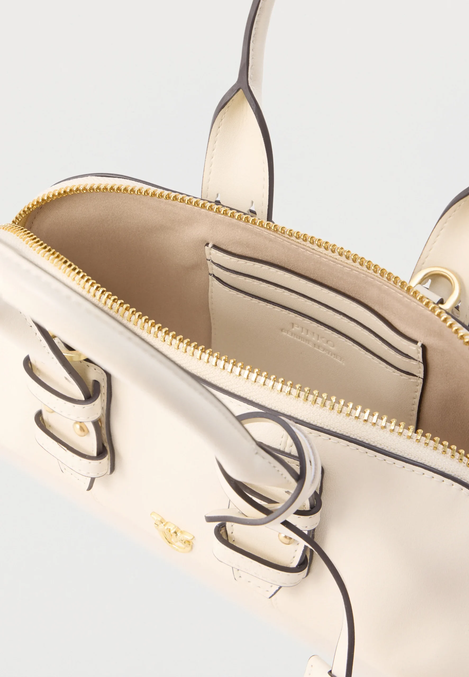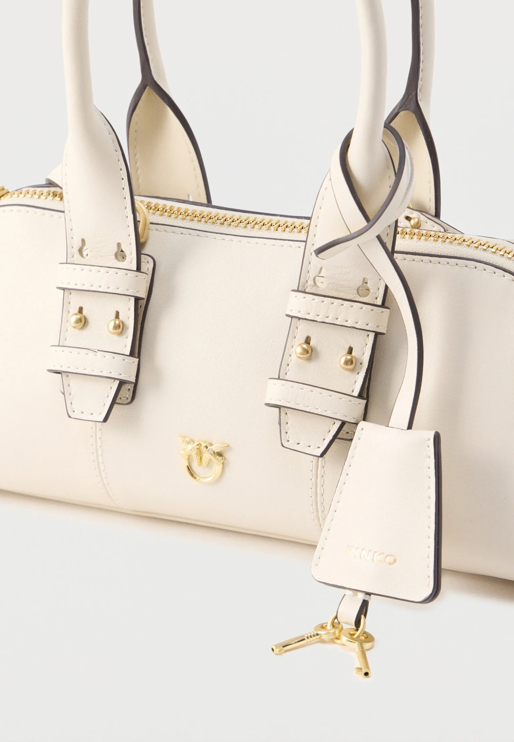 Τσάντα χειρός bowling Escape Bag μικρού μεγέθους από μαλακό δέρμα, με βαμβακερή φόδρα και εσωτερική τσέπη στο τοίχωμα με θήκη για κάρτες. Το ρυθμιζόμενο και αφαιρούμενο δερμάτινο λουρί και το χερούλι για μεταφορά στο χέρι ή στον ώμο κάνουν την τσάντα εξαιρετικά εύχρηστη και πρακτική. Το επάνω μέρος κλείνει με φερμουάρ διπλής κατεύθυνσης και είναι διακοσμημένο με μια ξεχωριστή λεπτομέρεια: ένα λουκέτο με το εμβληματικό λογότυπο Love Birds, το οποίο ανοίγει και κλείνει με το κλειδί που περιέχεται στο δερμάτινο κρεμαστό διακοσμητικό που συνοδεύει την τσάντα. Ενεργοποιήστε την τσάντα σας PINKO: επαληθεύστε τη γνησιότητα του προϊόντος σας και αποκτήστε πρόσβαση στην εξατομικευμένη εμπειρία πλησιάζοντας το smartphone σας στο κέντημα Love Birds στην πίσω πλευρά της τσάντας!