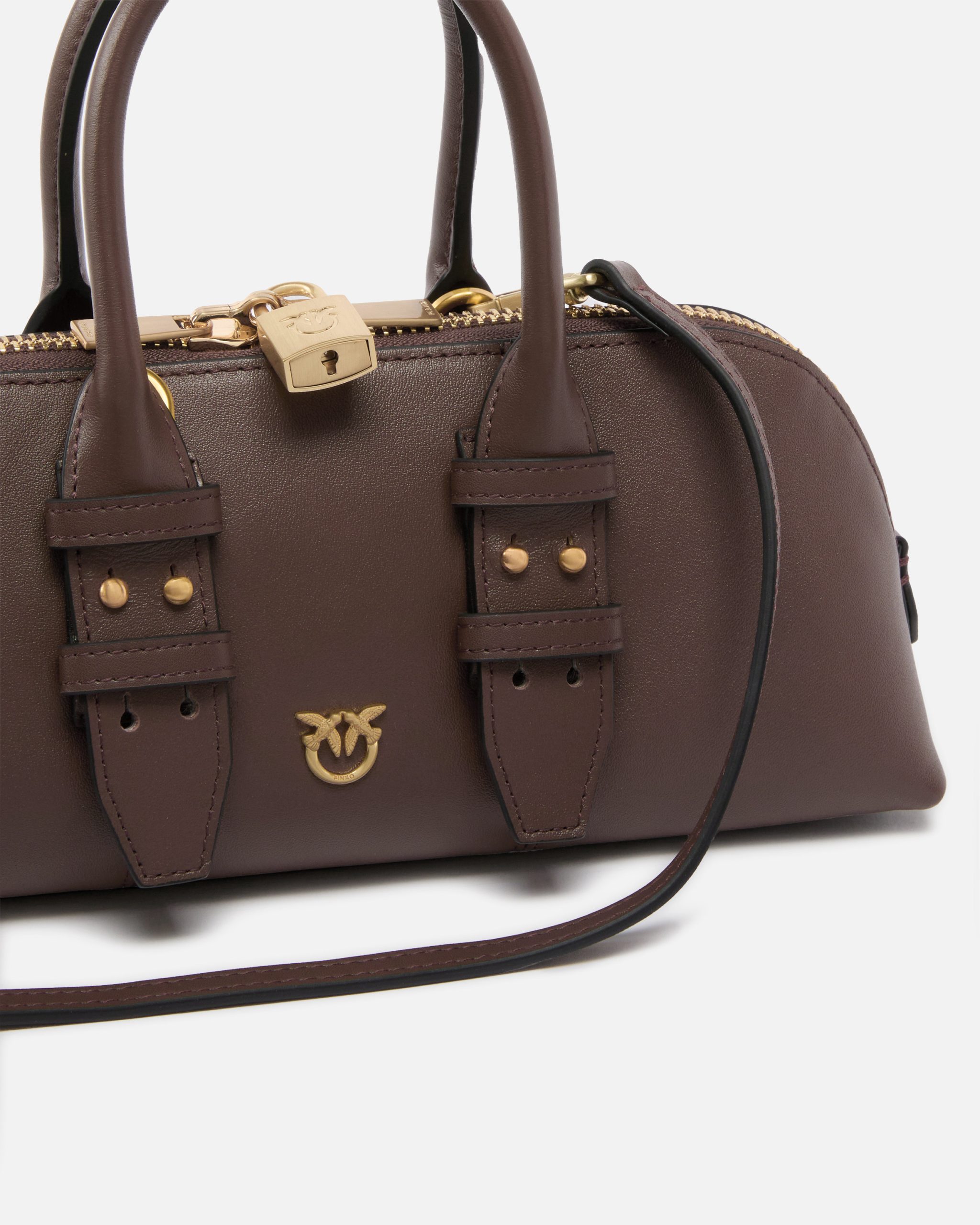 Τσάντα χειρός bowling Escape Bag Baguette μικρού μεγέθους από μαλακό δέρμα, με βαμβακερή φόδρα και εσωτερική τσέπη στο τοίχωμα με θήκη για κάρτες. Το ρυθμιζόμενο και αφαιρούμενο δερμάτινο λουρί και το χερούλι για μεταφορά στο χέρι ή στον ώμο κάνουν την τσάντα εξαιρετικά εύχρηστη και πρακτική. Το επάνω μέρος κλείνει με φερμουάρ διπλής κατεύθυνσης και είναι διακοσμημένο με μια ξεχωριστή λεπτομέρεια: ένα λουκέτο με το εμβληματικό λογότυπο Love Birds, το οποίο ανοίγει και κλείνει με το κλειδί που περιέχεται στο δερμάτινο κρεμαστό διακοσμητικό που συνοδεύει την τσάντα. Ενεργοποιήστε την τσάντα σας PINKO: επαληθεύστε τη γνησιότητα του προϊόντος σας και αποκτήστε πρόσβαση στην εξατομικευμένη εμπειρία πλησιάζοντας το smartphone σας στο κέντημα Love Birds στην πίσω πλευρά της τσάντας!