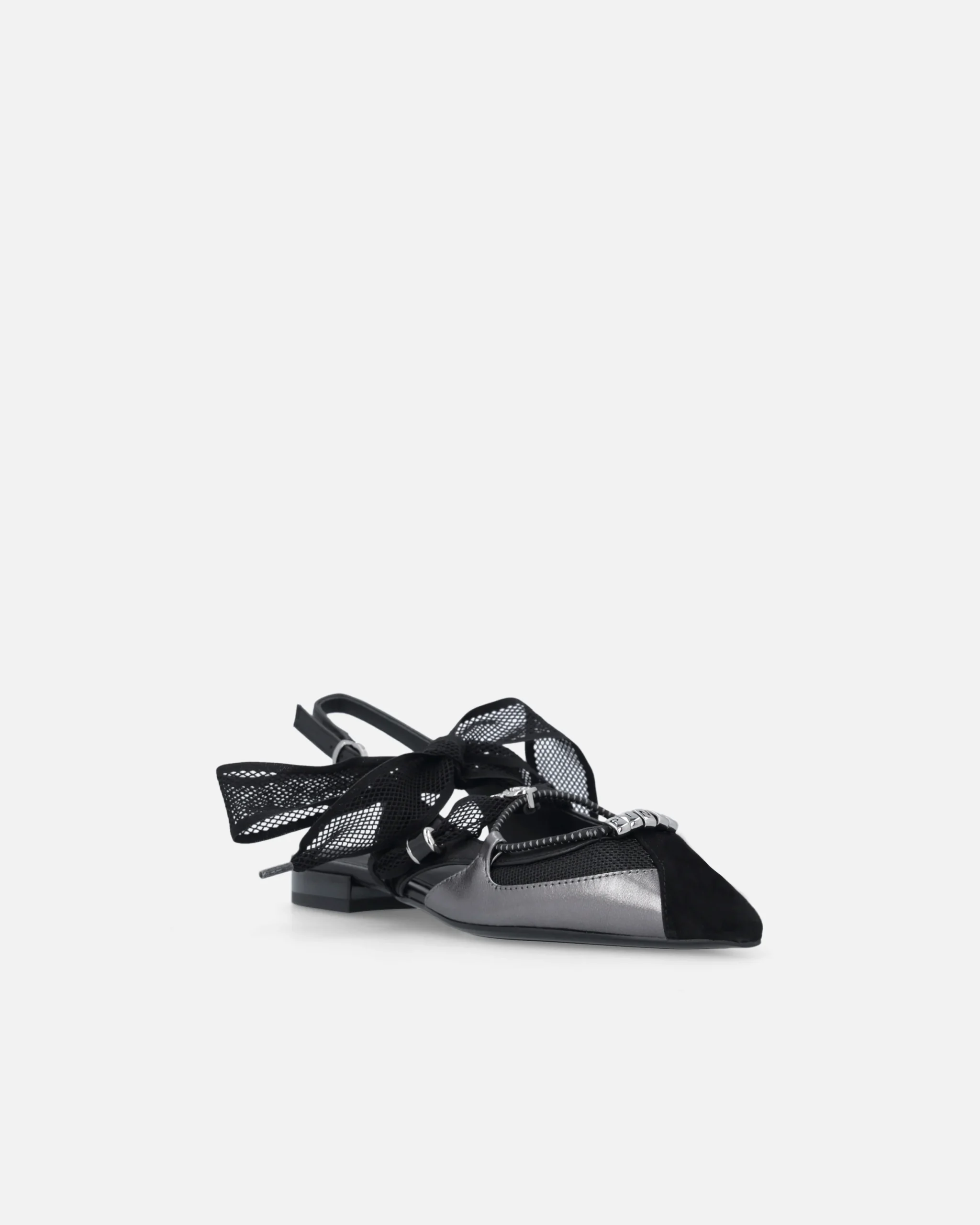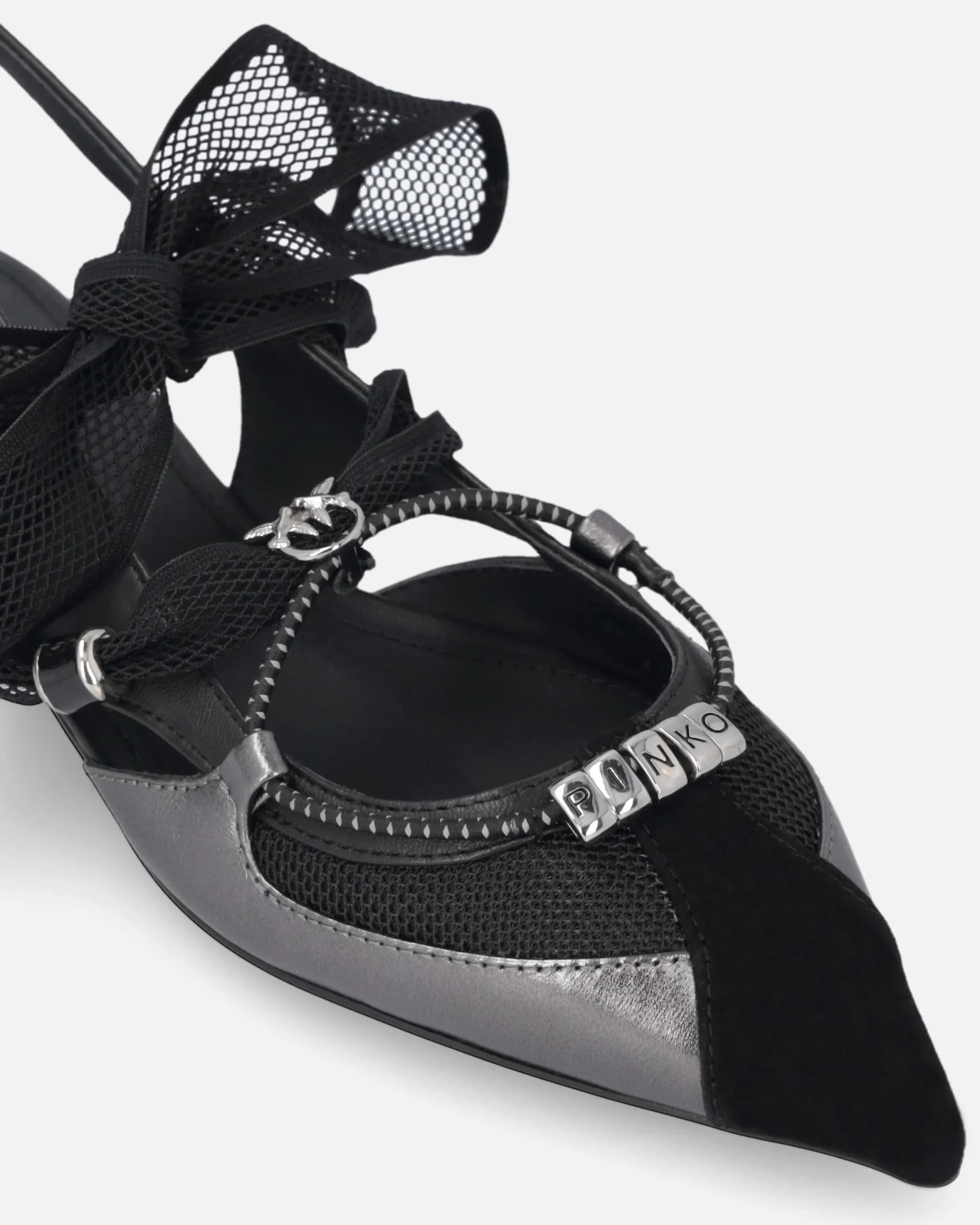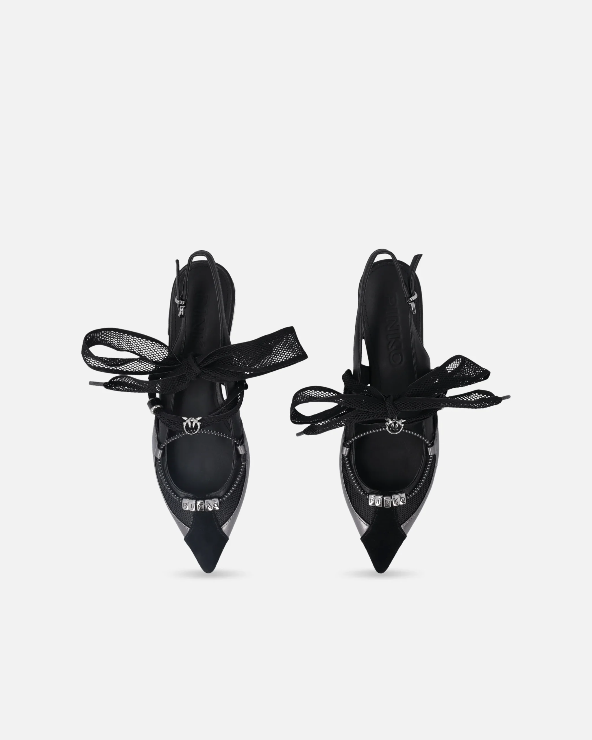 Αυτή την άνοιξη, χαρίστε στην γκαρνταρόμπα σας μια πινελιά εκλεπτυσμένης θηλυκότητας με αυτές τις flat slingback μπαλαρίνες, κατασκευασμένες από μαλακό, λείο δέρμα nappa, με σουέτ μύτη και τμήματα από mesh. Τα κορδόνια που δένονται σε φιόγκο, επίσης από mesh, είναι διακοσμημένα με χάντρες και μεταλλικό λογότυπο Love Birds, ενώ το κάτω κορδόνι, με διακριτικά γραφικά στοιχεία, διαθέτει μεταλλικούς κρίκους με γράμματα που σχηματίζουν το εμβληματικό λογότυπο PINKO. Οι μπαλαρίνες διαθέτουν κομψή, μακρόστενη γραμμή με μυτερή μύτη που προσδίδει φινέτσα, καθώς και επίπεδη σόλα που εξασφαλίζει ελαφρότητα και άνεση για καθημερινή χρήση χωρίς συμβιβασμούς στο στυλ. Ιδανικές τόσο για πρωινές όσο και για βραδινές εμφανίσεις, αυτές οι μπαλαρίνες σίγουρα δεν θα σας αφήσουν να περάσετε απαρατήρητη.