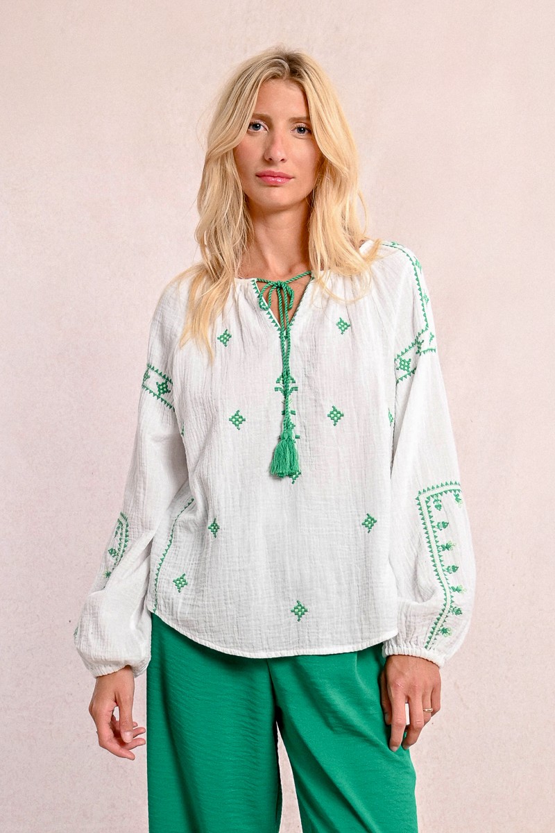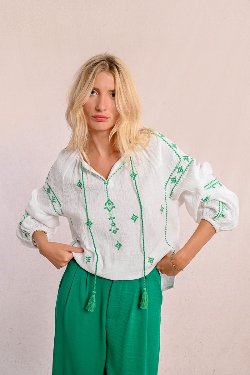 Γυναικεία μπλούζα σε off-white απόχρωση, από ανάλαφρο, φυσικό ύφασμα που προσφέρει δροσερή αίσθηση και άνεση καθ’ όλη τη διάρκεια της ημέρας. Ξεχωρίζει για το πράσινο κέντημα σε παραδοσιακό μοτίβο, που διακοσμεί το μπροστινό μέρος και τα μανίκια, χαρίζοντας αυθεντικό boho ύφος.