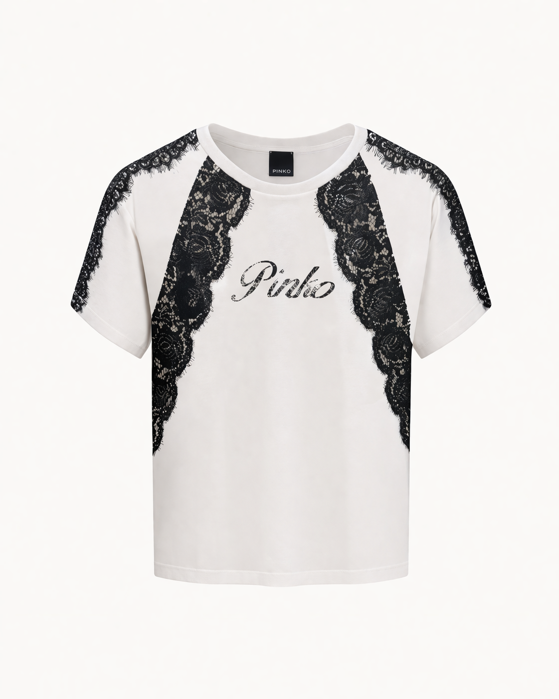 Κομψή υπόλευκη oversized μπλούζα Pinko με κοντό μανίκι, διακοσμημένη με εντυπωσιακές μαύρες δαντελένιες λεπτομέρειες στους ώμους και στο μπροστινό μέρος. Το χαρακτηριστικό logo στο στήθος ολοκληρώνει το σχέδιο και δίνει ξεχωριστό ύφος. Μια ιδιαίτερη επιλογή που συνδυάζει θηλυκότητα και μοντέρνα αισθητική, ιδανική για chic καθημερινές αλλά και πιο προσεγμένες εμφανίσεις.