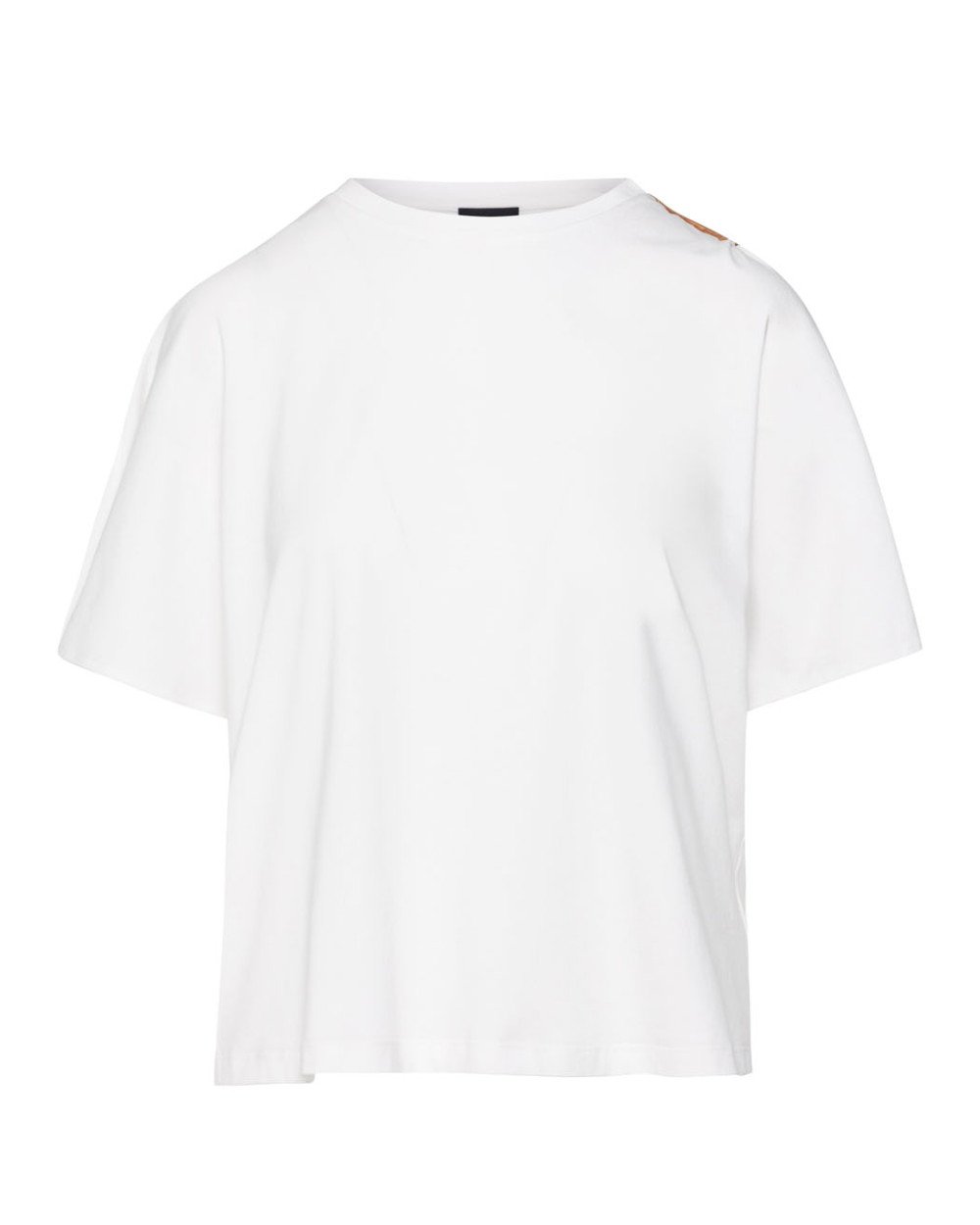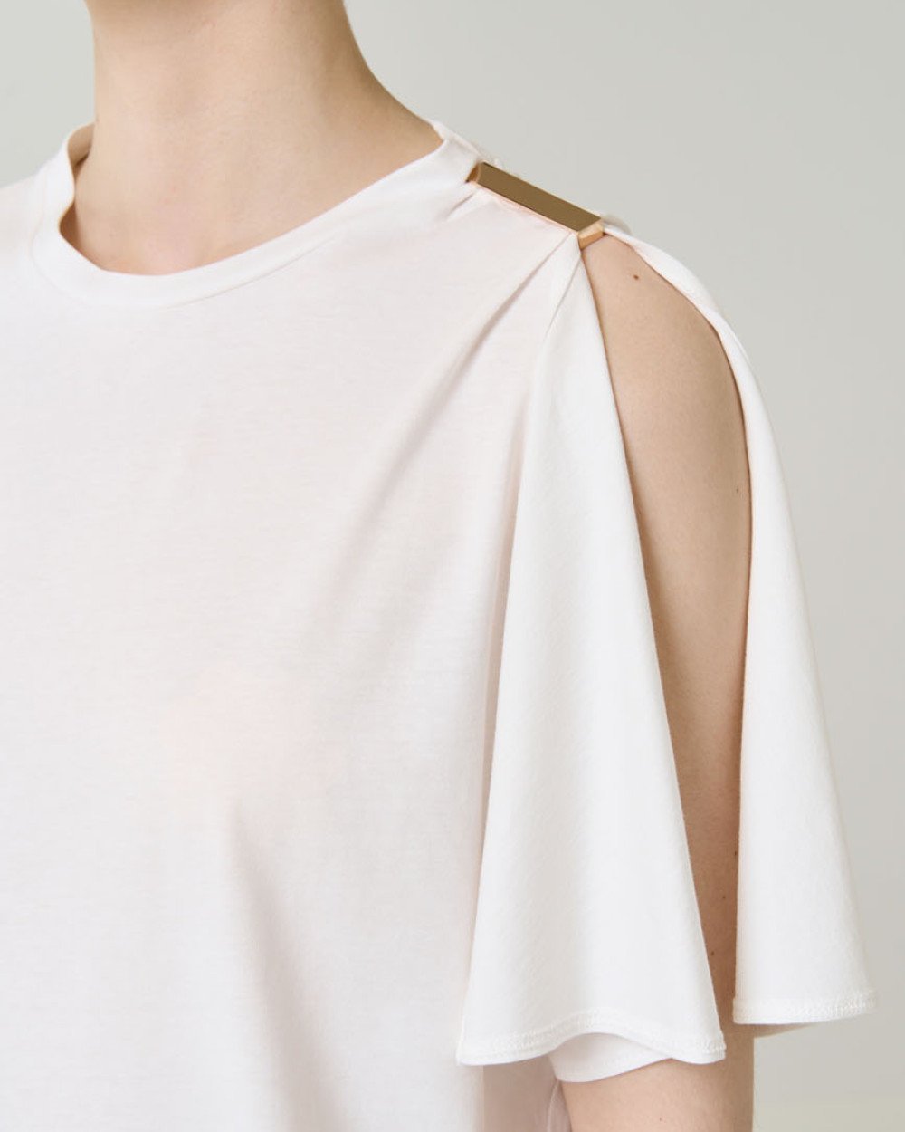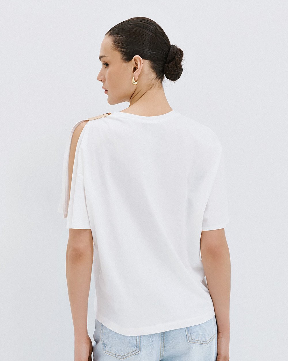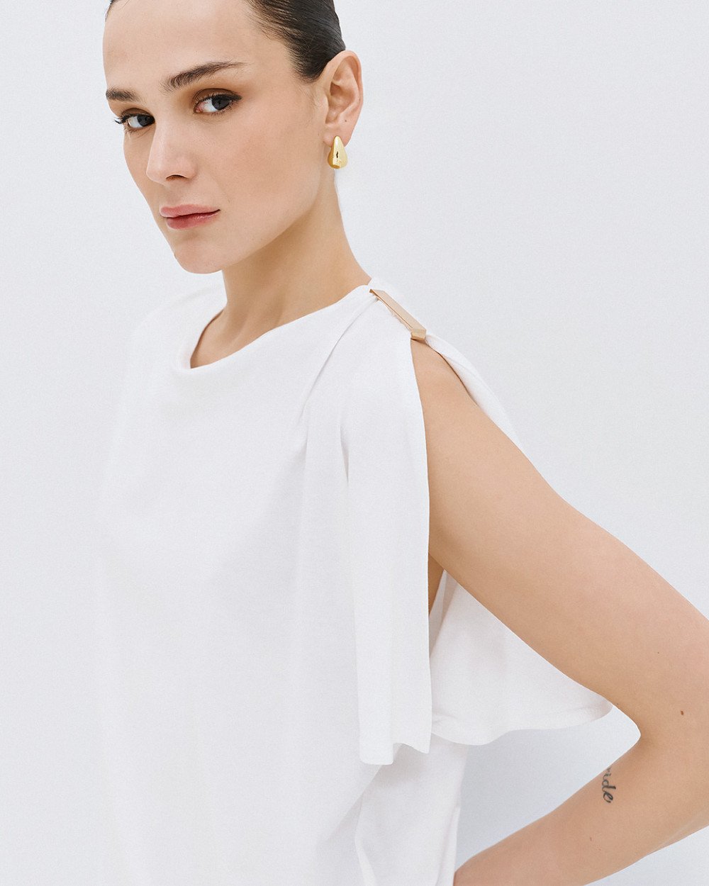 Βαμβακερή μπλούζα με στρογγυλή λαιμόκοψη και ασύμμετρα μανίκια. Διαθέτει μεταλλική λεπτομέρεια με σούρες στον έναν ώμο.