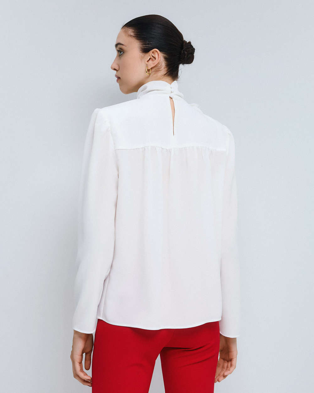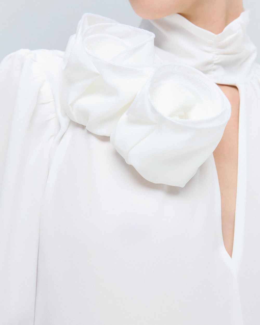 Μπλούζα με ψηλό λαιμό και V άνοιγμα. Διαθέτει μακριά μανίκια με βάτες, διακοσμητικά λουλούδια και λεπτομέρειες από σούρες. Ιδανική επιλογή για στιλάτες επίσημες εμφανίσεις.