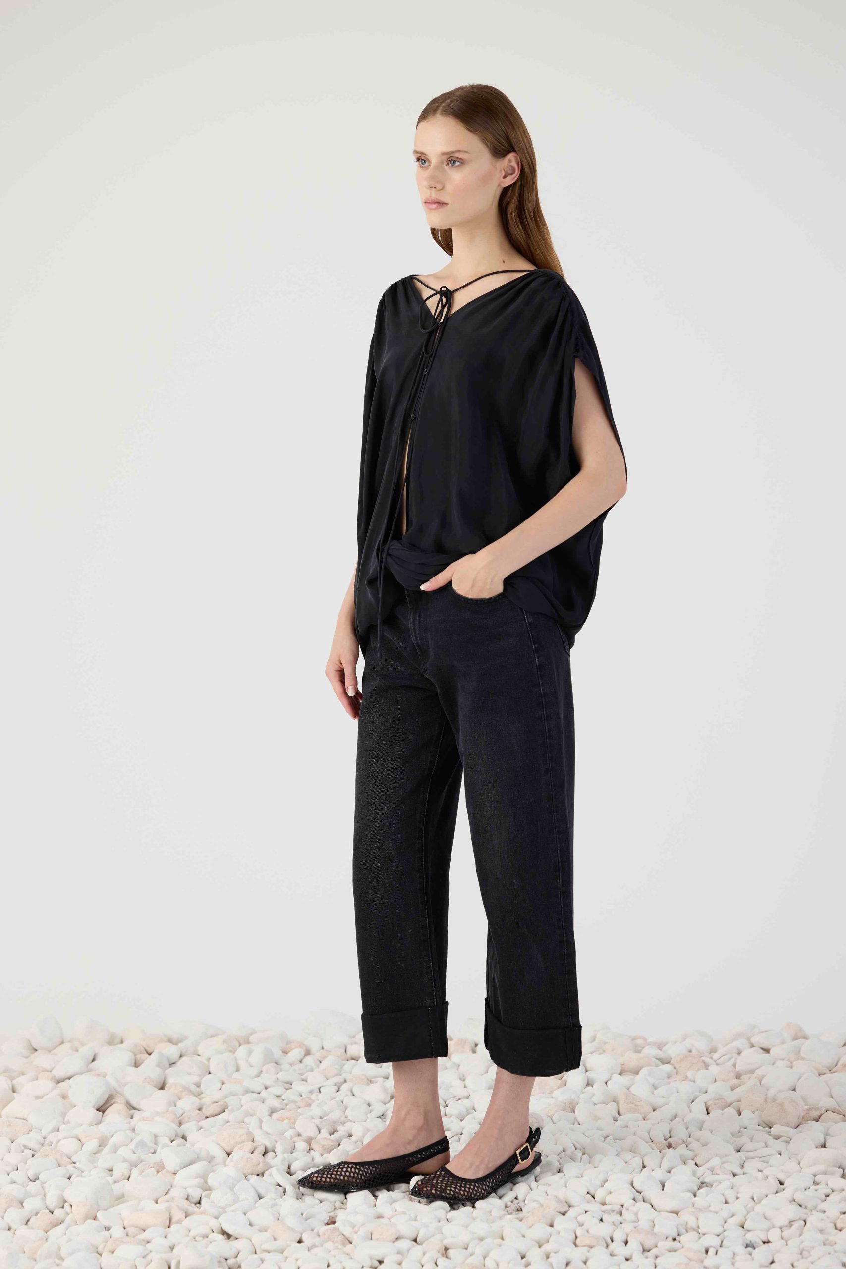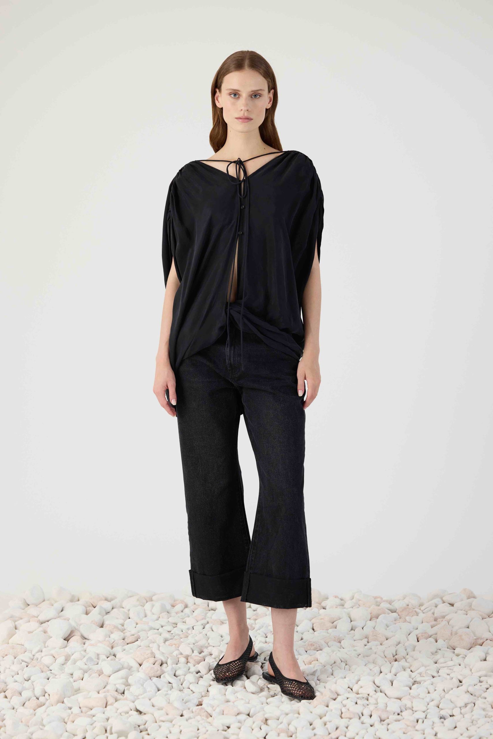 Μια statement μπλούζα που αποπνέει σύγχρονη θηλυκότητα και ανεπιτήδευτη κομψότητα. Σε ρευστή, αέρινη ποιότητα με απαλή υφή και εντυπωσιακή πτώση, αγκαλιάζει το σώμα χαρίζοντας χαλαρή αλλά εκλεπτυσμένη σιλουέτα.