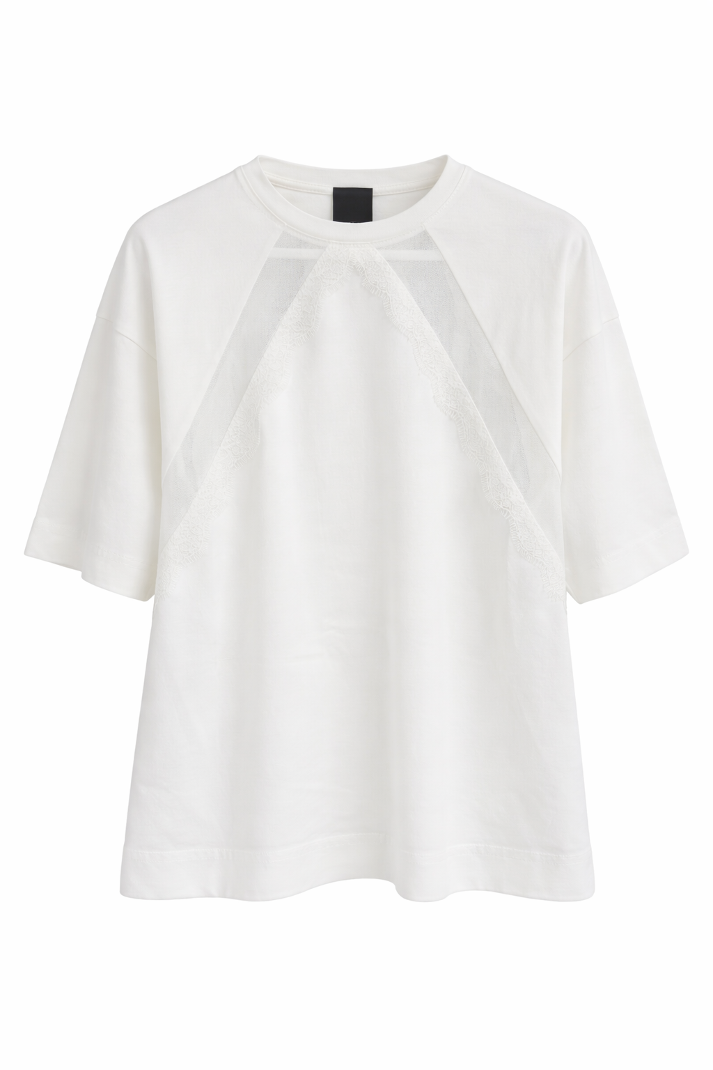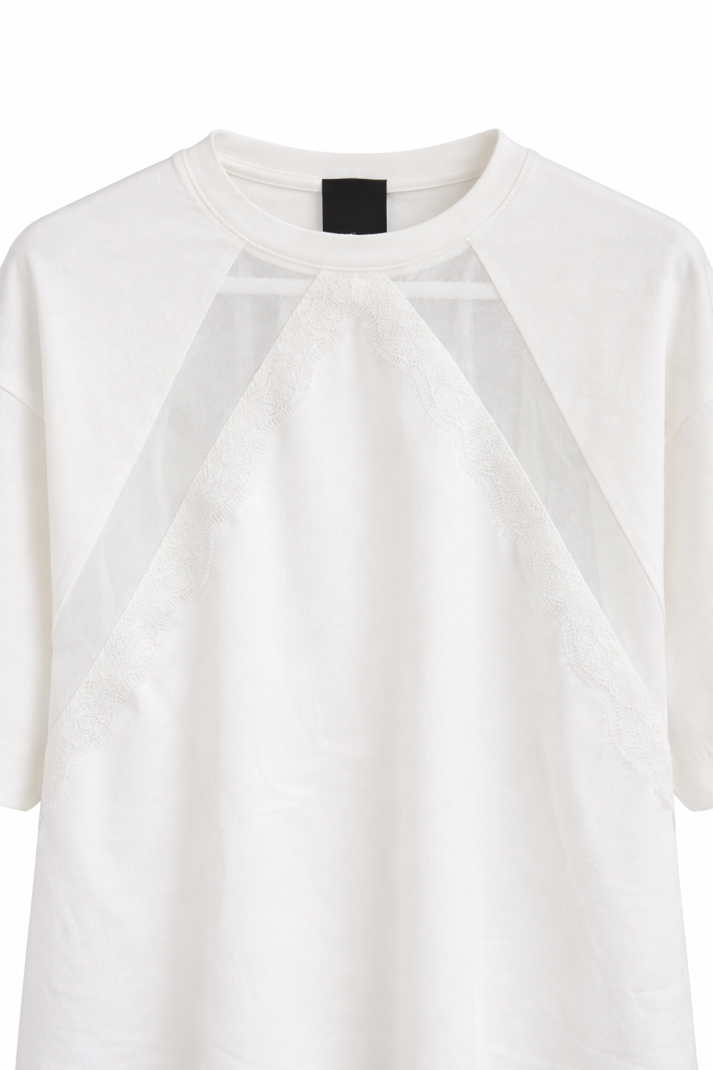 Λευκό oversized T-shirt με μοντέρνο design που συνδυάζει απαλό βαμβακερό ύφασμα με διαφάνειες από τούλι και φίνα δαντελένια τελειώματα. Το ιδιαίτερο γεωμετρικό κόψιμο στο μπροστινό και στο πίσω μέρος δημιουργεί ένα κομψό παιχνίδι υφών, προσθέτοντας θηλυκότητα σε ένα minimal κομμάτι.