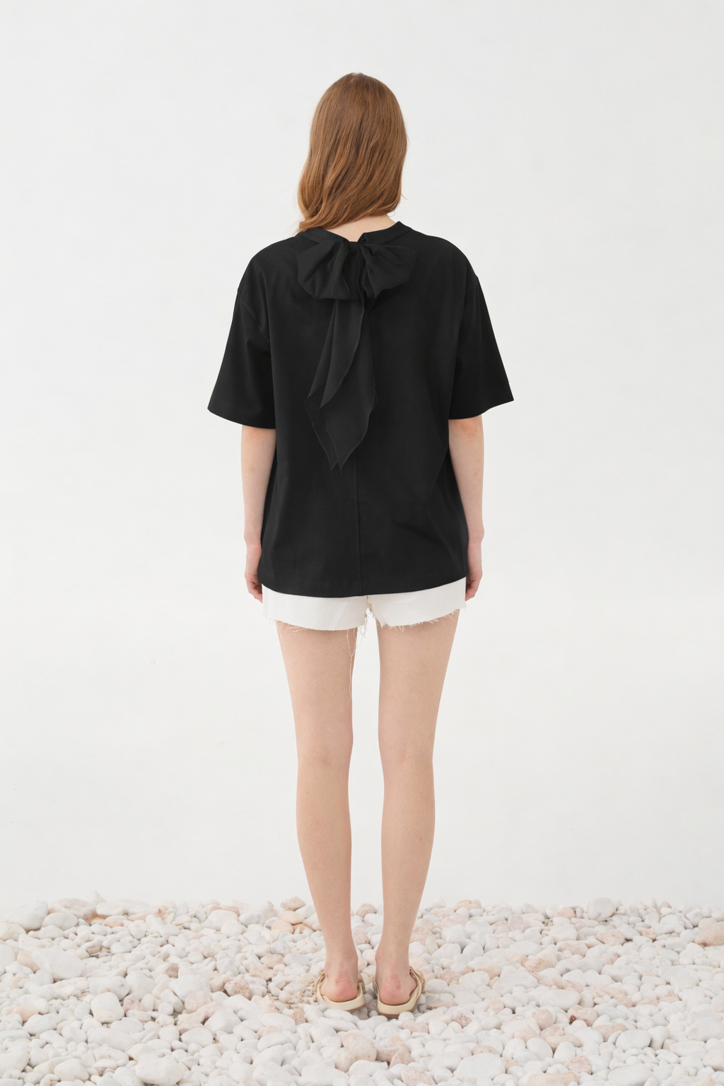 Η διαφορά βρίσκεται στην πλάτη: ο εντυπωσιακός φιόγκος προσθέτει θηλυκότητα και κομψότητα, αναβαθμίζοντας το minimal design σε ένα σύγχρονο statement κομμάτι. Το ύφασμα έχει απαλή υφή και όμορφη πτώση, χαρίζοντας χαλαρή αλλά προσεγμένη σιλουέτα.