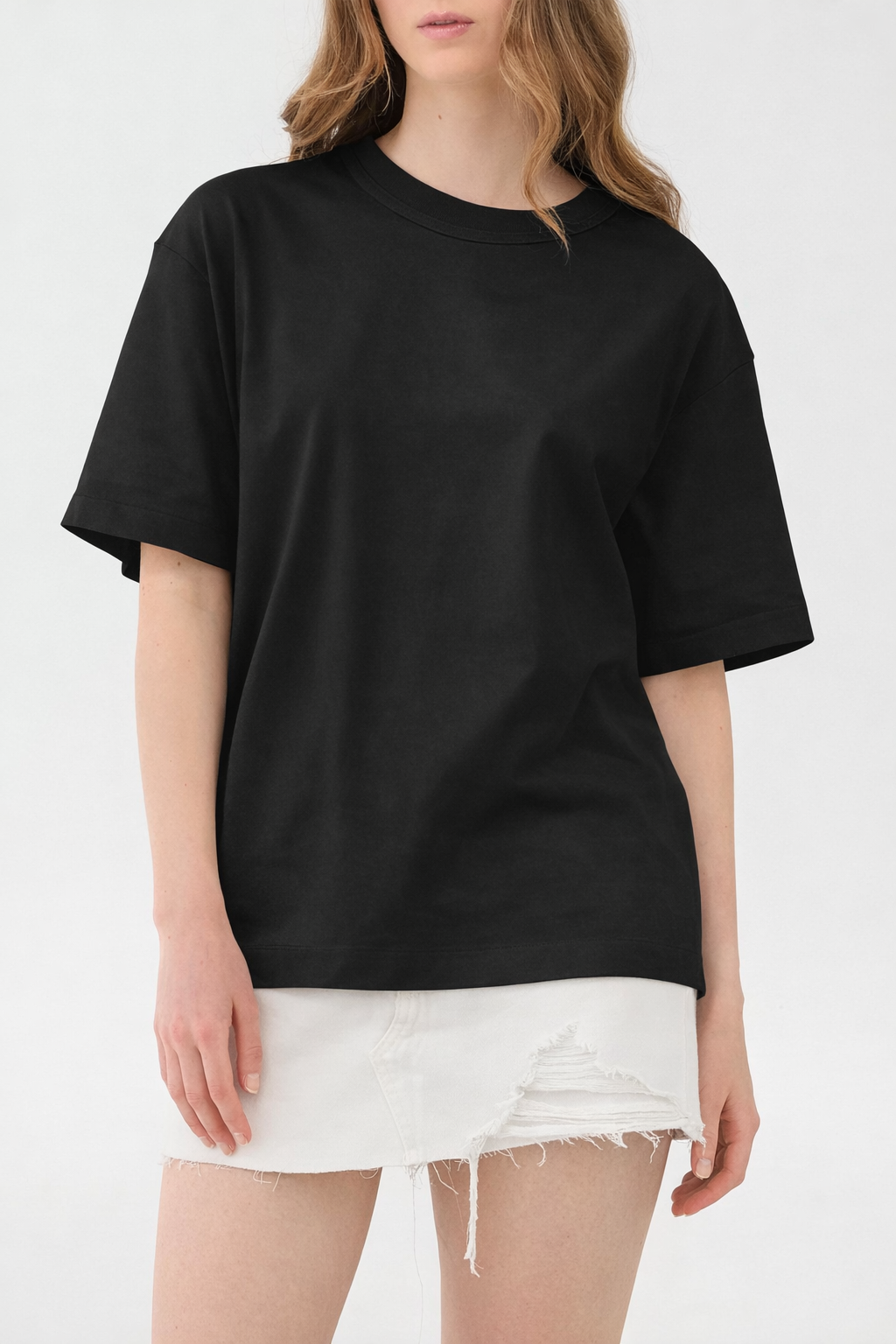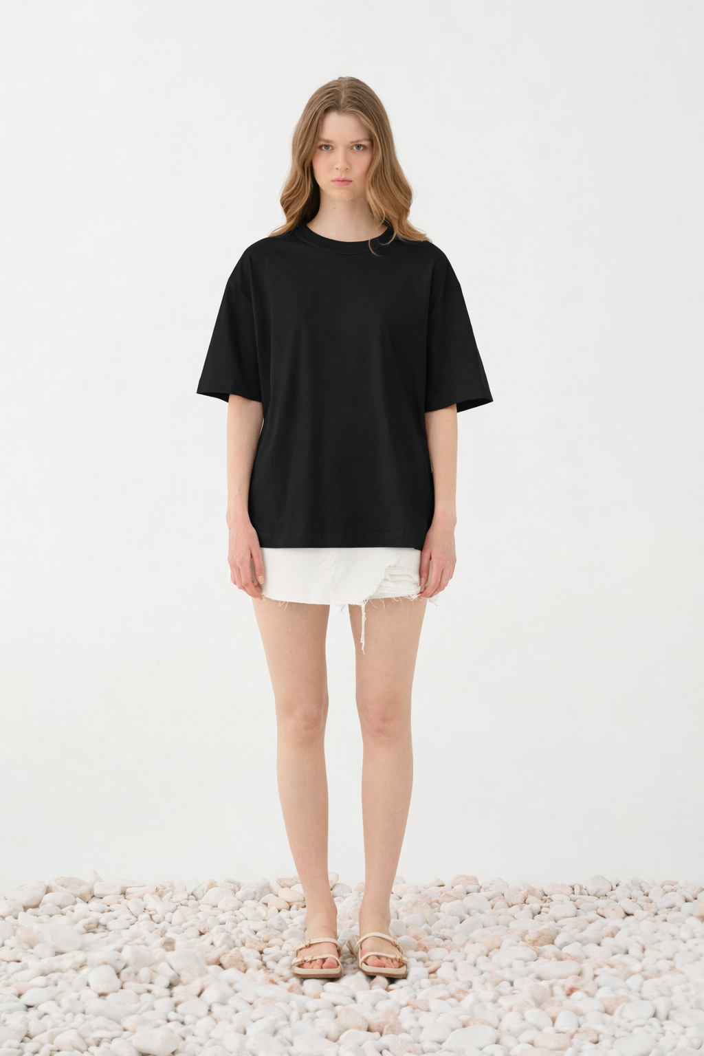 Το απόλυτο μαύρο t-shirt με fashion twist. Σε άνετη oversized γραμμή, με μανίκι μέχρι τον αγκώνα και κλασική στρογγυλή λαιμόκοψη, αποτελεί τη βάση για αμέτρητους συνδυασμούς.