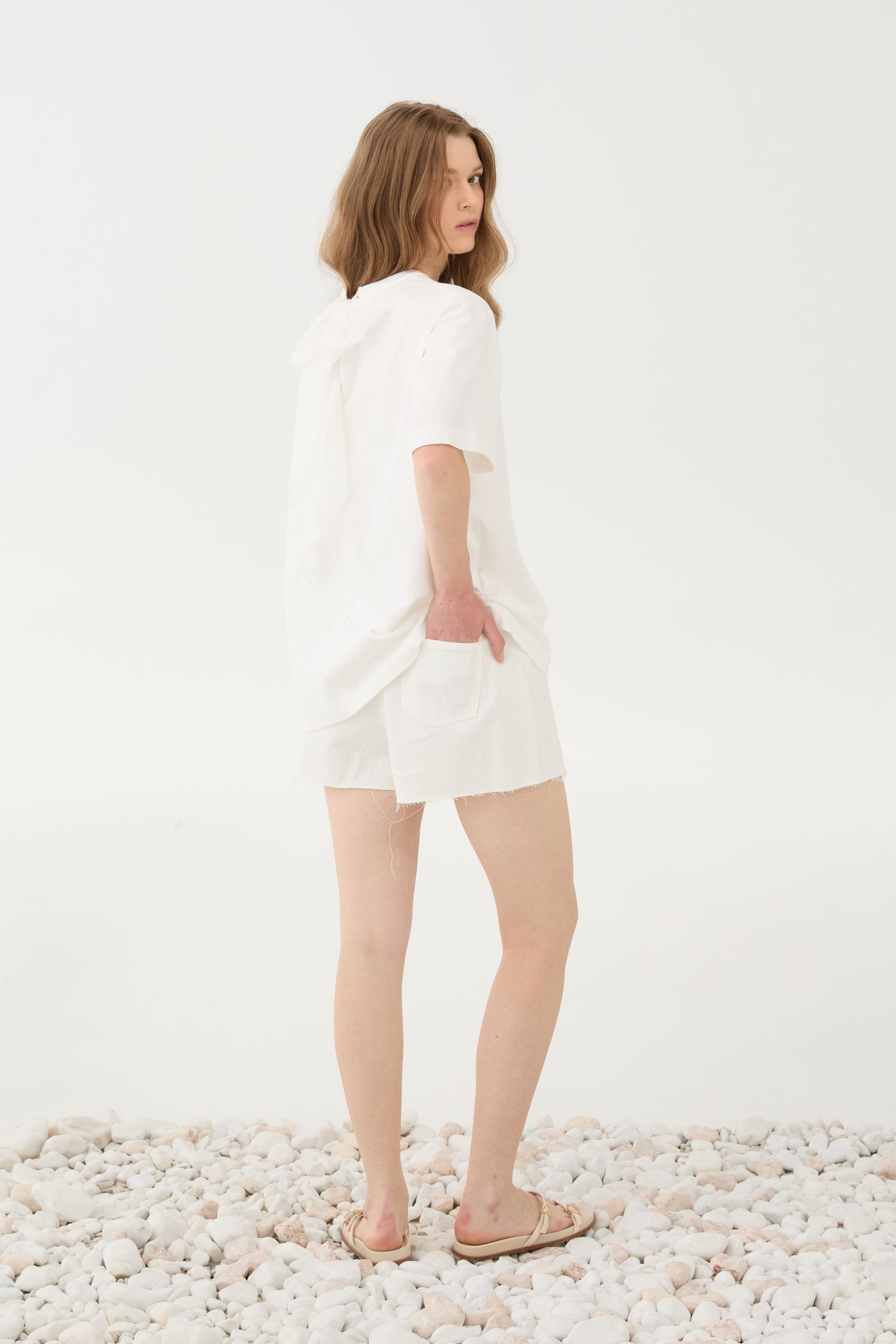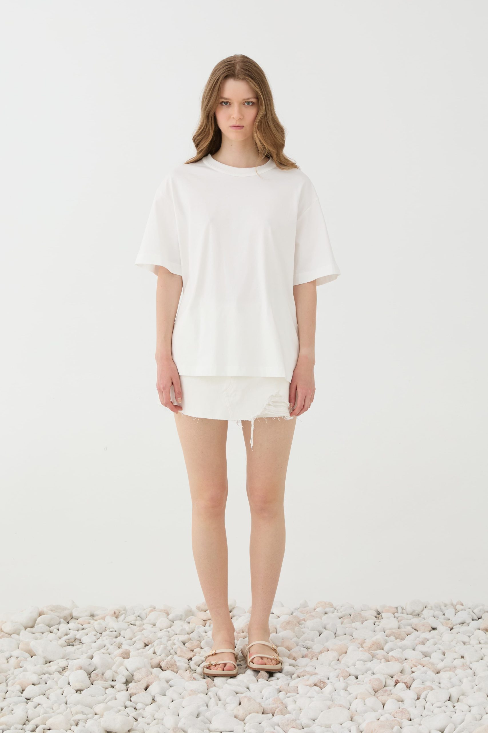 Ένα minimal κομμάτι με ιδιαίτερη λεπτομέρεια που κάνει τη διαφορά. Το λευκό oversized t-shirt διαθέτει άνετη, χαλαρή γραμμή, μανίκι μέχρι τον αγκώνα και στρογγυλή λαιμόκοψη, προσφέροντας καθημερινή άνεση με καθαρή αισθητική.
