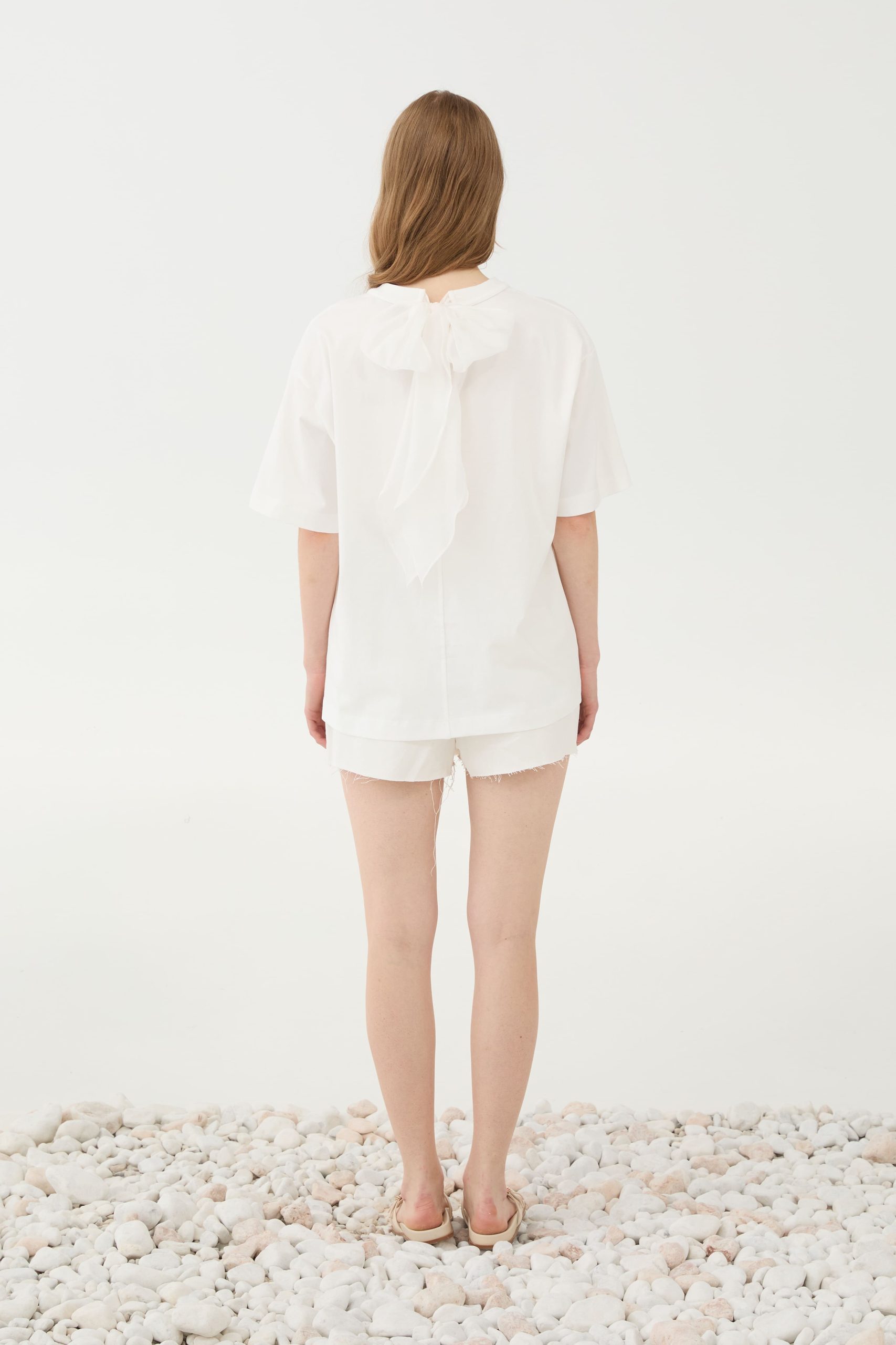 Η έκπληξη βρίσκεται στην πλάτη, όπου ο διακριτικός φιόγκος προσθέτει μια ρομαντική και θηλυκή πινελιά, μετατρέποντας ένα basic κομμάτι σε statement επιλογή. Το ύφασμα έχει απαλή υφή και σωστή πτώση, χωρίς να διαγράφει.