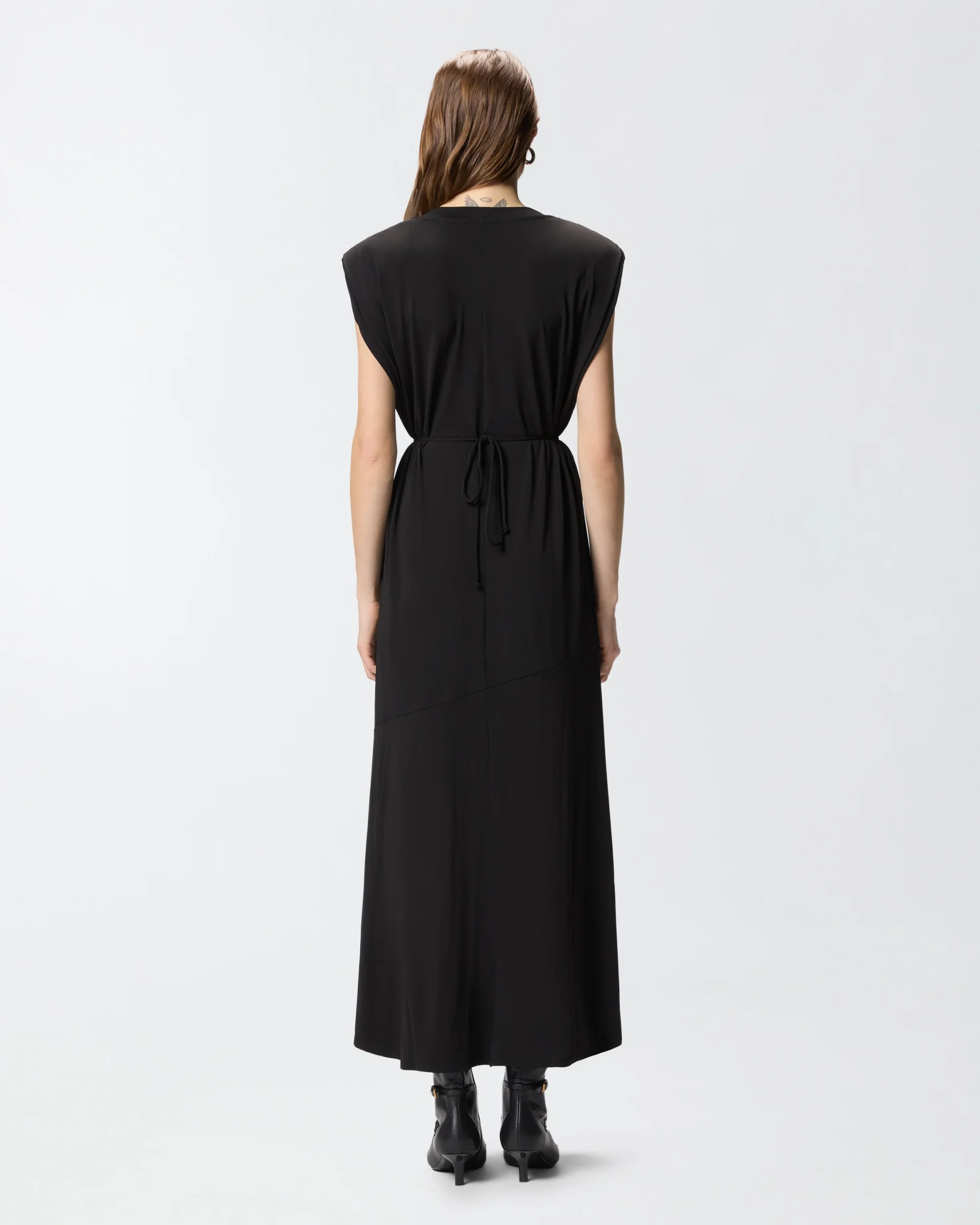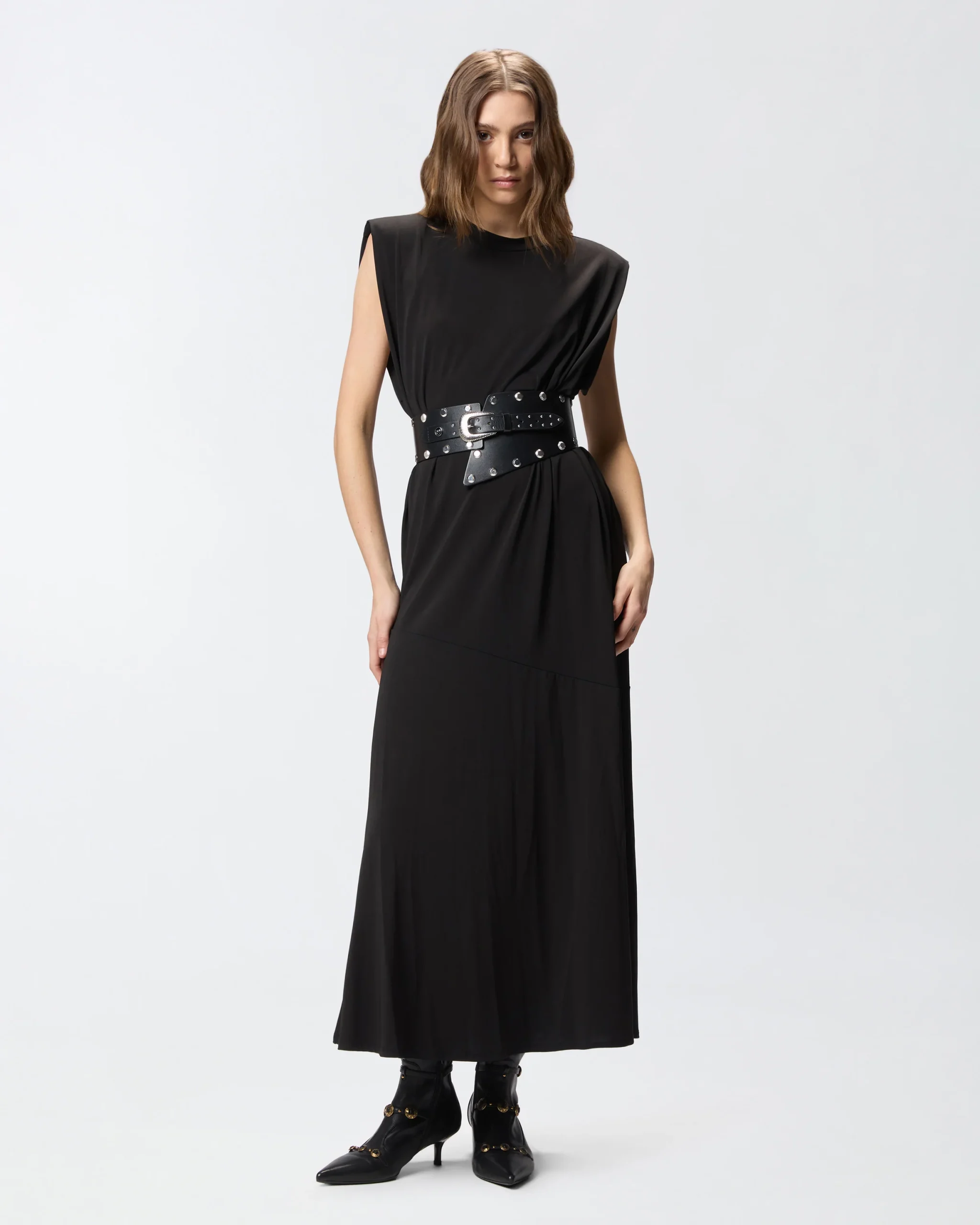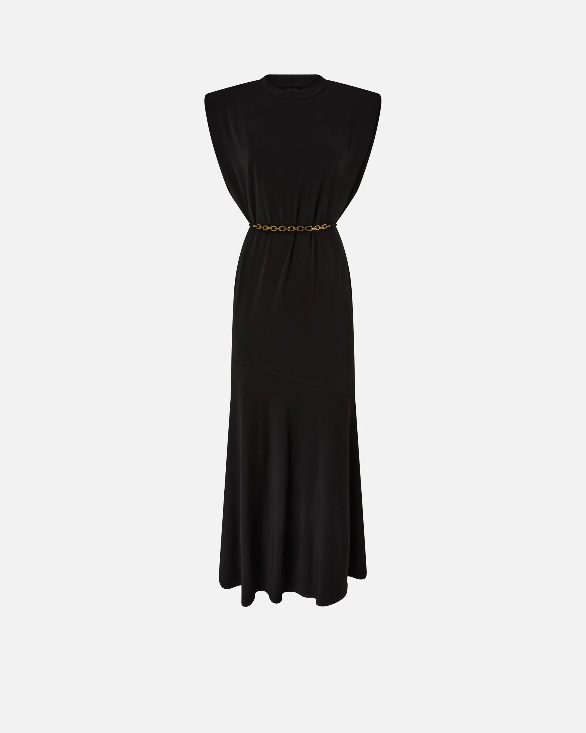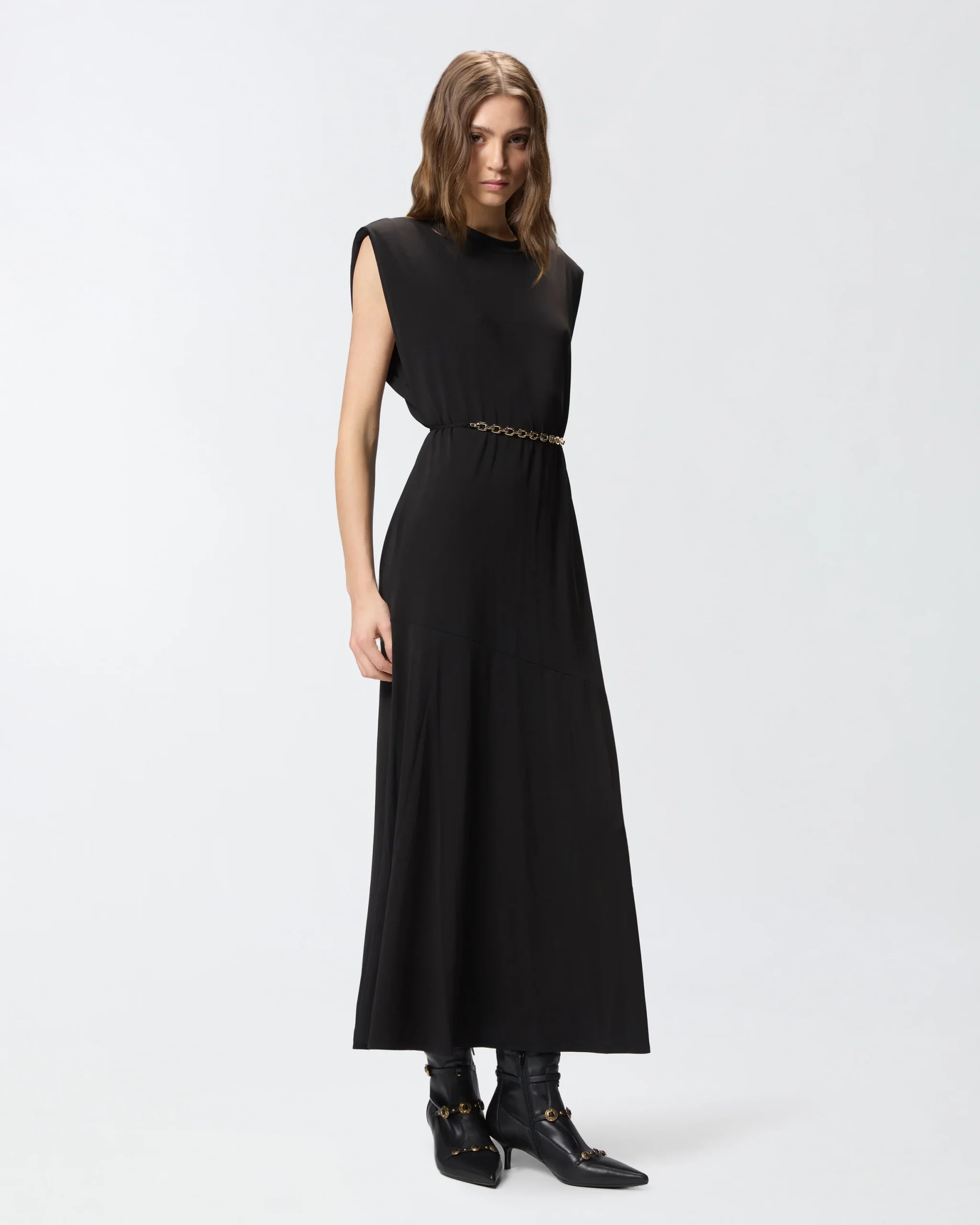 Μακρύ φόρεμα με αμάνικη γραμμή και στρογγυλή λαιμόκοψη, κατασκευασμένο από ελαστικό κρεπ ζέρσεϊ με λαμπερή υφή παρόμοια με του μεταξιού. Διαθέτει χαλαρή γραμμή, που τονίζεται από το κυματιστό τελείωμα στο κάτω μέρος, και ολοκληρώνεται με αφαιρούμενη ζώνη στη μέση με μπροστινό μέρος από ύφασμα που δένεται, και πίσω μέρος από αλυσίδα, για μια δυναμική λεπτομέρεια που εκφράζει το DNA της PINKO. Αυτό το φόρεμα είναι ιδανικό τόσο για ένα θηλυκό καθημερινό look με ένα ζευγάρι χαμηλά παπούτσια, όσο και για ένα ιδιαίτερο βραδινό ντύσιμο με ένα ζευγάρι γόβες.