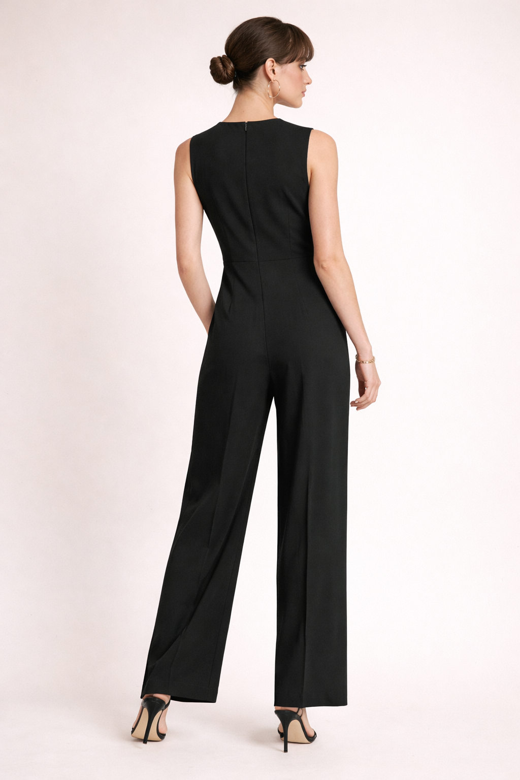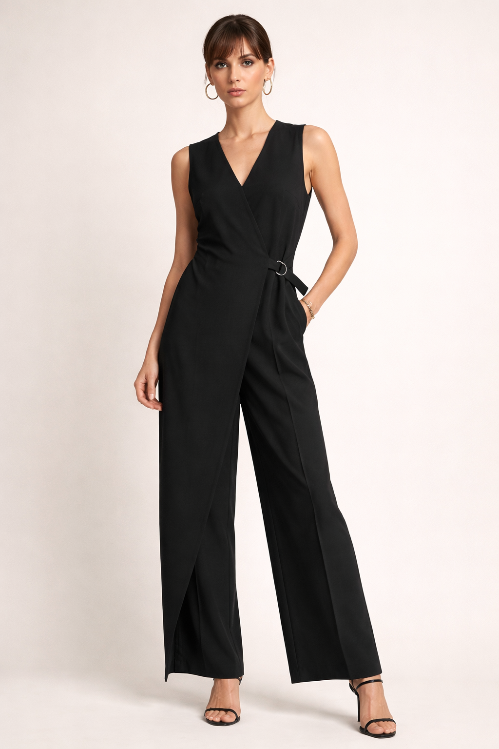 Κομψή μαύρη φόρμα με αμάνικο σχέδιο και θηλυκό V ντεκολτέ, που αγκαλιάζει όμορφα τη σιλουέτα. Το κρουαζέ κόψιμο στο μπροστινό μέρος συνδυάζεται με ζώνη που δένει στο πλάι και μεταλλική αγκράφα, τονίζοντας τη μέση με διακριτικό αλλά elegant τρόπο.