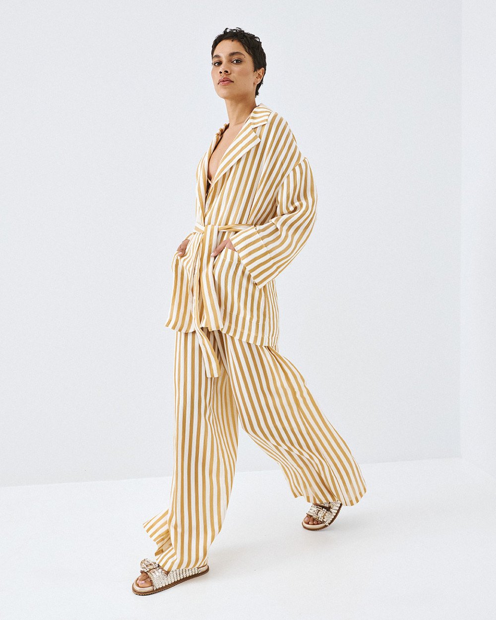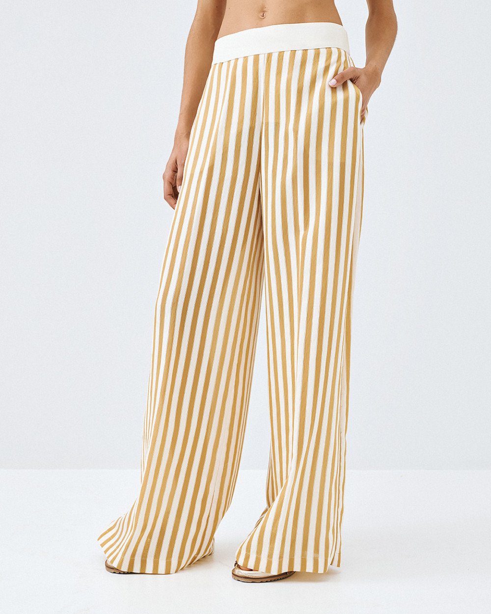 Ριγέ wide-leg παντελόνα με πλαϊνές τσέπες και ελαστική μέση. Διαθέτει αποσπώμενο σορτς-μεσοφόρι.