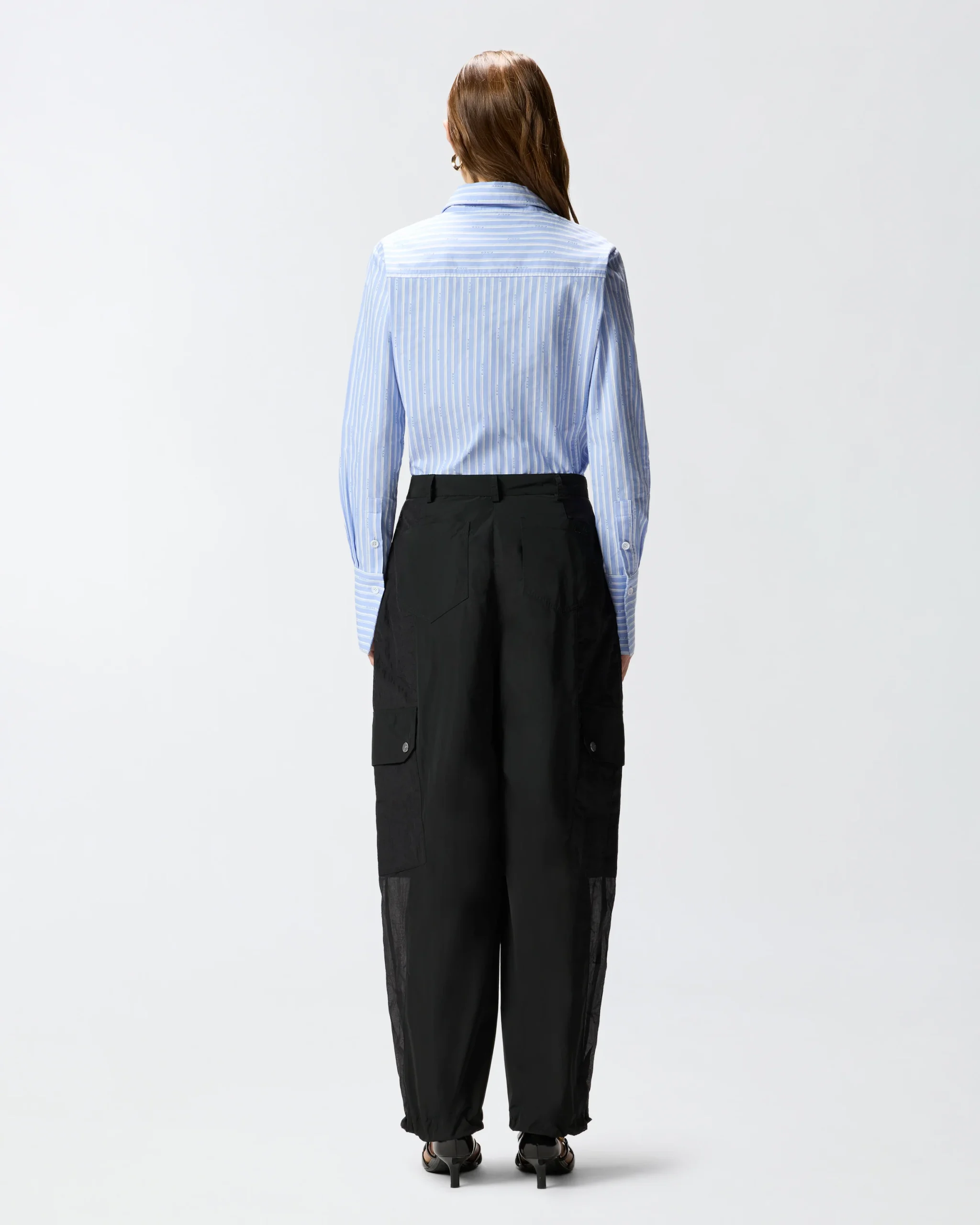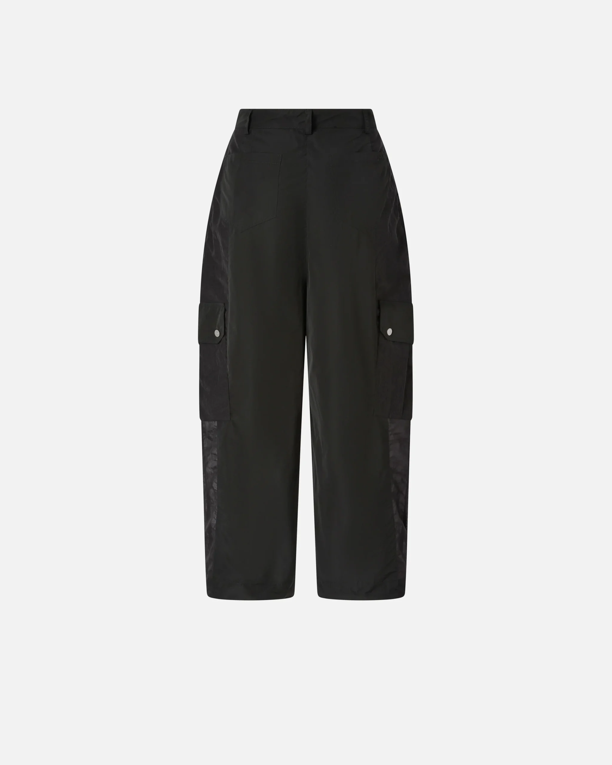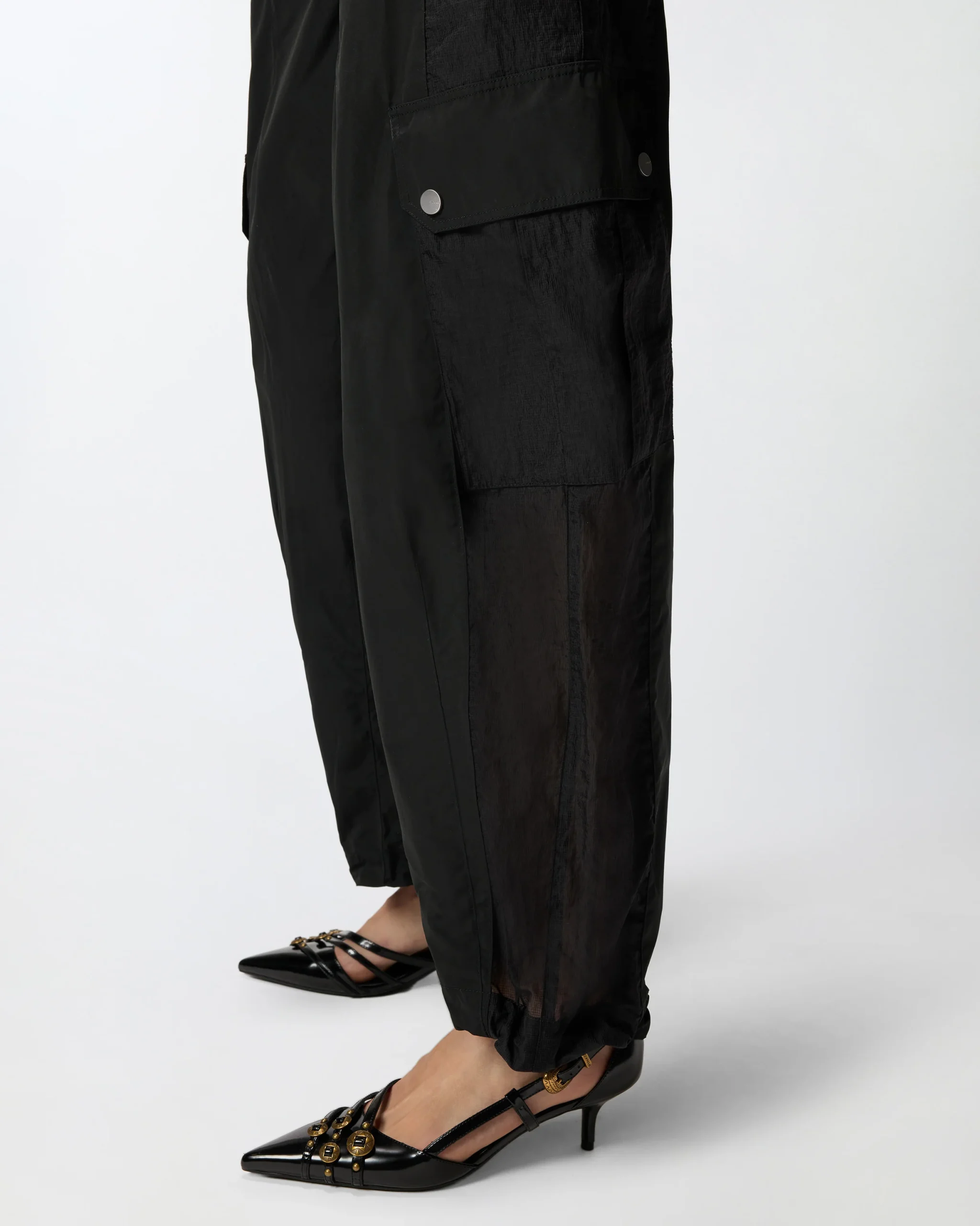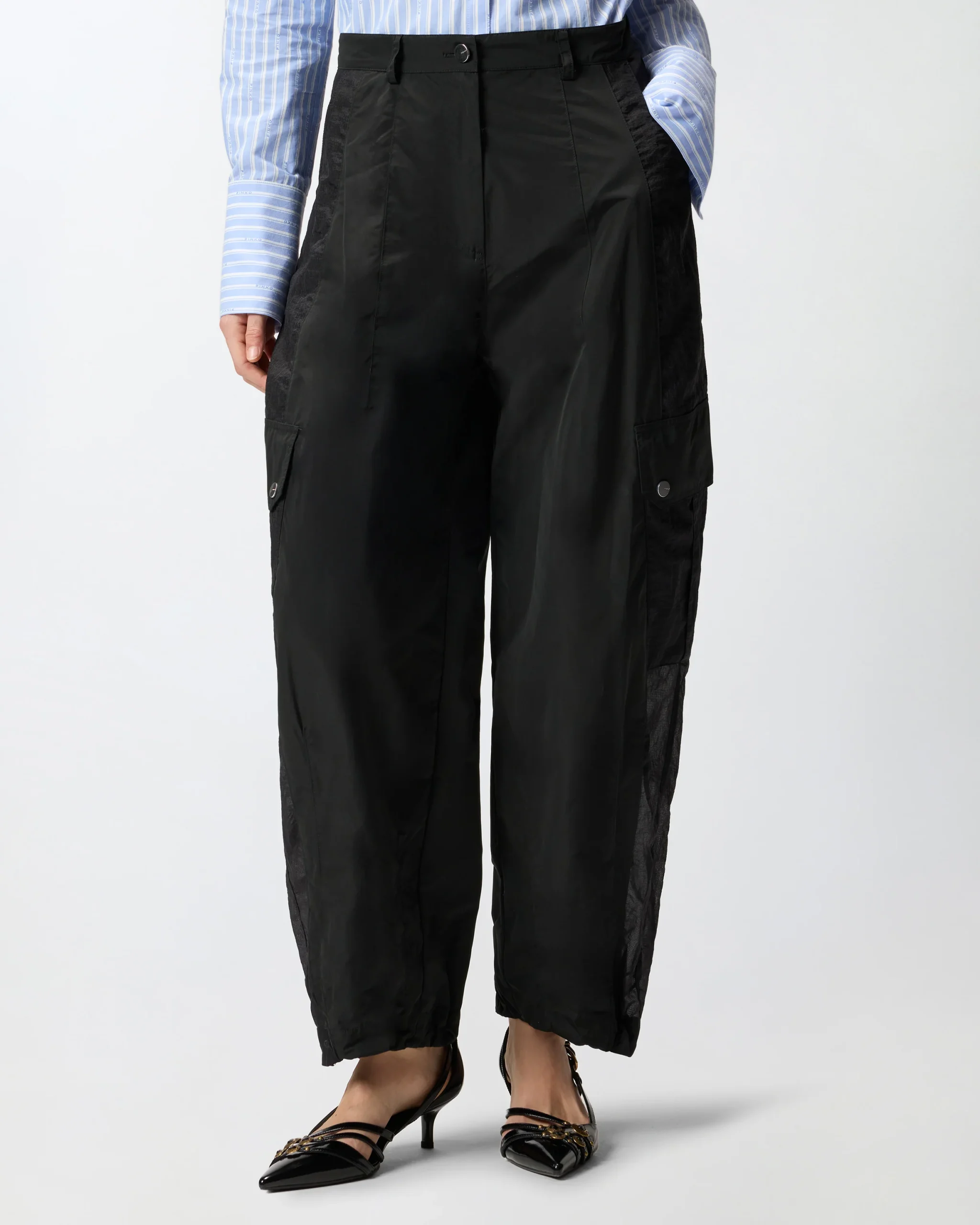Παντελόνι από τεχνικό ύφασμα με όψη ταφτά, με πλευρικά τμήματα από ripstop με υφή οργάντζας, για έναν συνδυασμό ανθεκτικότητας και διαφάνειας. Διαθέτει ρυθμιζόμενο κορδόνι στο τελείωμα στα μπατζάκια, δύο πλευρικές τσέπες, δύο εξωτερικές τσέπες πίσω και δύο τσέπες τύπου workwear με καπάκι και κουμπιά-σούστα στα μπατζάκια. Ένα ευκολοφόρετο και σύγχρονο κομμάτι, που επανερμηνεύει το streetwear με το αυθεντικό στυλ της PINKO.