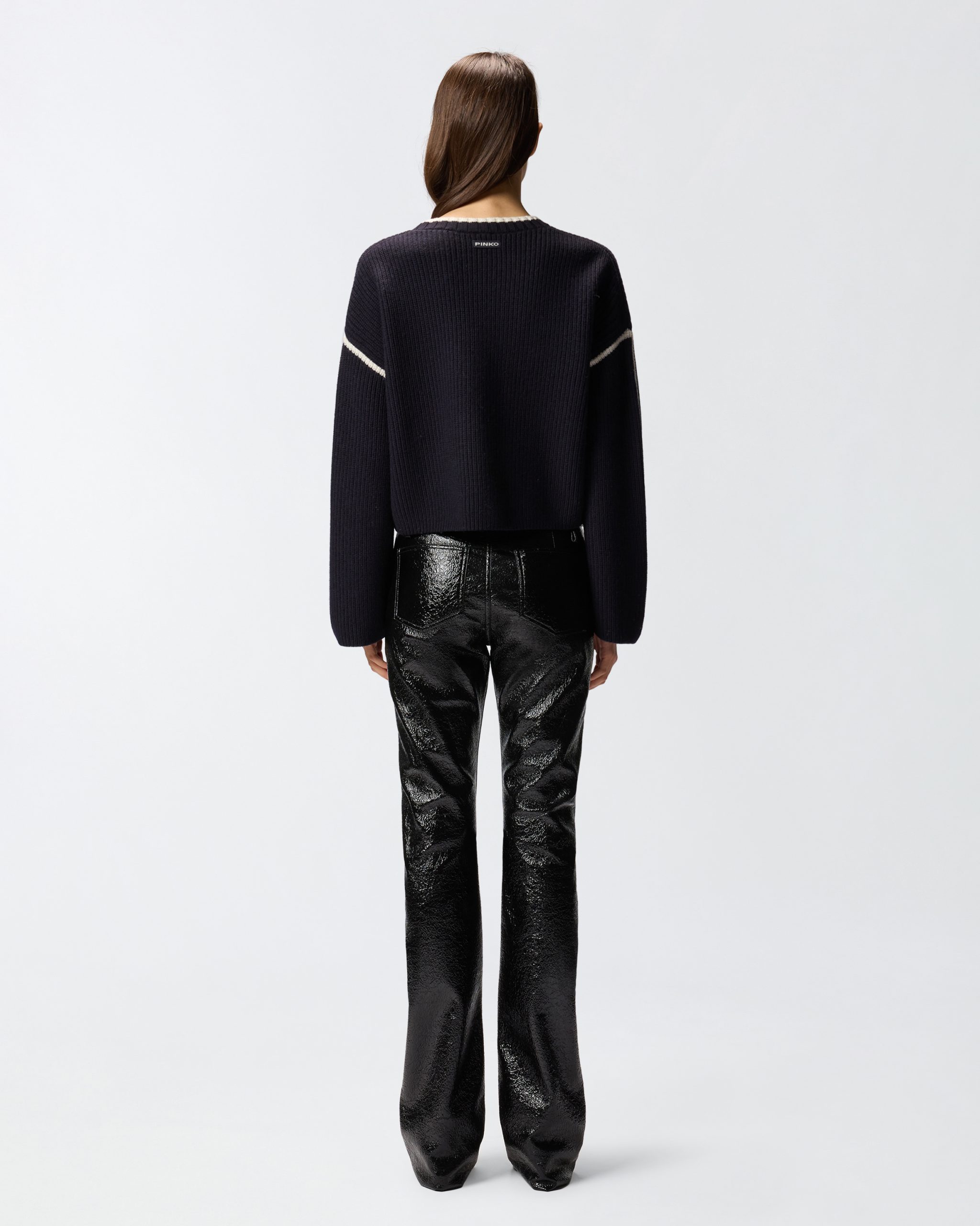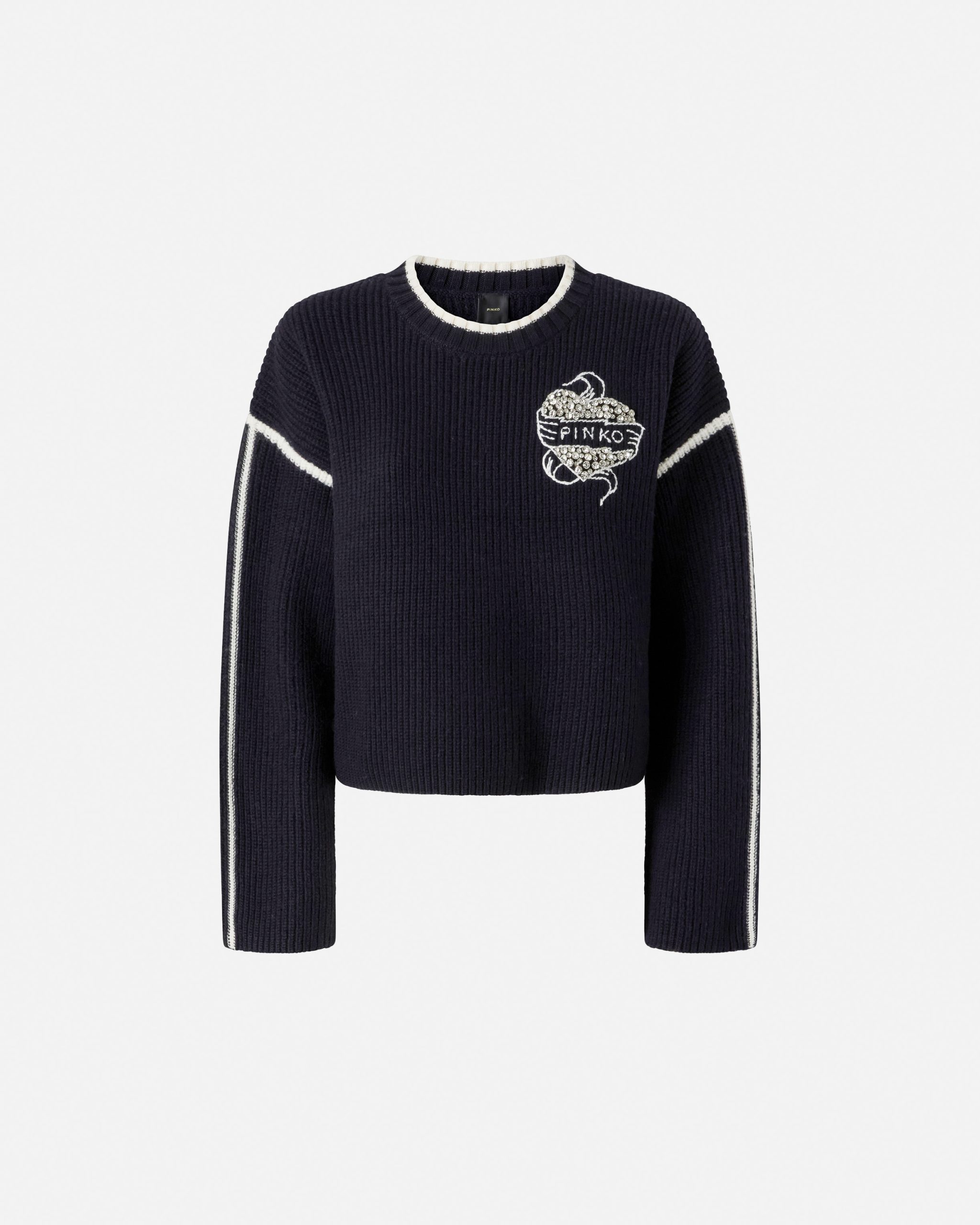 Μακρυμάνικο πουλόβερ με στρογγυλή λαιμόκοψη από μαλλί μερινός: ένα απαλό και ελαφρύ νήμα, ιδανικό για μια γκαρνταρόμπα με πρωτότυπο χαρακτήρα. Δώστε μοναδικό στυλ στο ντύσιμό σας με αυτό το πουλόβερ που είναι διακοσμημένο με το λογότυπο PINKO μέσα σε ένα κέντημα σε σχήμα καρδιάς, γεμάτο λαμπερά στρας. Το νήμα σε αντίθεση στη λαιμόκοψη, στα μανίκια και στις καβαδούρες χαρίζει ζωντάνια στο πουλόβερ, ενώ την τελική πινελιά τη δίνει η ετικέτα του ίδιου χρώματος στο πίσω μέρος της λαιμόκοψης με το λογότυπο PINKO. Το ρούχο έχει υποβληθεί σε ειδική επεξεργασία φινιρίσματος για την ελαχιστοποίηση του χνουδιάσματος, προσφέροντας μεγαλύτερη απαλότητα και ανθεκτικότητα στο ύφασμα.