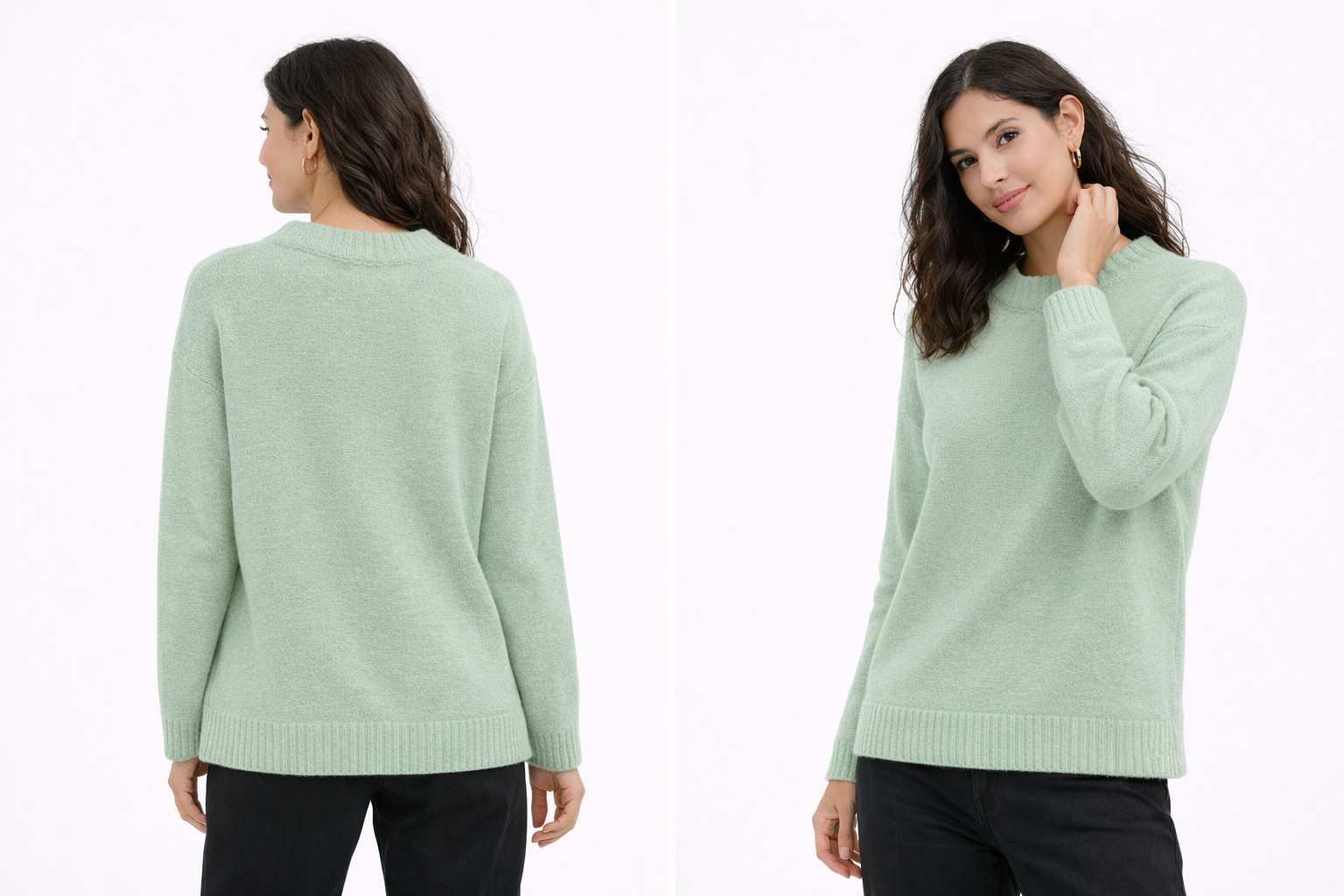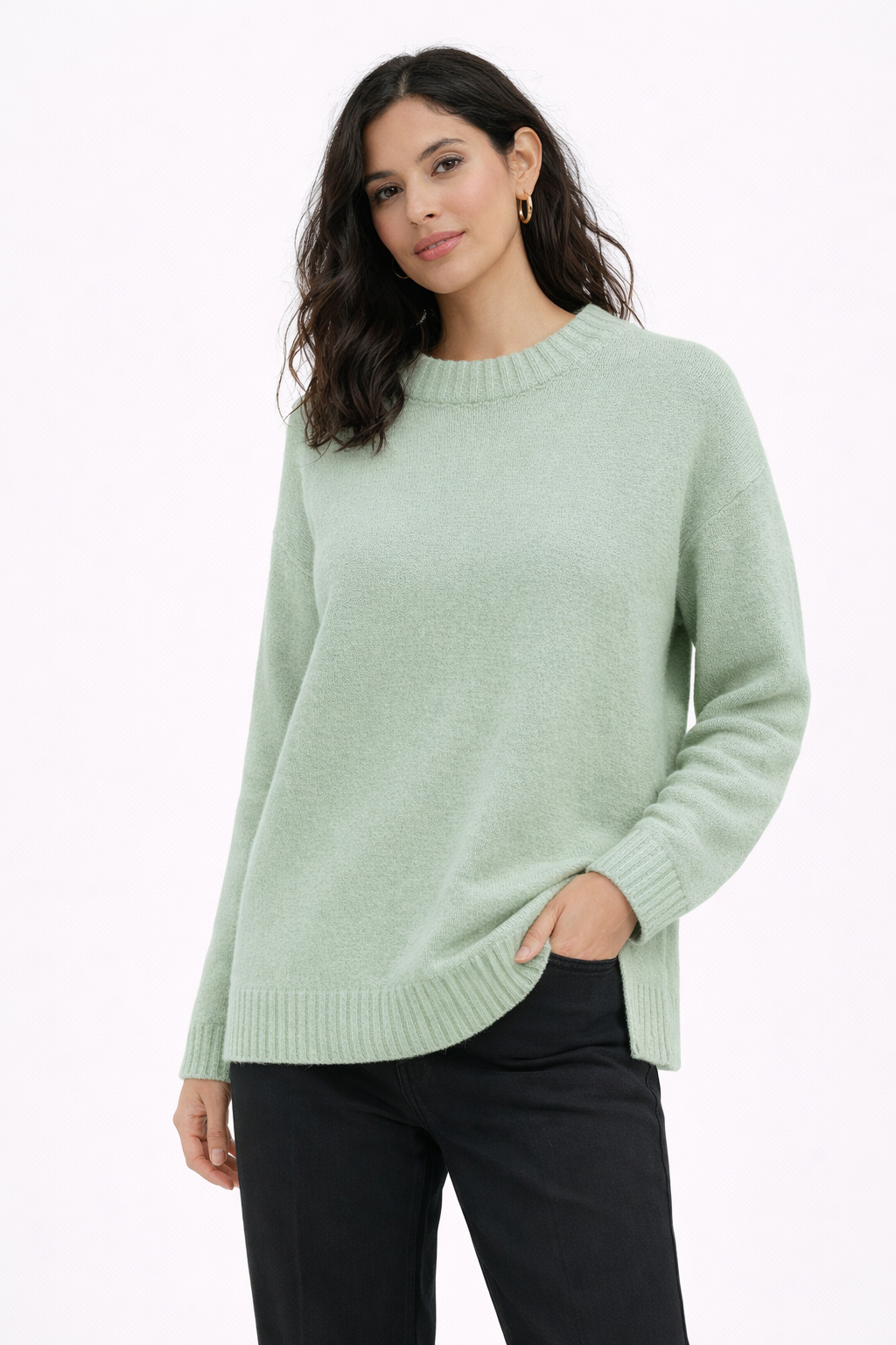 Πλεκτό πουλόβερ σε vanilla χρώμα, με άνετη γραμμή και διαχρονικό design. Διαθέτει στρογγυλή λαιμόκοψη, μακριά μανίκια και rib τελείωμα σε λαιμό, μανσέτες και στρίφωμα. Το μήκος του είναι κανονικό, αγκαλιάζει όμορφα το σώμα χωρίς να είναι μακρύ, προσφέροντας άνεση και ευκολία στο styling.
