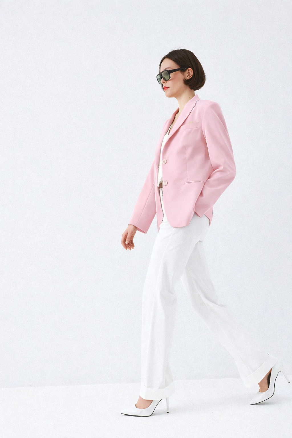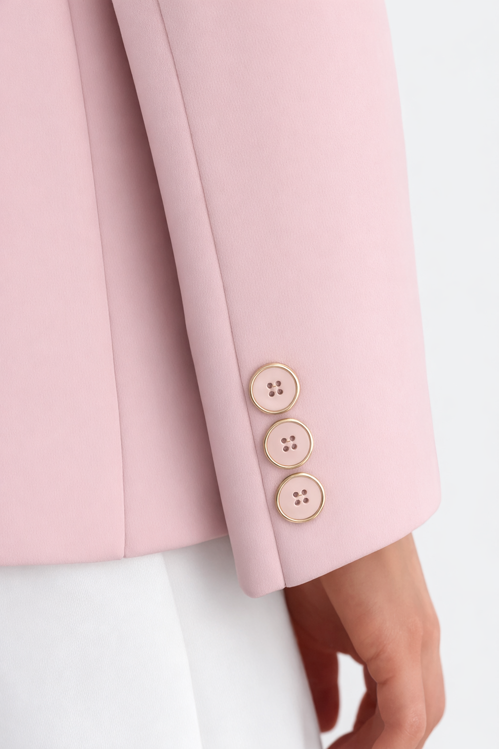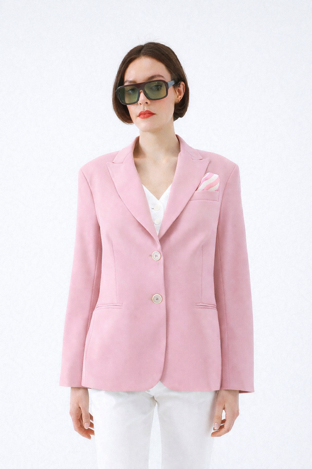 Σακάκι με πέτο γιακά και τσέπες με ρέλι μπροστά και στο πέτο. Διαθέτει αποσπώμενο ριγέ μαντήλι στο πέτο, βάτες στους ώμους και κλείσιμο με κουμπιά μπροστά.