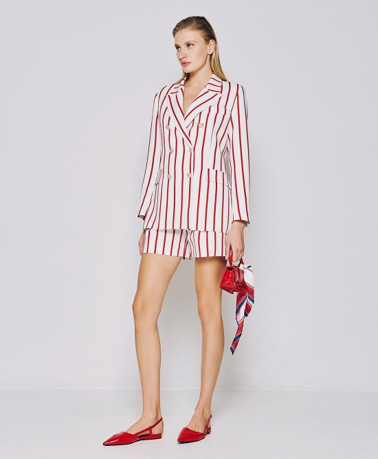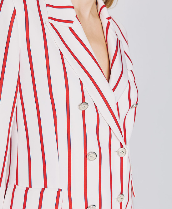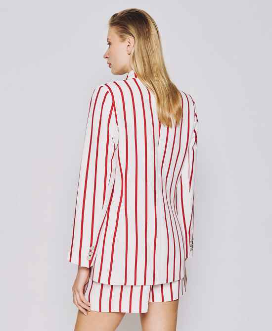 Σταυρωτό σακάκι με ιδιαίτερο ριγέ μοτίβο και μεταλλικά κουμπιά. Διαθέτει βάτες στους ώμους και τσέπες με καπάκι μπροστά. Συνδυάστε με το αντίστοιχο παντελόνι από τη συλλογή μας για κομψές εμφανίσεις.