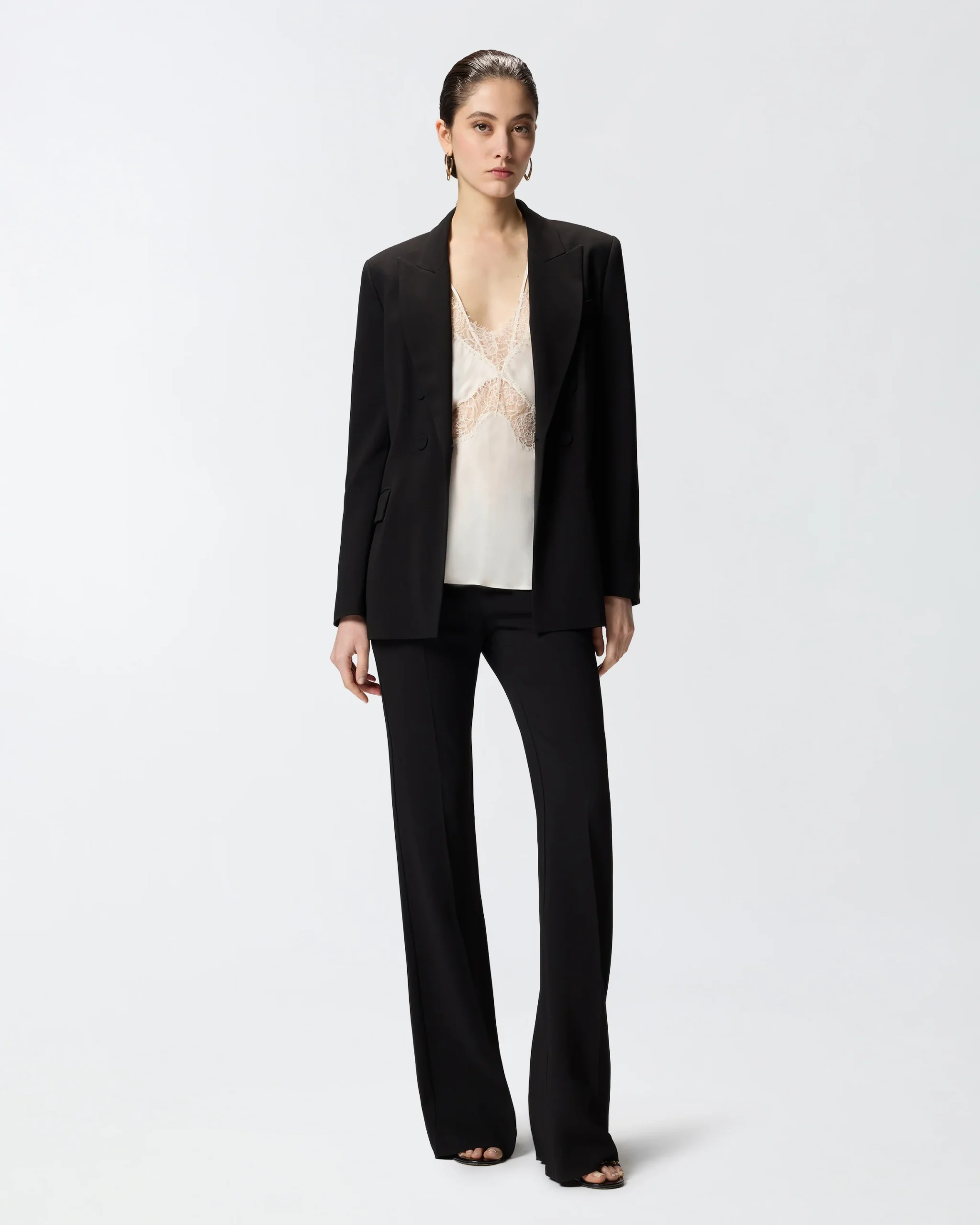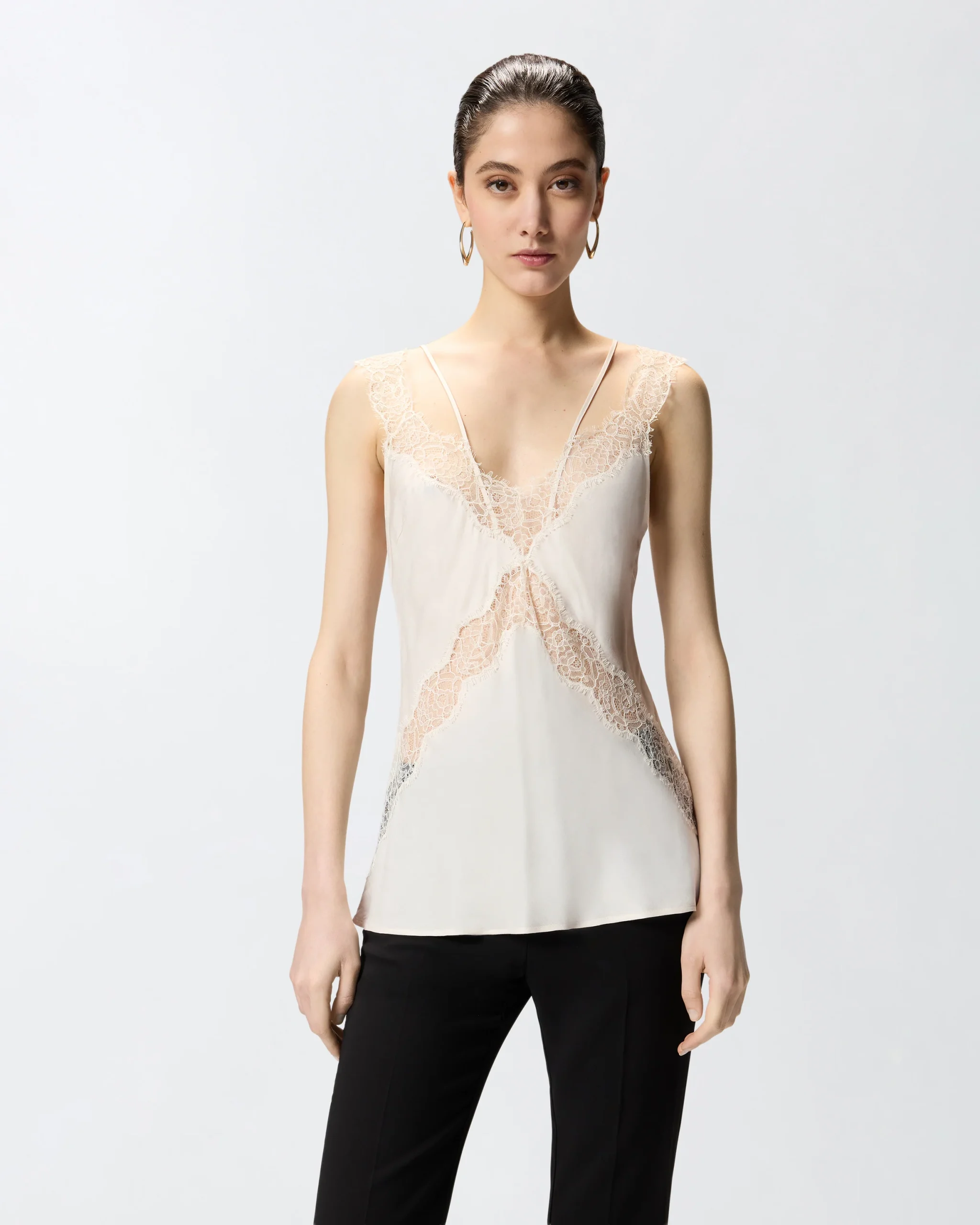 Αμάνικο τοπ σε στυλ lingerie κατασκευασμένο από σερζέ ύφασμα με χυτή υφή. Διαθέτει λεπτές τιράντες από το ίδιο ύφασμα και είναι διακοσμημένο με λωρίδες από δαντέλα μπροστά, στο ντεκολτέ V και στις πιο χοντρές τιράντες. Αναβαθμίστε την κομψότητα και τη θηλυκότητα κάθε συνόλου με αυτό το τοπ, που είναι τέλειο κάτω από ένα σακάκι σε συνδυασμό με ένα κλασικό παντελόνι, αλλά και με ένα ιδιαίτερο τζιν.