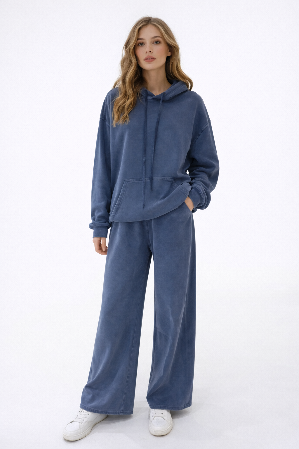 Το Blue Serenity Set αποτελείται από oversized φούτερ με κουκούλα και wide-leg παντελόνα, σε μοναδική washed απόχρωση μπλε που δίνει premium χαρακτήρα στο look.