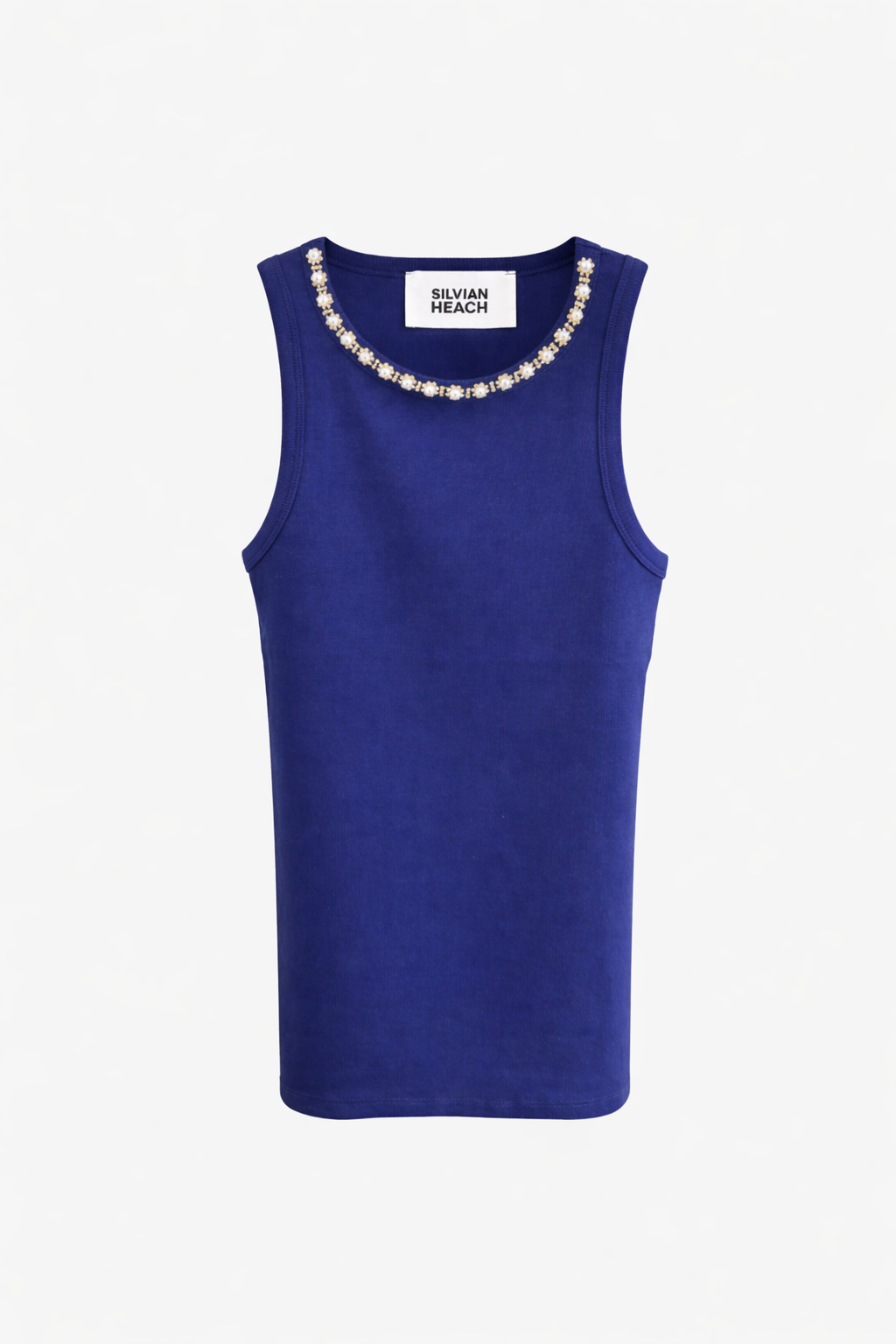 Γυναικείο αμάνικο top Silvian Heach σε κομψή μπλε απόχρωση, κατασκευασμένο από ελαστικό rib ύφασμα που αγκαλιάζει το σώμα και προσφέρει άνετη εφαρμογή. Ξεχωρίζει χάρη στη διακοσμητική λεπτομέρεια με στρας στο λαιμό, που χαρίζει μία διακριτική λάμψη και αναβαθμίζει το basic σχέδιο.