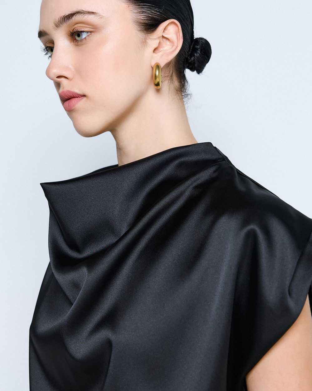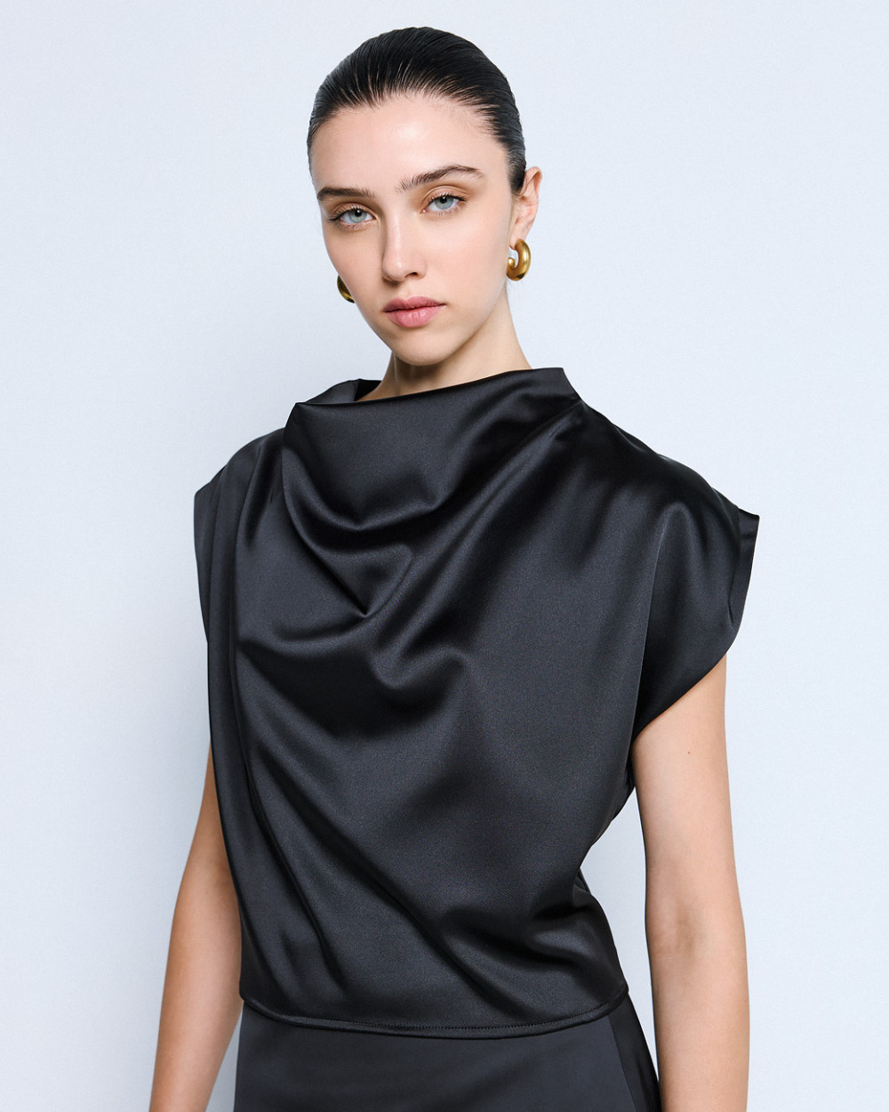 Τοπ αμάνικο σατέν με ντραπέ λαιμόκοψη. Αποτελεί απαραίτητη επιλογή για κάθε κομψή γκαρνταρόμπα.