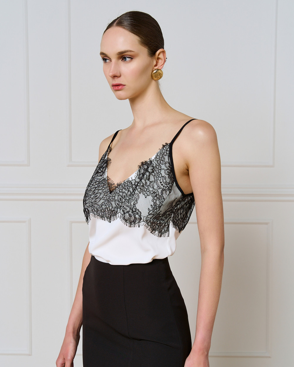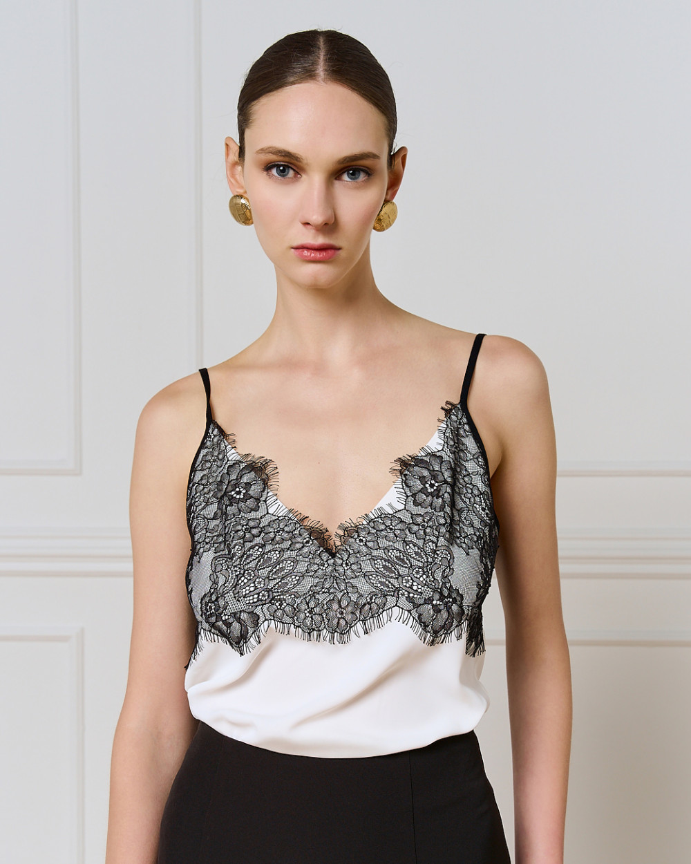 Τοπ με V λαιμόκοψη, λεπτές ρυθμιζόμενες τιράντες και λεπτομέρειες από δαντέλα. Αποτελεί ιδανική επιλογή για κομψές και ρομαντικές εμφανίσεις.