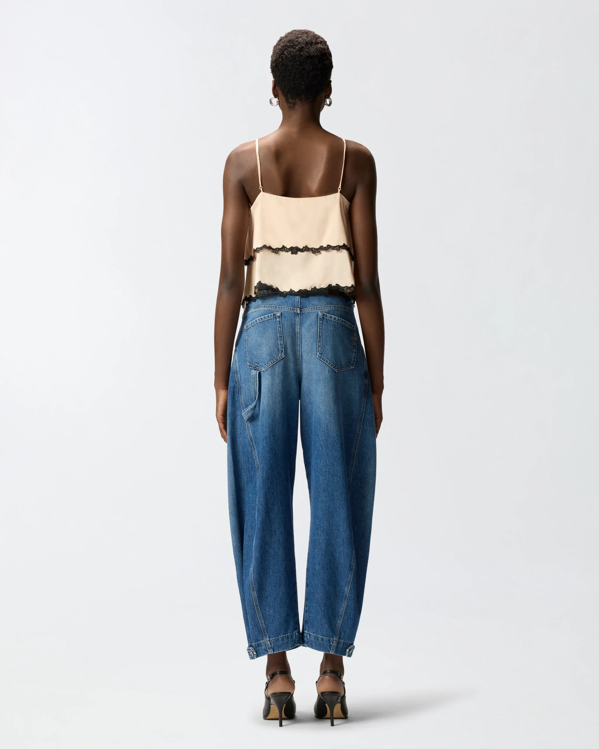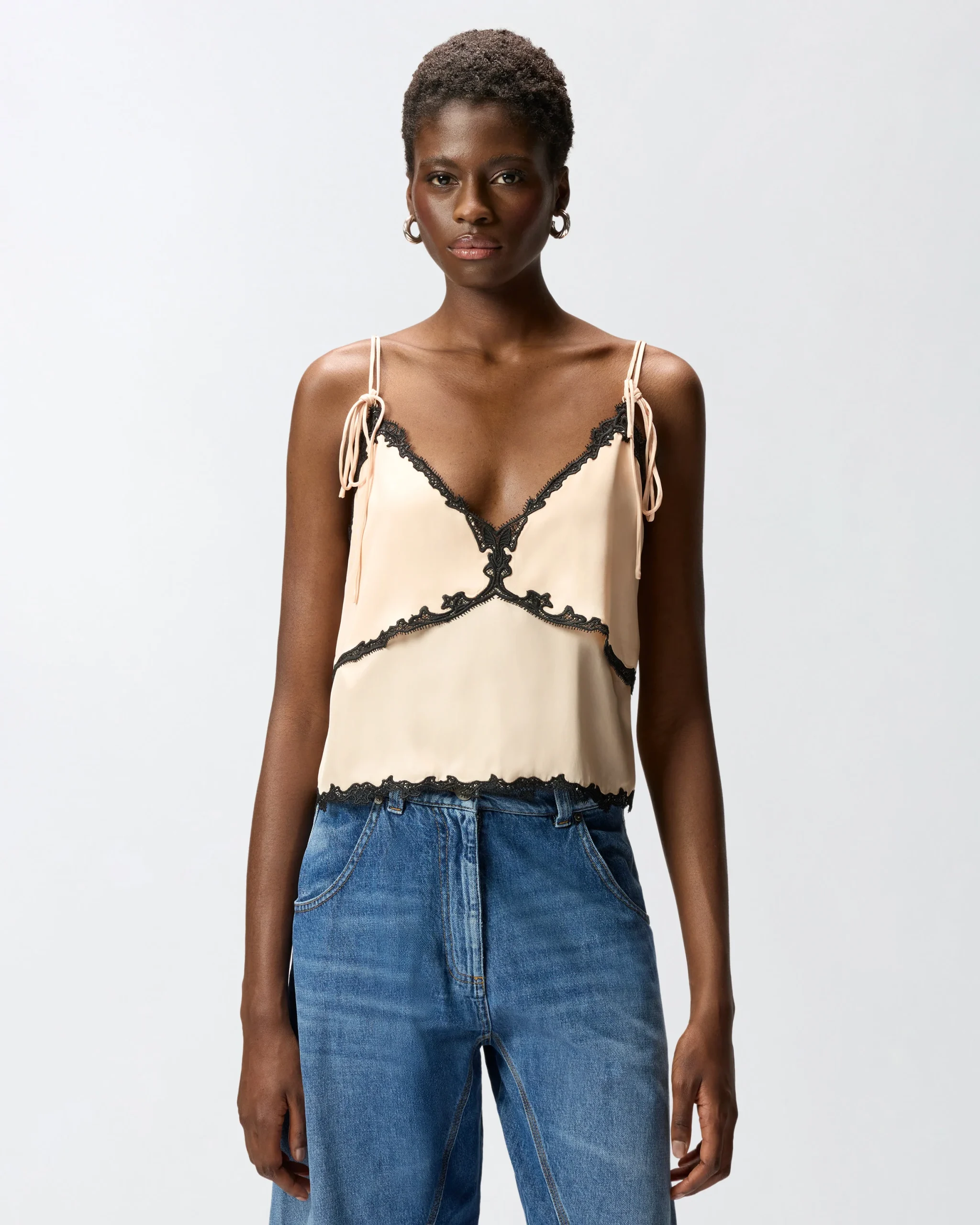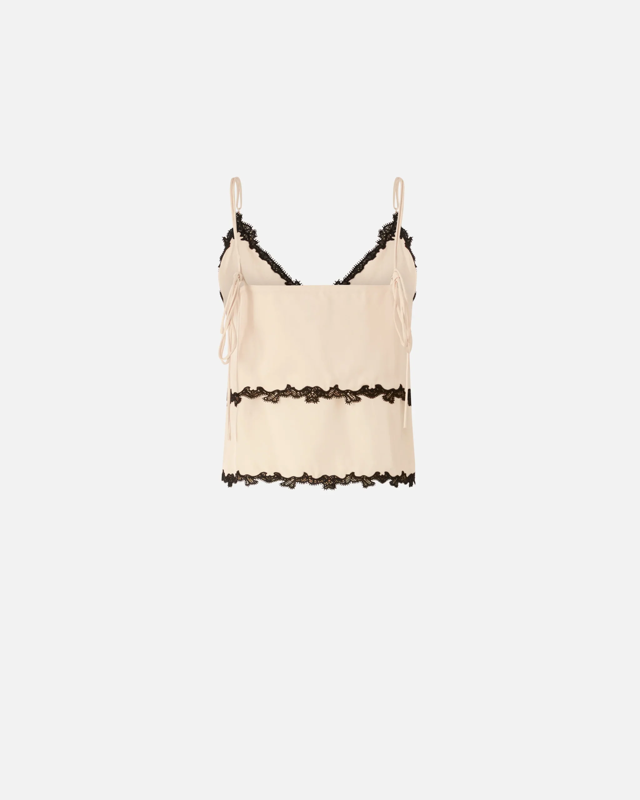Κοντό τοπ από σερζέ ύφασμα με χυτή υφή με ντεκολτέ V μπροστά, ίσια λαιμόκοψη πίσω και μακριές, λεπτές τιράντες που δένονται και ρυθμίζονται όπως θέλετε. Το τοπ είναι διακοσμημένο με σαγηνευτικές λεπτομέρειες με το αυθεντικό στυλ της PINKO: τμήματα από κεντημένη δαντέλα, εμπνευσμένη από τη lingerie αισθητική, που πλαισιώνουν το ντεκολτέ μπροστά, τη μέση και το τελείωμα στο κάτω μέρος.