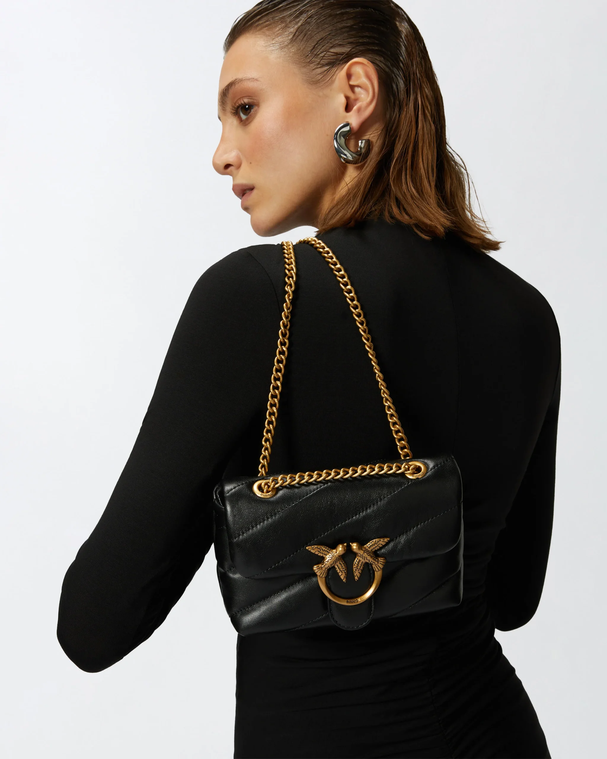 Τσάντα Baby Love Bag Puff από μαλακό δέρμα nappa με maxi, λοξό καπιτονέ σχέδιο. Το κλείσιμο ολοκληρώνεται με την εμβληματική μεταλλική αγκράφα Love Birds Diamond Cut. Το εσωτερικό είναι φοδραρισμένο με ύφασμα από μικροΐνες με σουέτ υφή και περιλαμβάνει τσέπη στο τοίχωμα που κλείνει με φερμουάρ. Διαθέτει λεπτό λουρί από μεταλλική αλυσίδα.