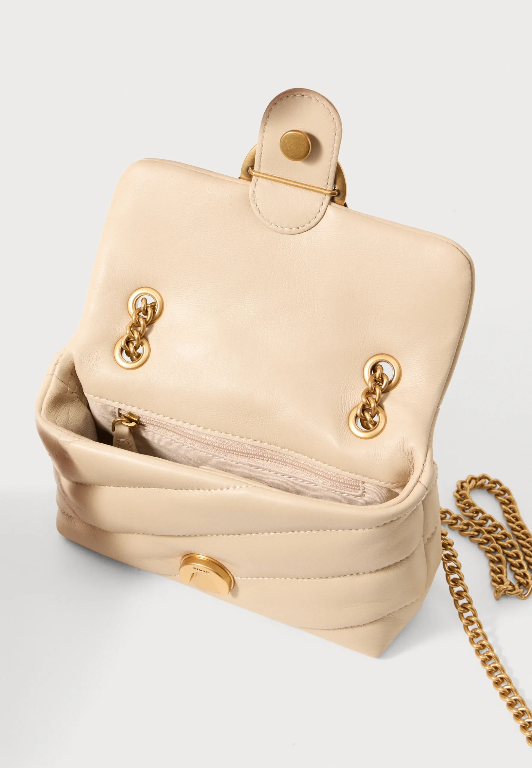 Τσάντα Baby Love Bag Puff από μαλακό δέρμα nappa με maxi, λοξό καπιτονέ σχέδιο. Το κλείσιμο ολοκληρώνεται με την εμβληματική μεταλλική αγκράφα Love Birds Diamond Cut. Το εσωτερικό είναι φοδραρισμένο με ύφασμα από μικροΐνες με σουέτ υφή και περιλαμβάνει τσέπη στο τοίχωμα που κλείνει με φερμουάρ. Διαθέτει λεπτό λουρί από μεταλλική αλυσίδα.
