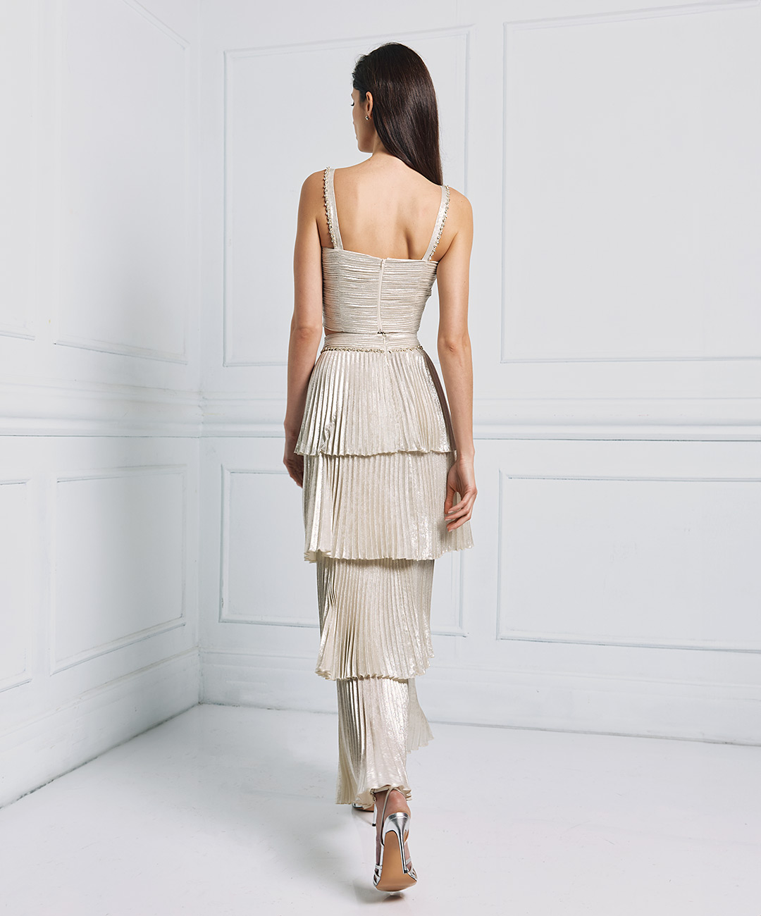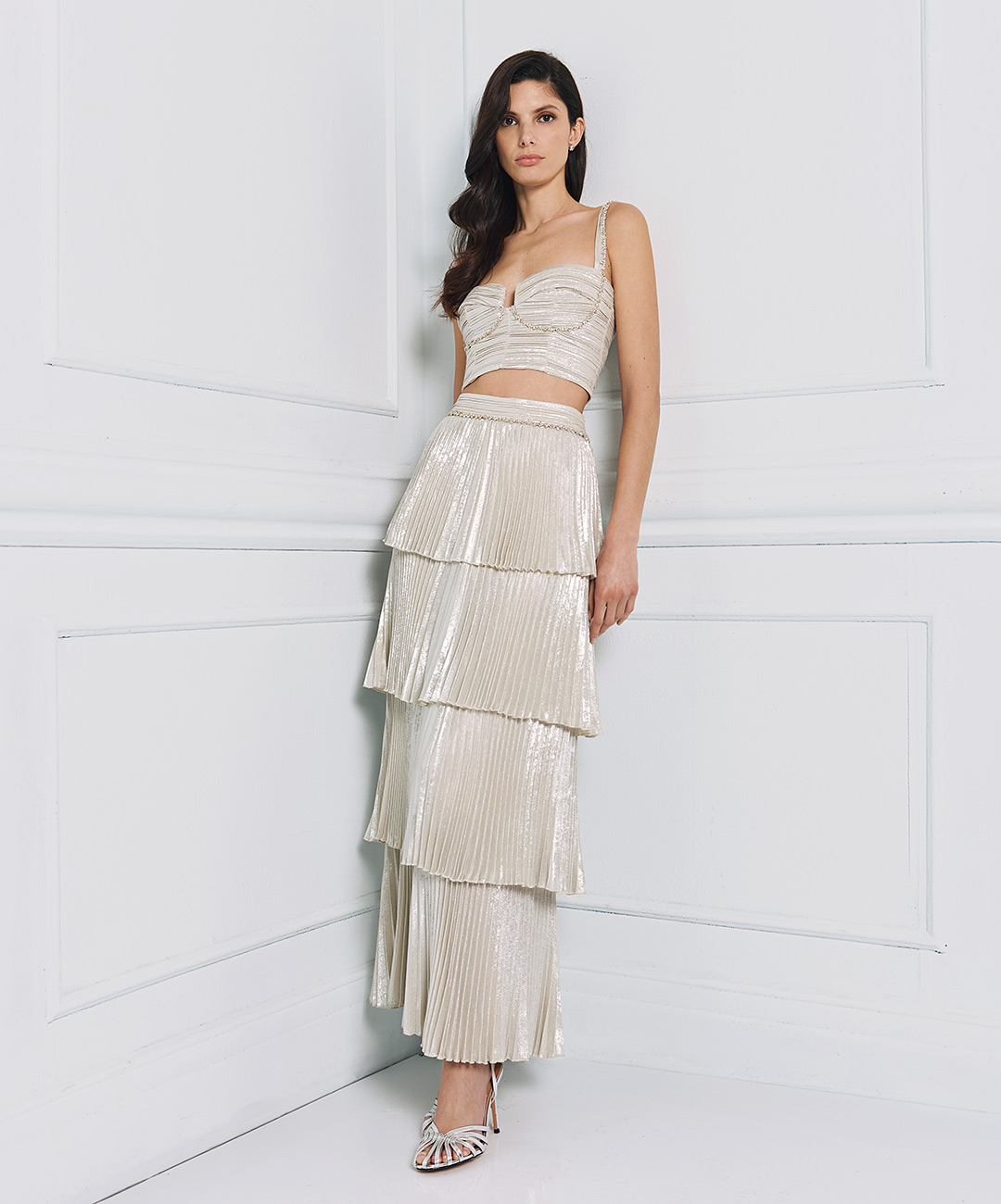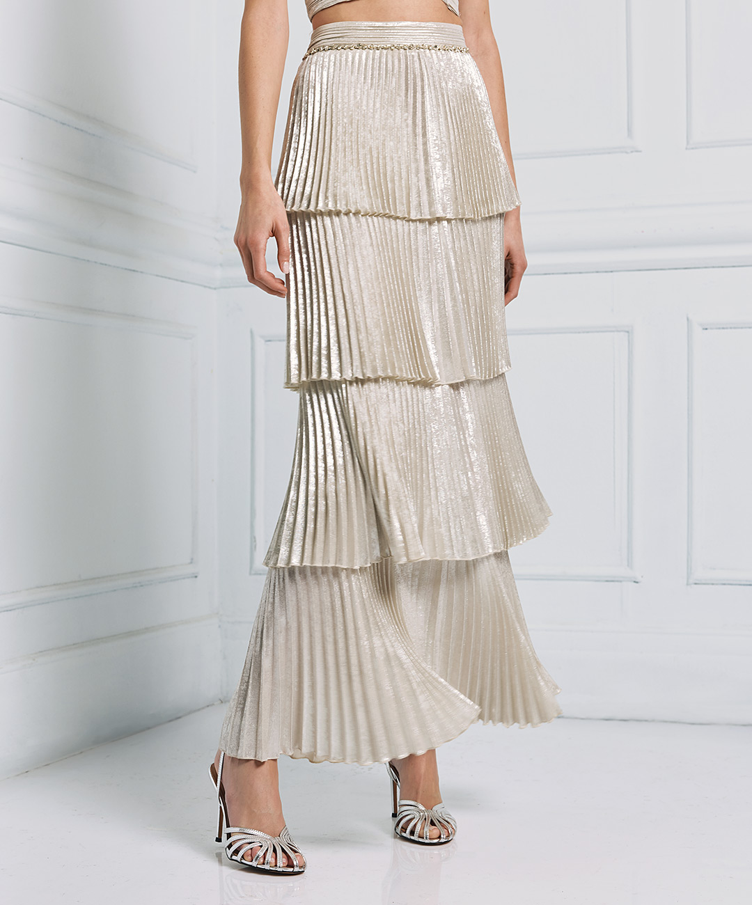 Φούστα πλισέ μεταλιζέ με βολάν