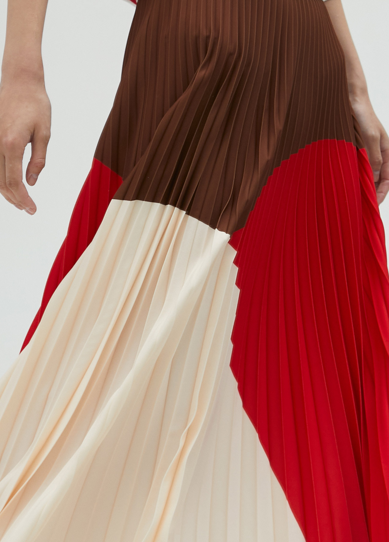 Η πλισέ υφή δημιουργεί ανάλαφρη ροή, ενώ ο δυναμικός συνδυασμός χρωμάτων σε colourblock σχέδιο δίνει μοντέρνο, fashion-forward χαρακτήρα. Το μήκος midi την καθιστά κομψή και ευέλικτη, ιδανική για καθημερινά αλλά και πιο προσεγμένα looks.