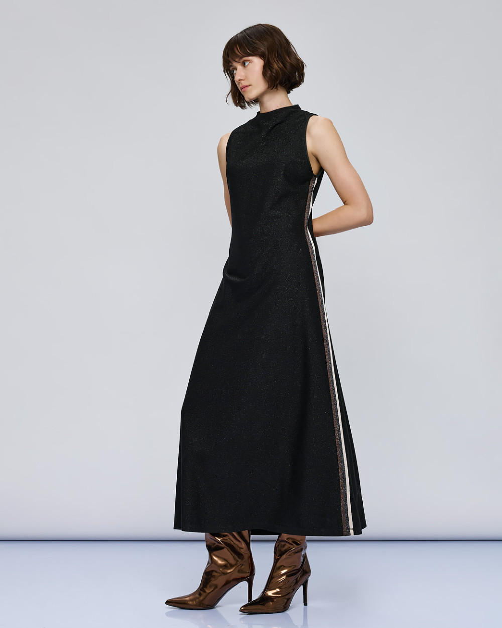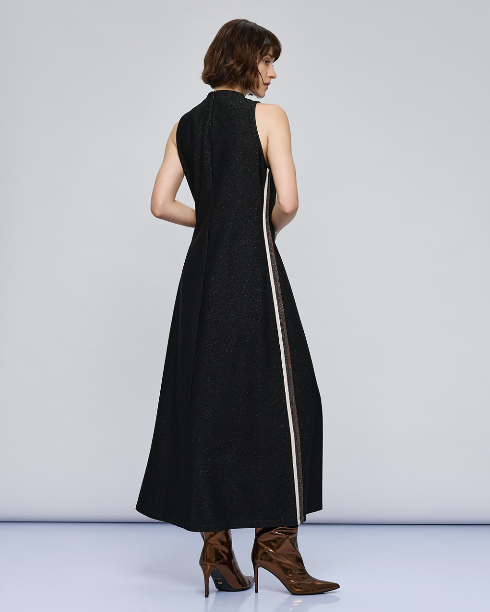 Μακρύ αμάνικο lurex φόρεμα με ριγέ φάσα στα πλαϊνά. Διαθέτει στρογγυλή λαιμόκοψη και κλείνει με φερμουάρ πίσω. Επιλέξτε το για κομψές και εντυπωσιακές εμφανίσεις.